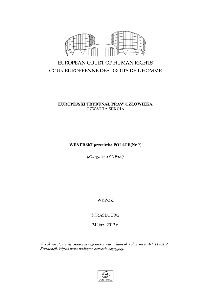 EUROPEJSKI TRYBUNAŁ PRAW CZŁOWIEKA CZWARTA SEKCJA WENERSKI przeciwko POLSCE(Nr 2) (Skarga nr 38719/09) WYROK STRASBOURG 24 lipca 2012 r. Wyrok ten stanie się ostateczny zgodnie z warunkami określonymi w Art. 44 ust. 2 Konwencji. Wyrok może podlegać korekcie edycyjnej. 2 WYROK W SPRAWIE WENERSKI PRZECIWKO POLSCE (NR 2) W sprawie Wenerski przeciwko, Polsce Europejski Trybunał Praw Człowieka (Czwarta Sekcja), zasiadając jako Izba składająca się z następujących sędziów: David Thór Björgvinsson, Przewodniczący, Lech Garlicki, Päivi Hirvelä, George Nicolaou, Zdravka Kalaydjieva, Nebojša Vučinić, Vincent A. De Gaetano, sędziowie, oraz Fatoş Aracı, Główny Kanclerz Sekcji, Obradując na posiedzeniu zamkniętym w dniu 3 lipca 2012 r., Wydaje następujący wyrok, który został przyjęty w tym dniu: POSTĘPOWANIE 1. Sprawa wywodzi się ze skargi (nr 38719/09) przeciwko Rzeczypospolitej Polskiej wniesionej do Trybunału na podstawie art. 34 Konwencji o Ochronie Praw Człowieka i Podstawowych Wolności („Konwencja") przez obywatela polskiego, pana Ernesta Wenerskiego („skarżący”) z dnia 16 czerwca 2009 r. 2. Skarżący, któremu przyznano pomoc prawną, był reprezentowany przez pana L. Korpeckiego, adwokata praktykującego w Łodzi. Polski Rząd („Rząd”) reprezentowany był przez swojego pełnomocnika, pana Jakuba Wołąsiewicza z Ministerstwa Spraw Zagranicznych. 3. Skarżący zarzucił przede wszystkim naruszenie Artykułu 3 Konwencji ze względu na nieodpowiednie warunki odbywania kary pozbawienia wolności, w szczególności na zjawisko przeludnienia. 4. W dniu 6 grudnia 2010 roku Trybunał zdecydował o zakomunikowaniu skargi Rządowi. Zdecydowano także o określeniu dopuszczalności i meritum skargi (art. 29 ust. 1 Konwencji). FAKTY I. OKOLICZNOŚCI SPRAWY 5. Skarżący urodził się w 1970 roku i mieszka w Kluczborku. WYROK W SPRAWIE WENERSKI PRZECIWKO POLSCE (NR 2) 3 A. Tło 6. Skarżący ma bogatą kartotekę kryminalną. Był on zatrzymywany kilka razy od 1997 roku. 7. Bieżąca skarga dotyczy osadzenia w Areszcie Śledczym w Łodzi podczas następujących okresów czasu: (1) od 1 września 2004 roku do 10 marca 2005 roku, (2) od 20 maja do 30 listopada 2005 roku, (3) od 14 grudnia 2005 roku do 19 stycznia 2007 roku, (4) od 5 lutego do 22 lipca 2007 roku i (5) od 8 stycznia 2009 roku do nieokreślonej daty w czerwcu 2010 roku. 8. Wygląda na to, że skarżący pozostawał w areszcie od 1 września 2004 roku, najpierw w Areszcie Śledczym w Łodzi, a następnie w innych ośrodkach penitencjarnych. Zaraz przed 1 września 2004 roku był zatrzymany w Areszcie Śledczym w Chełmie, a w nieokreślonej dacie w czerwcu 2010 roku został przeniesiony do więzienia w Kluczborku. 9. Skarżący cierpi na epilepsję i ma regularne ataki. Zostało u niego zdiagnozowane także zaburzenie osobowości. B. Zalecenia ekspertów skarżącego medycznych dotyczące zatrzymania 10. Zasięgnięto trzech opinii na temat zdrowia skarżącego od ekspertów w dziedzinie neurologii, psychiatrii i psychologii w trakcie postępowania cywilnego przed sądem I instancji (zobacz paragraf 28 poniżej). Sądy krajowe zwróciły się o opinię ekspertów, aby określić czy warunki zatrzymania były dla niego odpowiednie, czy też wymagał on stworzenia specjalnych warunków w Areszcie Śledczym. 11. Pierwsza opinia została przygotowana 2 października 2006 roku przez dr G.B., biegłego w dziedzinie neurologii. Stwierdzono w niej, że epilepsja skarżącego nie wymagała sama w sobie stworzenia mu specjalnych warunków Areszcie Śledczym. W odniesieniu do standardów miejsca, osadzenie w wieloosobowej celi nie miało negatywnych skutków w przypadku choroby skarżącego. Jednakże biegły zalecił przydzielenie skarżącemu dolnej pryczy w nieprzeludnionej celi. 12. Druga opinia została przygotowana 9 sierpnia 2008 roku przez dr M.B., eksperta w dziedzinie psychiatrii. Ekspert stwierdził, że skarżący cierpi na średnie zaburzenie osobowości i czasami doświadcza chwiejnego nastroju. Osadzenie w zwykłych warunkach więziennych nie pogorszyłoby stanu skarżącego. 13. Trzecia opinia została przygotowana 21 kwietnia 2009 roku przez dr L.S., biegłego w dziedzinie psychologii. Ekspert stwierdził, że skarżący cierpi na zaburzenia osobowości z rosnącą tendencją do wybuchów emocjonalnych, które przejawiały się poprzez samookaleczenie. Ekspert doszedł do wniosku, iż zaburzenia osobowości skarżącego rozwinęły się we 4 WYROK W SPRAWIE WENERSKI PRZECIWKO POLSCE (NR 2) wczesnych latach jego życia i nie było to zależne od przeludnienia i trudnych warunków osadzenia. C. Przypadek choroby skarżącego i opieka medyczna dostarczana mu w Areszcie Śledczym w Łodzi 14. Jak ustalono przez krajowe sądy, podczas pierwszych czterech okresów zatrzymania w Areszcie Śledczym w Łodzi, skarżący doznał kilku ataków epilepsji. Ataki często skutkowały niewielkimi obrażeniami na twarzy i ranami na ciele, takimi jak rozcięte usta, siniaki, otarcia skóry, guzy na głowie. W jednym przypadku skarżący zagryzł swój język, w innym zaś rozciął sobie głowę o róg łóżka. 15. Stwierdzono także, iż podczas ataków epilepsji skarżący otrzymywał pierwszą pomoc od swoich współwięźniów. W przypadku ataków w ciągu dnia skarżącemu udzielał pomocy lekarz, natomiast w nocy i w czasie świąt wzywano karetkę pogotowia. 16. Skarżący przedstawił kopie pięciu raportów z przyjazdu karetek pogotowia do Aresztu Śledczego po każdym ataku epilepsji ( 24 kwietnia, 2, 12 i 19 maja i 16 czerwca 2005 roku). 17. Podczas pierwszych czterech okresów zatrzymania, skarżący nie otrzymał pomocy medycznej przynajmniej w dwóch przypadkach ataków epilepsji. W nieokreślonej dacie w marcu 2007 roku, strażnik polecił współwięźniom z celi skarżącego przewrócić go na bok i włożyć mu coś do ust. Podobnie, gdy skarżący został osadzony w celi nr 149 w blo