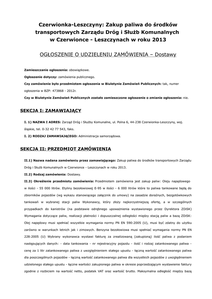 Czerwionka-Leszczyny: Zakup paliwa do środków transportowych Zarządu Dróg i Służb Komunalnych w Czerwionce - Leszczynach w roku 2013 OGŁOSZENIE O UDZIELENIU ZAMÓWIENIA – Dostawy Zamieszczanie ogłoszenia: obowiązkowe. Ogłoszenie dotyczy: zamówienia publicznego. Czy zamówienie było przedmiotem ogłoszenia w Biuletynie Zamówień Publicznych: tak, numer ogłoszenia w BZP: 473868 - 2012r. Czy w Biuletynie Zamówień Publicznych zostało zamieszczone ogłoszenie o zmianie ogłoszenia: nie. SEKCJA I: ZAMAWIAJĄCY I. 1) NAZWA I ADRES: Zarząd Dróg i Służby Komunalne, ul. Polna 6, 44-238 Czerwionka-Leszczyny, woj. śląskie, tel. 0-32 42 77 543, faks. I. 2) RODZAJ ZAMAWIAJĄCEGO: Administracja samorządowa. SEKCJA II: PRZEDMIOT ZAMÓWIENIA II.1) Nazwa nadana zamówieniu przez zamawiającego: Zakup paliwa do środków transportowych Zarządu Dróg i Służb Komunalnych w Czerwionce - Leszczynach w roku 2013. II.2) Rodzaj zamówienia: Dostawy. II.3) Określenie przedmiotu zamówienia: Przedmiotem zamówienia jest zakup paliw: Oleju napędowego w ilości - 55 000 litrów. Etyliny bezołowiowej E-95 w ilości - 6 000 litrów które to paliwa tankowane będą do zbiorników pojazdów (wg wykazu stanowiącego załącznik do umowy) na zasadzie doraźnych, bezgotówkowych tankowań w wybranej stacji paliw Wykonawcy, który złoży najkorzystniejszą ofertę, a w szczególnych przypadkach do kanistrów (na podstawie odrębnego upoważnienia wystawionego przez Dyrektora ZDiSK) Wymagania dotyczące paliw, realizacji płatności i dopuszczalnej odległości między stacją paliw a bazą ZDiSK: Olej napędowy musi spełniać wszystkie wymagania normy PN EN 590:2005 (U), musi być zdatny do użytku zarówno w warunkach letnich jak i zimowych. Benzyna bezołowiowa musi spełniać wymagania normy PN EN 228:2005 (U) Wybrany wykonawca wystawi fakturę za zrealizowaną (zakupioną) ilość paliwa z podaniem następujących danych: - data tankowania - nr rejestracyjny pojazdu - ilość i rodzaj zatankowanego paliwa cenę za 1 litr zatankowanego paliwa z uwzględnieniem stałego upustu - łączną wartość zatankowanego paliwa dla poszczególnych pojazdów - łączną wartość zatankowanego paliwa dla wszystkich pojazdów z uwzględnieniem udzielonego stałego upustu - łączne wartości zakupionego paliwa w okresie poprzedzającym wystawienie faktury zgodnie z rozbiciem na wartość netto, podatek VAT oraz wartość brutto. Maksymalna odległość między bazą ZDiSK a stacją paliw ze względów ekonomicznych nie może być większa niż 5 km uwzględniając istniejące oznakowanie pionowe ograniczające dopuszczalną rzeczywistą masę całkowitą pojazdów poruszających się po danej trasie dojazdu. Kierowca po zatankowaniu na stacji paliw otrzyma potwierdzenie, które zawierać będzie następujące informacje: - ilość i wartość zatankowanego paliwa, - datę tankowania, - numer rejestracyjny samochodu, - cenę jednostkową paliwa z uwzględnieniem stałego upustu, - podpis kierowcy tankującego pojazd. Ilość wydawanego paliwa musi być potwierdzona wpisem do kart drogowych i raportów pracy sprzętu na stacji gdzie dokonano tankowania. Faktury za transakcje bezgotówkowe wystawiane będą nie częściej niż 2 razy w miesiącu. ( za okres od 01 do 15 dnia danego miesiąca oraz od 16 do ostatniego dnia danego miesiąca). W trakcie obowiązywania umowy cenę 1 litra paliwa ustala się w wysokości obowiązującej w dniu zakupu , według cen detalicznych obowiązujących na stacji benzynowej Wykonawcy (wyświetlonych na dystrybutorze). II.4) Wspólny Słownik Zamówień (CPV): 09.13.41.00-8, 09.13.21.00-4. SEKCJA III: PROCEDURA III.1) TRYB UDZIELENIA ZAMÓWIENIA: Przetarg nieograniczony III.2) INFORMACJE ADMINISTRACYJNE •Zamówienie dotyczy projektu/programu finansowanego ze środków Unii Europejskiej: nie SEKCJA IV: UDZIELENIE ZAMÓWIENIA IV.1) DATA UDZIELENIA ZAMÓWIENIA: 21.12.2012. IV.2) LICZBA OTRZYMANYCH OFERT: 2. IV.3) LICZBA ODRZUCONYCH OFERT: . IV.4) NAZWA I ADRES WYKONAWCY, KTÓREMU UDZIELONO ZAMÓWIENIA: •SPEC-OIL Spółka Jawna Cz. Kowalski, J. Noga, R. Kowalski, ul. Węglowa 18, 44-240 Żory, kraj/woj. śląskie. IV.5) Szacunkowa wartość zamówienia (bez VAT): 276570,00 PLN. IV.6) INFORMACJA O CENIE WYBRANEJ OFERTY ORAZ O OFERTACH Z NAJNIŻSZĄ I NAJWYŻSZĄ CENĄ •Cena wybranej oferty: 329770,00 •Oferta z najniższą ceną: 329770,00 / Oferta z najwyższą ceną: 331480,00 •Waluta: PLN. Niniejsze ogłoszenie o udzieleniu zamówienia zostało zamieszczone w Biuletynie Zamówień Publicznych w dniu 21.12.2012 r.