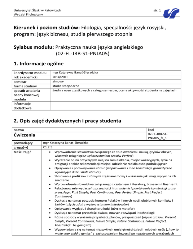 Uniwersytet Śląski w Katowicach Wydział Filologiczny str. 1 Kierunek i poziom studiów: Filologia, specjalność: język rosyjski, program: język biznesu, studia pierwszego stopnia Sylabus modułu: Praktyczna nauka języka angielskiego (02-FL-JRB-S1-PNJA05) 1. Informacje ogólne koordynator modułu rok akademicki semestr forma studiów sposób ustalania oceny końcowej modułu informacje dodatkowe mgr Katarzyna Banaś-Sieradzka 2014/2015 zimowy studia stacjonarne średnia ocen cząstkowych z całego semestru, ocena aktywności studenta na zajęciach 2. Opis zajęć dydaktycznych i pracy studenta nazwa kod Ćwiczenia 02-FL-JRB-S1PNJA05_fs_1 prowadzący grupa(-y) treści zajęć mgr Katarzyna Banaś-Sieradzka C1.2.5 Wprowadzenie słownictwa związanego ze studiowaniem i nauką języków obcych, własnych osiągnięć (z wykorzystaniem czasów Perfect) Wyrażanie opinii dotyczących miejsca zamieszkania, miejsc wakacyjnych, życia na emigracji a także rekomendacji miejsc i udzielanie rad dla osób podróżujących Opisywanie i porównywanie różnic (stopniowanie i inne konstrukcje gramatyczne wyrażające duże i małe różnice) Stosowanie prefiksów z różnymi częściami mowy i wskazanie jaki mają wpływ na ich znaczenie Wprowadzenie słownictwa związanego z czytaniem i literaturą, biznesem i finansami. Relacjonowanie wydarzeń z przeszłości i (utrwalenie i powtórzenie konstrukcji czasu przeszłego: Past Simple, Past Continuous, Past Perfect Simple, Past Perfect Continuous) Dyskusja na temat poczucia humoru Polaków i innych nacji, ulubionych komików i żartów (użycie zdań z wykorzystaniem imiesłowów) Opisywanie wyglądu i charakteru ludzi (użycie metafor) Dyskusja na temat przyszłości świata, nowych rozwiązań i technologii Różne sposoby wyrażania przyszłości, planów, przypuszczeń (użycie czasów: Present Simple, Present Continuous, Future Simple, Future Continuous, Future Perfect, konstrukcji ‘ be going to’) Wypowiadanie się na temat niezwykłych umiejętności dzieci i młodych osób („how to make your child a genius” z zastosowaniem inwersji po negatywnych wyrażeniach Uniwersytet Śląski w Katowicach Wydział Filologiczny str. 2 przysłówkowych np. Hardly did I know…; Under no circumstances can you…) metody prowadzenia zajęć Ćwiczenia przedmiotowe przy zastosowaniu komunikatywnej metody nauczania i metody łączone, z pisemną i ustną informacją zwrotną, z udziałem pracy własnej studenta. Ćwiczenia prowadzone są z wykorzystaniem metody aktywizującej (w tym np. pracy w grupach, metody projektowej, prezentacji) oraz z zastosowaniem metod i technik kształcenia na odległość. liczba godzin dydaktycznych (kontaktowych) liczba godzin pracy własnej studenta opis pracy własnej studenta 60 organizacja zajęć literatura obowiązkowa Zajęcia w blokach 2x90 min. zgodnie z harmonogramem zamieszczonym na stronie spnjo.us.edu.pl oraz ifw.us.edu.pl 60 Praca z podręcznikiem, słownikiem, ćwiczeniami, literaturą uzupełniającą, źródłami internetowymi, materiałami na platformie e-learningowej. Przyswajanie i utrwalanie kompetencji językowych nabytych w trakcie zajęć. Przygotowywanie form ustnych i pisemnych (na przykład projekt, prezentacja, list). Przygotowywanie do testów sprawdzających. literatura uzupełniająca adres strony www zajęć informacje dodatkowe - Hall, D. Foley, M. Crace, A. Roberts, R. 2013. New Total English-advanced. course book. Pearson. Hall, D. Foley, M. Crace, A., Roberts, R. 2013. New Total English-advanced. workbook. Pearson Foley, M. Hall, D.2012. My Grammar Lab. Advanced C1/C2. Pearson. Gairns, R. Redman, S. 2008. Oxford Word Skills advanced. Oxford University Press. Mann, M. Taylore-Knowles,S.2007.Destination C1&C2, Grammar & Vocabulary. Macmillan. McCarthy, M. O`Dell, F. 2002. English Idioms in Use. Cambridge University Press McCarthy, M. O`Dell, F. 2005. English Collocations in Use. Cambridge University Press. McCarthy, M. O`Dell, F. 2005. English Vocabulary in Use, upper-intermediate. Cambridge University Press Vince, M. 2009. Macmillan English Grammar in Context-advanced. Macmillan CAE Exam practice tests opublikowane przez: Cambridge University Press, Oxford University Press, Pearson, Macmillan, Express Publishing. Materiały ze stron internetowych wydawnictw: Pearson, Oxford University Press, Macmillan, a także BBC, British Council i inne (artykuły on-line) Inne materiały: oryginalne teksty z czasopism, ulotki, rozkłady jazdy, instrukcje Dodatkowe materiały przygotowane przez prowadzącego Kurs językowy zamieszczony na platformie UPGOW: E-lektorat- język angielski: http://el.us.edu.pl/upgow/course/view.php?id=134, poziom C1 (People: Characters and Emotions; Books and Newspapers) Uniwersytet Śląski w Katowicach Wydział Filologiczny str. 3 3. Opis sposobów weryfikacji efektów kształcenia modułu Nazwa kod 02-FL-JRB-S1PNJA05_w_1 Zaliczenie kod(-y) zajęć osoba(-y) przeprowadzająca(e) weryfikację grupa(-y) wymagania merytoryczne kryteria oceny 02-FL-JRB-S1-PNJA05_fs_1 mgr Katarzyna Banaś-Sieradzka C1.2.5 Zakres gramatyczno-leksykalny pokrywający się z treściami podręcznika wiodącego i materiałami dodatkowymi opracowanymi w trakcie zajęć Aktywne uczestnictwo w zajęciach, oceny pozytywne z testów, prac pisemnych, odpowiedzi ustnych, prezentacji Ocena bdb – wypowiedzi ustne i pisemne studenta są poprawne gramatycznie, wyczerpujące, oddające pełny zakres umiejętności i wiedzy. Student w 100% opanował materiał przewidziany w danym semestrze. Ocena db – student wykazuje się umiejętnościami w stopniu obejmującym 80% przewidzianego materiału, tzn.: w wypowiedziach ustnych i pisemnych mogą wystąpić nieliczne błędy, które nie utrudniają komunikacji. Potrafi samodzielnie poprawić własne błędy. Ocena dst - student powinien wykazać się umiejętnościami w stopniu dostatecznym - ok. 65%. Potrafi wykonać typowe ćwiczenia o średnim stopniu trudnośc