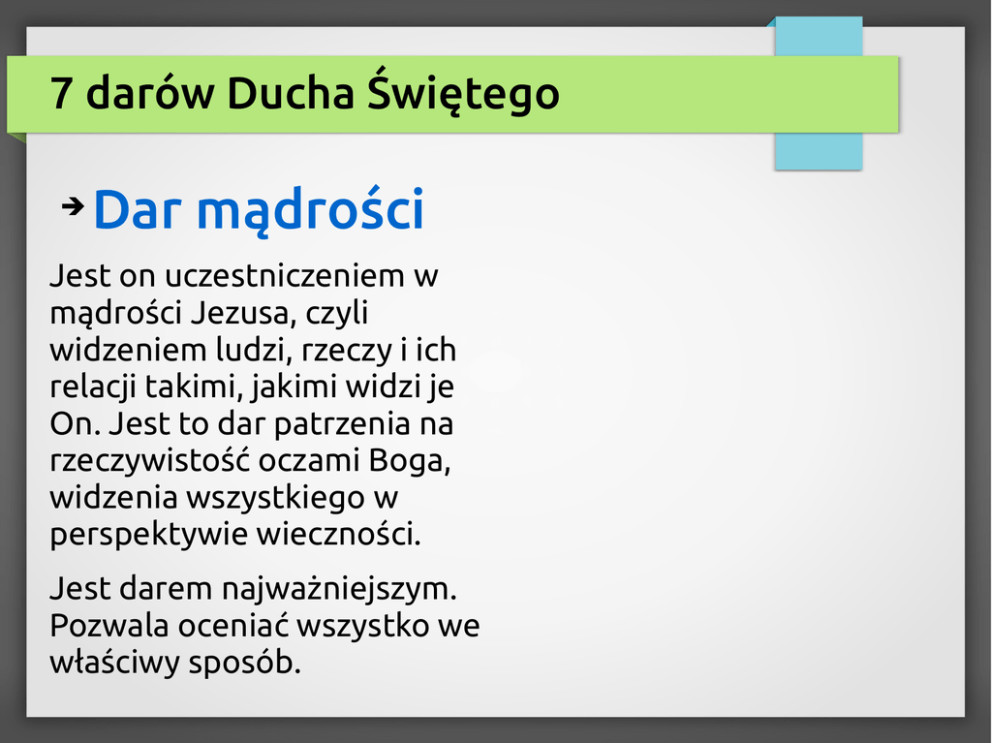 7 darów Ducha Świętego ➔ Dar mądrości Jest on uczestniczeniem w mądrości Jezusa, czyli widzeniem ludzi, rzeczy i ich relacji takimi, jakimi widzi je On. Jest to dar patrzenia na rzeczywistość oczami Boga, widzenia wszystkiego w perspektywie wieczności. Jest darem najważniejszym. Pozwala oceniać wszystko we właściwy sposób. 7 darów Ducha Świętego ➔ Dar rozumu Pomaga głębiej zrozumieć Boga i człowieka. Umożliwia wniknięcie w istotę i znaczenie tego, co w życiu najważniejsze, aby nie „ślizgać się po powierzchni”, nie zatrzymywać się na pozorach. Jest on sztuką wnikania w tajemnice Boga. 7 darów Ducha Świętego ➔ Dar umiejętności Pomaga wprowadzać w czyn podstawowe prawdy wiary i zasady moralne. Dzięki temu darowi człowiek jest praktyczny i skuteczny w działaniu, radzi sobie w konkretnych sprawach, umie je wykorzystać dla prawdziwego dobra. 7 darów Ducha Świętego ➔ Dar rady Pomaga dokonywać słusznego wyboru w sytuacjach skomplikowanych i niejasnych, rozróżniać, co jest rzeczywistym dobrem, a co złem. Dzięki temu darowi człowiek nie gubi się w szczegółach, nie waha się bez końca, ale umie podejmować mądre, jednoznaczne decyzje w sprawach wielkich i małych, tak by sensownie przeżywać swoje życie. 7 darów Ducha Świętego ➔ Dar męstwa Daje duchową siłę do odważnego wyznawania swoich przekonań i zgodnego z nimi postępowania, nie lękając się zagrożeń i przykrych konsekwencji. Dzięki niemu człowiek może przezwyciężać wewnętrzne opory i zewnętrzne prześladowania. Może przeciwstawiać się złu, nie uciekając się do przemocy i trwać do końca w dobrym, nie poddając się zmęczeniu i znużeniu. 7 darów Ducha Świętego ➔ Dar pobożności Jest on zdolnością traktowania Boga jako Ojca. Czyli bycia wobec Niego jak syn/córka: z prostotą, ciepłym szacunkiem i czułością. Dzięki pobożności całe życie człowieka jest przeżywane w komunii z Bogiem i staje się pieśnią na Jego chwałę 7 darów Ducha Świętego ➔ Dar bojaźni Bożej Nie oznacza niewolniczego strachu przed Bogiem, ale szacunek, respekt, posłuszeństwo wobec Niego i lęk, by Go nie utracić, gdyż jest najwyższą Wartością i Bogactwem. Tylko Bóg jest Osobą godną miłości ponad wszystko i tylko w komunii z Nim człowiek może znaleźć prawdziwy pokój i spełnienie.