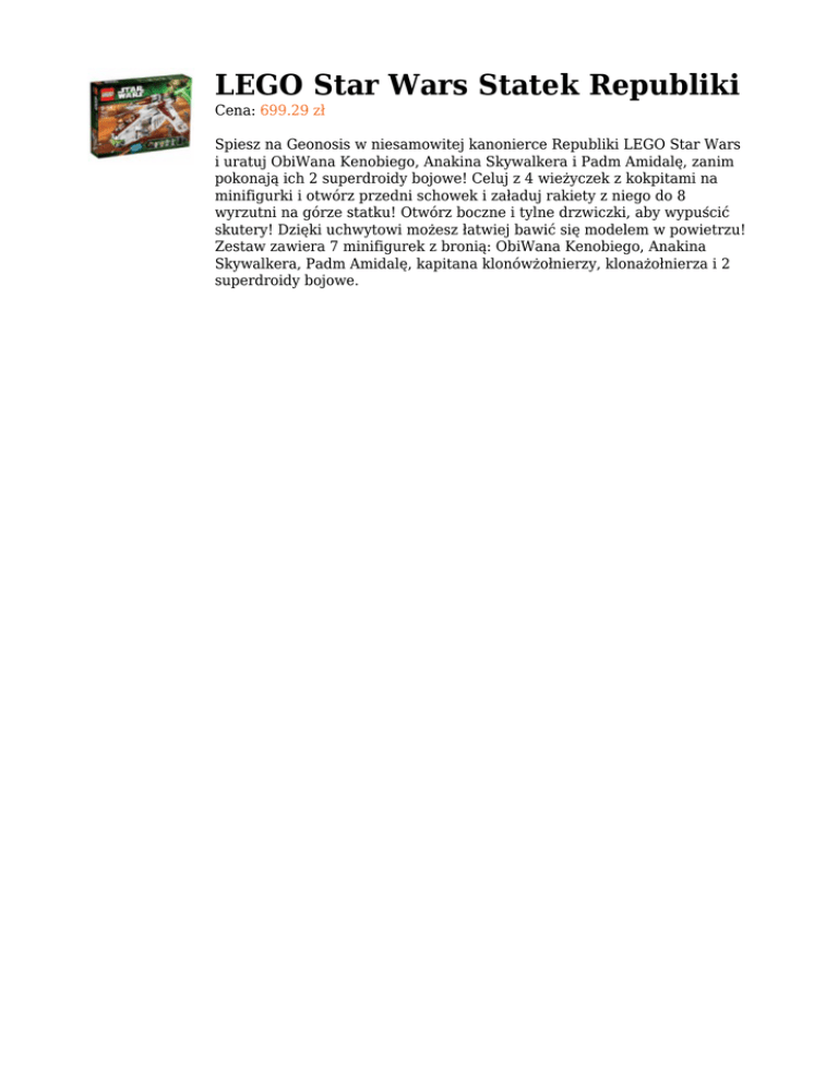 LEGO Star Wars Statek Republiki Cena: 699.29 zł Spiesz na Geonosis w niesamowitej kanonierce Republiki LEGO Star Wars i uratuj ObiWana Kenobiego, Anakina Skywalkera i Padm Amidalę, zanim pokonają ich 2 superdroidy bojowe! Celuj z 4 wieżyczek z kokpitami na minifigurki i otwórz przedni schowek i załaduj rakiety z niego do 8 wyrzutni na górze statku! Otwórz boczne i tylne drzwiczki, aby wypuścić skutery! Dzięki uchwytowi możesz łatwiej bawić się modelem w powietrzu! Zestaw zawiera 7 minifigurek z bronią: ObiWana Kenobiego, Anakina Skywalkera, Padm Amidalę, kapitana klonówżołnierzy, klonażołnierza i 2 superdroidy bojowe.