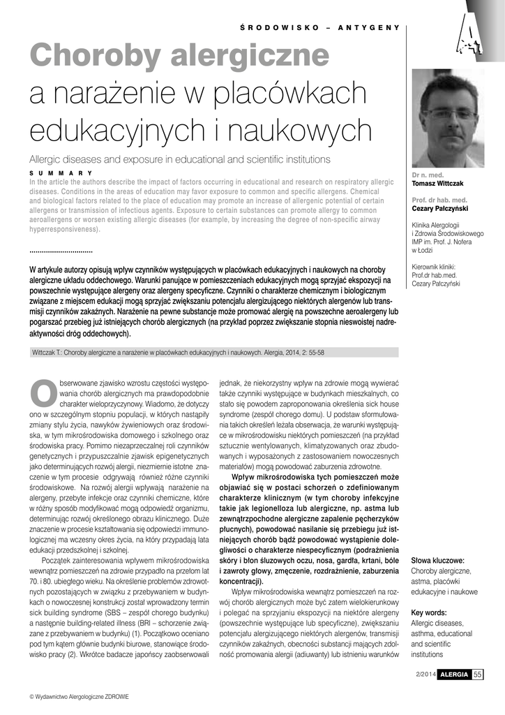 ś r o d o w i s k o – a n t y g e n y Choroby alergiczne a narażenie w placówkach edukacyjnych i naukowych Allergic diseases and exposure in educational and scientific institutions S U M M ARY In the article the authors describe the impact of factors occurring in educational and research on respiratory allergic diseases. Conditions in the areas of education may favor exposure to common and specific allergens. Chemical and biological factors related to the place of education may promote an increase of allergenic potential of certain allergens or transmission of infectious agents. Exposure to certain substances can promote allergy to common aeroallergens or worsen existing allergic diseases (for example, by increasing the degree of non-specific airway hyperresponsiveness). ............................... W artykule autorzy opisują wpływ czynników występujących w placówkach edukacyjnych i naukowych na choroby alergiczne układu oddechowego. Warunki panujące w pomieszczeniach edukacyjnych mogą sprzyjać ekspozycji na powszechnie występujące alergeny oraz alergeny specyficzne. Czynniki o charakterze chemicznym i biologicznym związane z miejscem edukacji mogą sprzyjać zwiększaniu potencjału alergizującego niektórych alergenów lub transmisji czynników zakaźnych. Narażenie na pewne substancje może promować alergię na powszechne aeroalergeny lub pogarszać przebieg już istniejących chorób alergicznych (na przykład poprzez zwiększanie stopnia nieswoistej nadreaktywności dróg oddechowych). Dr n. med. Tomasz Wittczak Prof. dr hab. med. Cezary Pałczyński Klinika Alergologii i Zdrowia Środowiskowego IMP im. Prof. J. Nofera w Łodzi Kierownik kliniki: Prof.dr hab.med. Cezary Pałczyński Wittczak T.: Choroby alergiczne a narażenie w placówkach edukacyjnych i naukowych. Alergia, 2014, 2: 55-58 O bserwowane zjawisko wzrostu częstości występowania chorób alergicznych ma prawdopodobnie charakter wieloprzyczynowy. Wiadomo, że dotyczy ono w szczególnym stopniu populacji, w których nastąpiły zmiany stylu życia, nawyków żywieniowych oraz środowiska, w tym mikrośrodowiska domowego i szkolnego oraz środowiska pracy. Pomimo niezaprzeczalnej roli czynników genetycznych i przypuszczalnie zjawisk epigenetycznych jako determinujących rozwój alergii, niezmiernie istotne znaczenie w tym procesie odgrywają również różne czynniki środowiskowe. Na rozwój alergii wpływają narażenie na alergeny, przebyte infekcje oraz czynniki chemiczne, które w różny sposób modyfikować mogą odpowiedź organizmu, determinując rozwój określonego obrazu klinicznego. Duże znaczenie w procesie kształtowania się odpowiedzi immunologicznej ma wczesny okres życia, na który przypadają lata edukacji przedszkolnej i szkolnej. Początek zainteresowania wpływem mikrośrodowiska wewnątrz pomieszczeń na zdrowie przypadło na przełom lat 70. i 80. ubiegłego wieku. Na określenie problemów zdrowotnych pozostających w związku z przebywaniem w budynkach o nowoczesnej konstrukcji został wprowadzony termin sick building syndrome (SBS – zespół chorego budynku) a następnie building-related illness (BRI – schorzenie związane z przebywaniem w budynku) (1). Początkowo oceniano pod tym kątem głównie budynki biurowe, stanowiące środowisko pracy (2). Wkrótce badacze japońscy zaobserwowali jednak, że niekorzystny wpływ na zdrowie mogą wywierać także czynniki występujące w budynkach mieszkalnych, co stało się powodem zaproponowania określenia sick house syndrome (zespół chorego domu). U podstaw sformułowania takich określeń leżała obserwacja, że warunki występujące w mikrośrodowisku niektórych pomieszczeń (na przykład sztucznie wentylowanych, klimatyzowanych oraz zbudowanych i wyposażonych z zastosowaniem nowoczesnych materiałów) mogą powodować zaburzenia zdrowotne. Wpływ mikrośrodowiska tych pomieszczeń może objawiać się w postaci schorzeń o zdefiniowanym charakterze klinicznym (w tym choroby infekcyjne takie jak legionelloza lub alergiczne, np. astma lub zewnątrzpochodne alergiczne zapalenie pęcherzyków płucnych), powodować nasilanie się przebiegu już istniejących chorób bądź powodować wystąpienie dolegliwości o charakterze niespecyficznym (podrażnienia skóry i błon śluzowych oczu, nosa, gardła, krtani, bóle i zawroty głowy, zmęczenie, rozdrażnienie, zaburzenia koncentracji). Wpływ mikrośrodowiska wewnątrz pomieszczeń na rozwój chorób alergicznych może być zatem wielokierunkowy i polegać na sprzyjaniu ekspozycji na niektóre alergeny (powszechnie występujące lub specyficzne), zwiększaniu potencjału alergizującego niektórych alergenów, transmisji czynników zakaźnych, obecności substancji mających zdolność promowania alergii (adiuwanty) lub istnieniu warunków Słowa kluczowe: Choroby alergiczne, astma, placówki edukacyjne i naukowe Key words: Allergic diseases, asthma, educational and scientific institutions 2/2014 ALERGIA © Wydawnictwo Alergologiczne ZDROWIE 55 ś r o d o w i s k o – a n t y g e n y pogarszających przebieg już istniejących chorób alergicznych (na przykład poprzez zwiększanie stopnia nieswoistej nadreaktywności dróg oddechowych). Czynniki obecne w placówkach edukacyjnych i naukowych i ich wpływ na układ oddechowy Wentylacja Prawidłowa wentylacja pomieszczeń ma zasadnicze znaczenie dla utrzymania komfortu termicznego oraz właściwej jakości powietrza. Należy jednak pamiętać, że jakość ta zależy od składu powietrza komunalnego. Choć w niedostatecznie wentylowanych pomieszczeniach stężenie zanieczyszczeń (zarówno o charakterze chemicznym, jak i biologicznym) jest większe pojawiły się również doniesienia, że substancje pochodzące z zewnątrz (tlenki siarki, DEP – spaliny z silników Diesla, jak również czynniki biologiczne takie jak pyłki roślin, zarodniki grzybów, bakterie) mogą zostać „uwięzione” w klimatyzowanych b