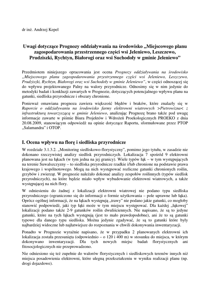 dr inż. Andrzej Kepel Uwagi dotyczące Prognozy oddziaływania na środowisko „Miejscowego planu zagospodarowania przestrzennego części wsi Jeleniewo, Leszczewo, Prudziszki, Rychtyn, Białorogi oraz wsi Suchodoły w gminie Jeleniewo” Przedmiotem niniejszego opracowania jest ocena Prognozy oddziaływania na środowisko „Miejscowego planu zagospodarowania przestrzennego części wsi Jeleniewo, Leszczewo, Prudziszki, Rychtyn, Białorogi oraz wsi Suchodoły w gminie Jeleniewo”, w części odnoszącej się do wpływu projektowanego Palny na walory przyrodnicze. Odnosimy się w nim jedynie do metodyki badań i konkluzji zawartych w Prognozie, dotyczących potencjalnego wpływu planu na gatunki, siedliska przyrodnicze i obszary chronione. Ponieważ omawiana prognoza zawiera większość błędów i braków, które znalazły się w Raporcie o oddziaływaniu na środowisko farmy elektrowni wiatrowych >Pietrowizna< z infrastrukturą towarzyszącą w gminie Jeleniewo, analizując Prognozę brano także pod uwagę informacje zawarte w piśmie Biura Projektów i Wdrożeń Proekologicznych PROEKO z dnia 20.08.2009, stanowiącym odpowiedź na opinie dotyczące Raportu, sformułowane przez PTOP „Salamandra” i OTOP. I. Ocena wpływu na florę i siedliska przyrodnicze W rozdziale 3.1.3.2. „Monitoring siedliskowo-florystyczny”, pomimo jego tytułu, w zasadzie nie dokonano rzeczywistej analizy siedlisk przyrodniczych. Lokalizacja 7 spośród 9 elektrowni planowana jest na łąkach (w tym jedna na jej granicy). Wiele typów łąk – w tym występujących na terenie Suwalszczyzny – to siedliska przyrodnicze rzadkie i/lub chronione na podstawie prawa krajowego i wspólnotowego. Mogą na nich występować rozliczne gatunki chronionych roślin, grzybów i zwierząt. W prognozie należało dokonać analizy zespołów roślinnych (typów siedlisk przyrodniczych), na które będzie miało wpływ wybudowanie elektrowni wiatrowych, a także występującej na nich flory. W odniesieniu do żadnej z lokalizacji elektrowni wiatrowej nie podano typu siedliska przyrodniczego (ograniczono się do informacji o formie użytkowania – pole uprawne lub łąka). Oprócz ogólnej informacji, że na łąkach występują „trawy” nie podano jakie gatunki, co mogłoby stanowić podpowiedź, jaki typ łąki może w tym miejscu występować. Dla każdej „łąkowej” lokalizacji podano także 2-9 gatunków roślin dwuliściennych. Nie napisano, że są to jedyne gatunki, które na tych łąkach występują (jest to mało prawdopodobne), ani że to są gatunki typowe dla danego typu siedliska. Można jedynie zgadywać, że są to gatunki które były najbardziej widoczne lub najłatwiejsze do rozpoznania w chwili dokonywania inwentaryzacji. Ponadto w Prognozie wyraźnie napisano, że w przypadku 2 planowanych elektrowni ich lokalizacja została przesunięta (odpowiednio – o 120 i 400 m) w stosunku do miejsca, w którym dokonywano inwentaryzacji. Dla tych nowych miejsc badań florystycznych ani fitosocjologicznych nie przeprowadzono. Nie odniesiono się też zupełnie do walorów florystycznych i siedliskowych terenów innych niż miejsca posadowienia elektrowni, które ulegną przekształceniu w wyniku realizacji planu (np. drogi dojazdowe). Powyższe braki sprawiają, że nie jest możliwa ocena, czy realizacja planu będzie miała znaczący negatywny wpływ na florę oraz siedliska przyrodnicze. Dyskwalifikuje to tę prognozę jako dokument, na którym można oprzeć poprawną ocenę oddziaływania planu na środowisko. II. Ocena wpływu na ornitofaunę II.2. Uwagi do zastosowanej dla celów Prognozy metodyki badań ptaków Zawarte w Prognozie informacje o zastosowanej metodyce badań ornitologicznych są bardzo ogólnikowe i budzą wiele wątpliwości. Wg podanych informacji, znaczna część kontroli (14 z 25) polegała na nagrywaniu głosów ptaków i rozpoznawaniu nagranych gatunków poza badanym terenem. Przy takiej metodyce znaczna część gatunków była niewykrywalna. Brak informacji dotyczących szczegółowej metodyki uniemożliwia ocenę, z jakiego obszaru pochodziły nagrania o obserwacje. Czy były to punktowe nagrywania automatyczne (z ilu punktów), czy nagrania na transektach (ilu, jak długich, jak poprowadzonych, jak czuły był mikrofon?). Inwentaryzacja ptaków na ternie planowanej elektrowni wiatrowej za pomocą nagrań głosów zdecydowanie nie jest standardową metodą stosowaną w tego typu przypadkach. Nawet gdyby była prowadzona bardzo dobrą metodyką, wyniki byłyby więc nieporównywalne z innymi badaniami, a w przypadku braku szczegółowego opisu zastosowanej niestandardowej metody – podane wyniki należy uznać za niewiarygodne, niemogące stanowić podstawy do wykonania oceny. Również badania ornitologiczne polegające na bezpośrednich obserwacjach (przez kogo prowadzonych – czy przez ornitologa?) prowadzone były na podstawie niejasnej metodyki. W sumie na badanym terenie dokonano 25 kontroli terenowych, w tym 11 (głownie zimą i jesienią) z wykorzystaniem obserwacji. Jednakże z Prognozy trudno wywnioskować, na czym polegały te „kontrole”. Konsekwencją tak ogólnej metodyki są również ogólne i trudne do interpretacji wyniki. Na ich podstawie praktycznie niemożliwe jest określenie, jakie jest faktyczne wykorzystanie przestrzeni powietrznej przez ptaki w rejonie planowanej farmy wiatrowej. Stwierdzenia typu „Na badanym terenie obserwowano loty ptaków na bardzo różnych wysokościach – od lotów bardzo niskich, tuż nad ziemią (skowronki) do bardzo wysokich (myszołowy, gęsi zbożowe) nie stanowią wystarczającej, merytorycznej informacji ilościowej, nawet jeśli podano zakresy wysokości przyjęte dla tych kategorii. Obecnie badania ornitologiczne na potrzeby prognozowania oddziaływania farm wiatrowych na ptaki powinny być prowadzone zgodnie z metodyką zawartą w wytycznych przygotowanych w 2008 przez Polskie Stowarzyszenie Energetyki 