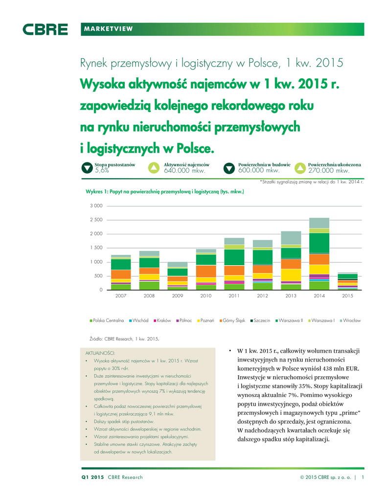 Rynek przemysłowy i logistyczny w Polsce - I kw. 2015
