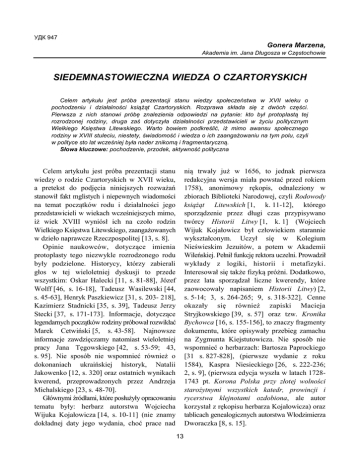 УДК 947 Gonera Marzena, Akademia im. Jana Długosza w Częstochowie SIEDEMNASTOWIECZNA WIEDZA O CZARTORYSKICH Celem artykułu jest próba prezentacji stanu wiedzy społeczeństwa w XVII wieku o pochodzeniu i działalności książąt Czartoryskich. Rozprawa składa się z dwóch części. Pierwsza z nich stanowi próbę znalezienia odpowiedzi na pytanie: kto był protoplastą tej rozrodzonej rodziny, druga zaś dotyczyła działalności przedstawicieli w życiu politycznym Wielkiego Księstwa Litewskiego. Warto bowiem podkreślić, iż mimo awansu społecznego rodziny w XVIII stuleciu, niestety, świadomość i wiedza o ich zaangażowaniu na tym polu, czyli w polityce sto lat wcześniej była nader znikomą i fragmentaryczną. Słowa kluczowe: pochodzenie, przodek, aktywność polityczna Celem artykułu jest próba prezentacji stanu wiedzy o rodzie Czartoryskich w XVII wieku, a pretekst do podjęcia niniejszych rozważań stanowił fakt mglistych i niepewnych wiadomości na temat początków rodu i działalności jego przedstawicieli w wiekach wcześniejszych mimo, iż wiek XVIII wyniósł ich na czoło rodzin Wielkiego Księstwa Litewskiego, zaangażowanych w dzieło naprawcze Rzeczpospolitej [13, s. 8]. Opinie naukowców, dotyczące imienia protoplasty tego niezwykle rozrodzonego rodu były podzielone. Historycy, którzy zabierali głos w tej wieloletniej dyskusji to przede wszystkim: Oskar Halecki [11, s. 81-88], Józef Wolff [46, s. 16-18], Tadeusz Wasilewski [44, s. 45-63], Henryk Paszkiewicz [31, s. 203- 218], Kazimierz Stadnicki [35, s. 39], Tadeusz Jerzy Stecki [37, s. 171-173]. Informacje, dotyczące legendarnych początków rodziny próbował rozwikłać Marek Cetwiński [5, s. 43-58]. Najnowsze informacje zawdzięczamy natomiast wieloletniej pracy Jana Tęgowskiego [42, s. 53-59; 43, s. 95]. Nie sposób nie wspomnieć również o dokonaniach ukraińskiej historyk, Natalii Jakowenko [12, s. 320] oraz ostatnich wynikach kwerend, przeprowadzonych przez Andrzeja Michalskiego [23, s. 48-70]. Głównymi źródłami, które posłużyły opracowaniu tematu były: herbarz autorstwa Wojciecha Wijuka Kojałowicza [14, s. 10-11] (nie znamy dokładnej daty jego wydania, choć prace nad nią trwały już w 1656, to jednak pierwsza redakcyjna wersja miała powstać przed rokiem 1758), anonimowy rękopis, odnaleziony w zbiorach Biblioteki Narodowej, czyli Rodowody książąt Litewskich [1, k. 11-12], którego sporządzenie przez długi czas przypisywano twórcy Historii Litwy [1, k. 1] (Wojciech Wijuk Kojałowicz był człowiekiem starannie wykształconym. Uczył się w Kolegium Nieświeskim Jezuitów, a potem w Akademii Wileńskiej. Pełnił funkcję rektora uczelni. Prowadził wykłady z logiki, historii i metafizyki. Interesował się także fizyką próżni. Dodatkowo, przez lata sporządzał liczne kwerendy, które zaowocowały napisaniem Historii Litwy) [2, s. 5-14; 3, s. 264-265; 9, s. 318-322]. Cenne okazały się również zapiski Macieja Stryjkowskiego [39, s. 57] oraz tzw. Kronika Bychowca [16, s. 155-156], to znaczy fragmenty dokumentu, które opisywały przebieg zamachu na Zygmunta Kiejstutowicza. Nie sposób nie wspomnieć o herbarzach: Bartosza Paprockiego [31 s. 827-828], (pierwsze wydanie z roku 1584), Kaspra Niesieckiego [26, s. 222-236; 2, s. 9], (pierwsza edycja wyszła w latach 17281743 pt. Korona Polska przy złotej wolności starożytnymi wszystkich katedr, prowincji i rycerstwa klejnotami ozdobiona, ale autor korzystał z rękopisu herbarza Kojałowicza) oraz tablicach genealogicznych autorstwa Włodzimierza Dworaczka [8, s. 15]. 13 Współczesne badania dowodzą, iż Czartoryscy wzięli swój początek od Giedymina. Na tym stanowisku stali: Oskar Halecki [11, s. 81-88], Józef Wolff [46, s. XII, 18], Tadeusz Wasilewski [44, s. 46], Kazimierz Stadnicki [35, s. 115], Henryk Paszkiewicz [31, s. 211-216], Jan Tęgowski [42, s. 53-59; 43, s. 95],Teodor Żychliński [48, s. 8], Zygmunt Wdowiszewski [45, s. 33-36], Jakub Morysom [24, s. 15], Jerzy Michalski [23, s. 48], Włodzimierz Dworzaczek [8, s. 16] oraz Natalia Jakowenko [12, s. 49, 320]. Niemal wszyscy wymienieni uważali, że założycielem rodu był Konstanty Olgierdowicz, jedynie Henryk Paszkiewicz [31, s. 309-312], Włodzimierz Dworzaczek [8, s. 16] oraz Jan Tęgowski sądzili, iż ich protoplastą był Konstanty Koriatowicz [43, s. 95, 311, 317]. Fakt genealogicznych związków Czartoryskich z domem Jagiellonów nie budzi zatem już dziś większych wątpliwości. Przez lata próbowano je jednak udowadniać na różne sposoby, nie cofając się również przed wykorzystaniem podań mitycznych i bajecznych legend. Dość zacytować słowa profesora Marka Cetwińskiego, który spostrzegł, «że na dworze Kazimierza Czartoryskiego krążyła legenda o pochodzeniu Czartoryskich od pewnego włoskiego rodu Colombów, a takie zapewnienia miały udowodnić ich pokrewieństwo z Jagiellonami, wszak ta dynastia miała wziąć początek od włoskich uchodźców» [5, s. 45]. Nie wierzył w to Jerzy Jankowski twierdząc, iż jest ono «wytworem bałamutnych urojeń» [13, s. 8]. O starożytnym rodowodzie kniaziów Czartoryskich pisała także Natalia Jakowenko [12, s. 48]. Nie należy jednak lekceważyć ustaleń Tadeusza Wasilewskiego, który zauważył, iż informacje o pochodzeniu Czartoryskich zaczynają wartko spływać dopiero w XVI wieku [44, s. 45]. Jak zatem w źródłach przedstawia się ta kwestia? Ich pochodzenie od Konstantego Olgierdowicza, choć odrzucone w toku dalszych badań miało swoje oparcie w siedemnastowiecznych źródłach i archiwaliach. O jego istnieniu czytamy bowiem w anonimowym rękopisie ze zbiorów Biblioteki Narodowej. Autor tegoż pisma podkreślał, że ów książę miał zamieszkać na Czartorysku w powiecie łuckim, a ziemia ta dała początek nazwisku magnatów [1, k. 11]. Koncepcji tej nie odrzucił również szesnastowieczny dziejopis, Maciej Stryjkowski i umieścił ją w swojej K