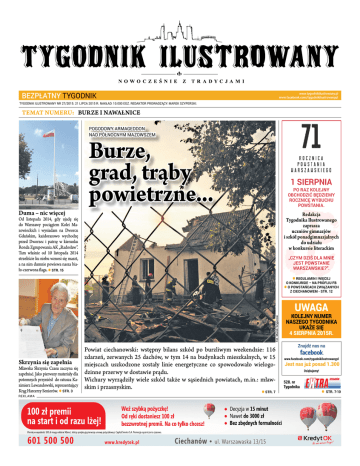 bezpłatny tygodnik www.tygodnikilustrowany.pl www.facebook.com/tygodnikilustrowanypl TYGODNIK ILUSTROWANY NR 27/2015. 21 LIPCA 2015 R. NAKŁAD: 10.000 EGZ. REDAKTOR PROWADZĄCY: MAREK SZYPERSKI. TEMAT NUMERU: BURZE I NAWAŁNICE Pogodowy Armageddon nad północnym Mazowszem Duma – nic więcej Burze, grad, trąby powietrzne... 1 sierpnia po raz kolejny obchodzić będziemy rocznicę wybuchu Powstania. Redakcja Tygodnika Ilustrowanego zaprasza uczniów gimnazjów i szkół ponadgimnazjalnych do udziału w konkursie literackim Od listopada 2014, gdy ujadę się do Warszawy pociągiem Kolei Mazowieckich i wysiadam na Dworcu Gdańskim, każdorazowo wychodzę przed Dworzec i patrzę w kierunku Ronda Zgrupowania AK „Radosław”. Tam właśnie od 10 listopada 2014 strzeliście ku niebu wznosi się maszt, a na nim dumnie powiewa nasza biało-czerwona flaga. STR. 15 „Czym dziś dla mnie jest Powstanie Warszawskie?”. • • Regulamin i więcej o konkursie – na profliu FB o powstańcach związanych z ciechanowem - str. 12 • Fot. Marek Szyperski UWAGA Skrzynia się zapełnia Mławska Skrzynia Czasu zaczyna się zapełniać. Jako pierwszy materiały dla potomnych przyniósł do ratusza Kazimierz Lewandowski, reprezentujący Krąg Harcerzy Seniorów. STR. 3 reklama • Powiat ciechanowski: wstępny bilans szkód po burzliwym weekendzie: 116 zdarzeń, zerwanych 25 dachów, w tym 14 na budynkach mieszkalnych, w 15 miejscach uszkodzone zostały linie energetyczne co spowodowało wielogodzinne przerwy w dostawie prądu. Wichury wyrządziły wiele szkód także w sąsiednich powiatach, m.in.: mławskim i przasnyskim. • STR. 7 KOLEJNY numer naszego tygodnika ukaże się 4 sierpnia 2015r. Znajdź nas na www.facebook.com/tygodnikilustrowanypl Jest nas już ponad 1.300 Dziękujemy! 528. nr Tygodnika • str. 7-10 2 | TEMAT NUMERU 21 lipca 2015 | www.tygodnikilustrowany.pl | TYGODNIK ILUSTROWANY ŻYWIOŁY W NATARCIU - JAK PRZETRWAĆ? kością powyżej 120 km/h. Powodują rozległe spustoszenia w strefie swojego oddziaływania. BURZE I NAWAŁNICE Co należy zrobić przed spodziewaną wichurą Fot. Marek Szyperski Poradnik opracowany przez Departament Zarządzania Kryzysowego i Systemu Powiadamiania Ratunkowego Ministerstwa Administracji i Cyfryzacji • słuchaj prognoz pogody i komunikatów lokalnych mediów, • unikaj przebywania na otwartej przestrzeni, szukaj schronienia w budynku, • jeśli to niemożliwe: postaraj się przyjąć bezpieczną pozycję (kucnij, zbliżając stopy maksymalnie do siebie), • jeśli jesteś w grupie osób: rozdzielcie się, żeby nie tworzyć skupiska, • nie rozmawiaj przez telefon komórkowy (najlepiej go wyłącz), • zejdź z roweru, żeby nie dotykać jego metalowych części. Unikaj kontaktu z metalowymi przedmiotami, • nie stawaj pod pojedynczym wysokim drzewem ani w pobliżu wysokich konstrukcji, linii wysokiego napięcia, przewodów lub trakcji, • zejdź ze szczytów wzniesień w obniżenie terenu, • na otwartych zbiornikach wodnych: natychmiast wyjdź z wody, łódki lub kajaka na brzeg. • w mieszkaniu i domu zamknij wszystkie okna; z balkonu, tarasu, podwórka i obejścia należy usunąć (lub zabezpieczyć) przedmioty, które mogłyby zostać porwane przez wiatr (parasole, donice, suszarki do prania itp.), wyłącz z kontaktów urządzenia elektryczne, nie rozmawiaj przez telefon stacjonarny. GRADOBICIA najczęstszą przyczyną występowania gradobicia jest powstawanie chmur gradowych na skutek silnych, pionowych ruchów powietrza. Zjawisko to ma miejsce najczęściej w okresie letnim. Przygotowania na wypadek wystąpienie gradobicia • Ubezpiecz swoje mieszkanie, dom, samochód, zwierzęta gospodarskie, uprawy polowe od skutków gradobicia. • Zapisz i zapamiętaj numer telefonu na pogotowie ratunkowe, do służb weterynaryjnych i upewnij się, czy wszyscy członkowie rodziny je znają. • Przygotuj swoje mieszkanie, swój dom: zabezpiecz rynny i inne części budynku, zabezpiecz lampy i inne urządzenia, które mogą ulec zniszczeniu, Podczas gradobicia • Jeżeli spotka Cię gradobicie z dala od domu, znajdź bezpieczne schronienie i pozostań tam do czasu jego zakończenia. • Jeśli jesteś w domu: zamknij okna, usuń z parapetów i balkonów przedmioty, które mogą zagrażać przechodniom, pozostań w nim z dala od oszklonych okien, sufitów i drzwi, w miarę możliwości pozamykaj zwierzęta domowe i hodowlane, trzymaj pod ręką przygotowane latarki oraz dodatkowe baterie, miej włączone radio, w celu uzyskania ewentualnych komunikatów. • wszystkich zdarzeniach, mających istotne znaczenie dla bezpieczeństwa ludzi informuj pogotowie ratunkowe, a w przypadku zerwania linii energetycznych zgłoś to pogotowiu energetycznemu. Po ustąpieniu gradobicia • Jeśli są poszkodowani to: udziel pierwszej pomocy rannym lub poszkodowanym osobom, nie przenoś ciężko rannych osób, chyba że są one bezpośrednio zagrożone, doznaniem kolejnych obrażeń - wezwij pomoc. Jeżeli byłeś ubezpieczony przed gradobiciem, wykonaj zdjęcia zniszczeń, zarówno domu, jak i jego wyposażenia w celu ubiegania się o odszkodowanie. BURZE – WICHURY - HURAGANY WICHURY – wiatry wiejące z prędkością powyżej 75 km/h. W Polsce występują coraz częściej. Mogą powodować uszkodzenia budynków, łamać i wyrywać drzewa z korzeniami oraz paraliżować transport. HURAGANY - wiatry wiejące z pręd- • upewnij się czy wszyscy członkowie Twojej rodziny wiedzą jak postępować w czasie wichury oraz naucz ich jak wyłączać w domu dopływ gazu, wody, elektryczność, • opracuj plan komunikowania się w czasie zagrożenia na okoliczność gdy członkowie rodziny są rozdzieleni np. rodzice w pracy a dzieci w szkole, • naucz członków rodziny (dzieci) jak i kiedy wzywa się policję, straż, pogotowie ratunkowe, gazowe, energetyczne, które radio jest nastrojone na odbiór informacji o stanie zagrożenia, • zabezpiecz swój dom: - z