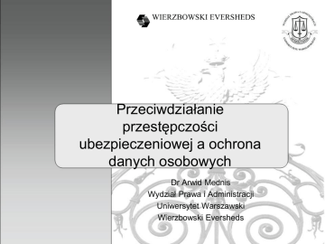 Przeciwdziałanie przestępczości ubezpieczeniowej a ochrona danych osobowych Dr Arwid Mednis Wydział Prawa i Administracji Uniwersytet Warszawski Wierzbowski Eversheds 1 Konstytucja RP – art. 51 1. Nikt nie może być obowiązany inaczej niż na podstawie ustawy do ujawniania informacji dotyczących jego osoby. 2. Władze publiczne nie mogą pozyskiwać, gromadzić i udostępniać innych informacji o obywatelach niż niezbędne w demokratycznym państwie prawnym. 3. Każdy ma prawo dostępu do dotyczących go urzędowych dokumentów i zbiorów danych. Ograniczenie tego prawa może określić ustawa. 4. Każdy ma prawo do żądania sprostowania oraz usunięcia informacji nieprawdziwych, niepełnych lub zebranych w sposób sprzeczny z ustawą. 5. Zasady i tryb gromadzenia oraz udostępniania informacji określa ustawa. 2 Konstytucja RP – art. 31 1. Wolność człowieka podlega ochronie prawnej. 2. Każdy jest obowiązany szanować wolności i prawa innych. Nikogo nie wolno zmuszać do czynienia tego, czego prawo mu nie nakazuje. 3. Ograniczenia w zakresie korzystania z konstytucyjnych wolności i praw mogą być ustanawiane tylko w ustawie i tylko wtedy, gdy są konieczne w demokratycznym państwie dla jego bezpieczeństwa lub porządku publicznego, bądź dla ochrony środowiska, zdrowia i moralności publicznej, albo wolności i praw innych osób. Ograniczenia te nie mogą naruszać istoty wolności i praw. 3 Legalność przetwarzania danych Przetwarzanie danych jest dopuszczalne tylko wtedy, gdy: 1) osoba, której dane dotyczą, wyrazi na to zgodę, chyba że chodzi o usunięcie dotyczących jej danych, 2) jest to niezbędne dla zrealizowania uprawnienia lub spełnienia obowiązku wynikającego z przepisu prawa, 3) jest to konieczne do realizacji umowy, gdy osoba, której dane dotyczą, jest jej stroną lub gdy jest to niezbędne do podjęcia działań przed zawarciem umowy na żądanie osoby, której dane dotyczą, 4) jest niezbędne do wykonania określonych prawem zadań realizowanych dla dobra publicznego, 5) jest to niezbędne dla wypełnienia prawnie usprawiedliwionych celów realizowanych przez administratorów danych albo odbiorców danych, a przetwarzanie nie narusza praw i wolności osoby, której dane dotyczą. 4 Legalność przetwarzania danych • Specyfika wykorzystywania tzw. danych sensytywnych • Zgodność danych z celem przetwarzania • Adekwatność danych do celu • Obowiązek usunięcia lub anonimizacji danych po osiągnięciu celu. 5 Przestępczość ubezpieczeniowa • Problem definicji przestępczości ubezpieczeniowej • Art. 298 § 1 kodeksu karnego: Kto, w celu uzyskania odszkodowania z tytułu umowy ubezpieczenia, powoduje zdarzenie będące podstawą do wypłaty takiego odszkodowania, podlega karze pozbawienia wolności od 3 miesięcy do lat 5 • Tymczasem przestępczość ubezpieczeniowa obejmuje również inne kategorie czynów 6 Status PIU i UFG • Utworzone na podstawie ustawy, posiadają osobowość prawną • PIU jest organizacją samorządu gospodarczego – członkostwo zakładów ubezpieczeń jest obowiązkowe • UFG jest instytucją wykonującą zadania określone w ustawie (m. in. egzekucja, zaspokajanie roszczeń z tytułu niektórych ubezpieczeń) • Przynależność zakładów ubezpieczeń do UFG wynika z mocy prawa 7 PIU i UFG a informacje o przestępstwach ubezpieczeniowych Zadanie PIU (m. in.): „tworzenie i wykonywanie informatycznych baz danych w zakresie statystyki ubezpieczeniowej, a w szczególności baz danych o przebiegu szkodowości w poszczególnych rodzajach ubezpieczeń oraz baz danych niezbędnych do przeciwdziałania przestępczości ubezpieczeniowej, w tym informacji o wypłaconych odszkodowaniach lub świadczeniach, z wyłączeniem ubezpieczeń, o których mowa w dziale II w grupach 3 i 10 załącznika do ustawy, oraz o osobach, przeciwko którym było prowadzone postępowanie karne w związku z podejrzeniem popełnienia przez nie przestępstwa na szkodę zakładu ubezpieczeń, zakończone wyrokiem skazującym lub warunkowym umorzeniem postępowania” 8 PIU i UFG a informacje o przestępstwach ubezpieczeniowych Zadanie UFG (m. in.): „Fundusz jest uprawniony do przetwarzania danych, o których mowa w art. 102 ust. 2-4 oraz w art. 103 [m. in. dane osobowe ubezpieczonego i uczestnika zdarzenia – przyp. A.M.], w celu kontroli spełnienia obowiązku zawarcia umowy ubezpieczenia obowiązkowego oraz w celu identyfikacji i weryfikacji zjawisk związanych z przestępczością ubezpieczeniową albo dla innych celów, po modyfikacji, która nie pozwoli na ustalenie tożsamości osoby, której dane dotyczą [podkreśl. – A.M.].” 9 Zakres uprawnień PIU i UFG do gromadzenia danych • Gromadzenie danych osobowych przez PIU i UFG nie jest związane z wykonywaniem uprawnień władczych • Cele przetwarzania są wskazane w przepisach ustawowych • Problem definicji przestępstw ubezpieczeniowych – czy i jakie ma znaczenie? 10 11
