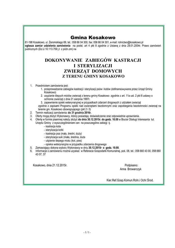 Gmina Kosakowo 81-198 Kosakowo, ul. Żeromskiego 69, tel.: 058 66 04 300, fax: 058 66 04 301, e-mail: [email protected] ogłasza zamiar udzielenia zamówienia na podst. art 4 pkt 8 zgodnie z Ustawą z dnia 29.01.2004r. Prawo zamówień publicznych (Dz.U.10.113.759 j.t z późn.zm) na DOKONYWANIE ZABIEGÓW KASTRACJI I STERYLIZACJI ZWIERZĄT DOMOWYCH Z TERENU GMINY KOSAKOWO 1. 2. 3. 4. 5. 6. Przedmiotem zamówienia jest: 1. przeprowadzanie zabiegów kastracji i sterylizacji psów i kotów (dofinansowywane przez Urząd Gminy Kosakowo) 2. usypianie ślepych miotów zwierząt z terenu gminy Kosakowo zgodnie z art. 11a ust. 2 pkt 6 ustawy o ochronie zwierząt z dnia 21 sierpnia 1997r. 3. zapewnienie opieki weterynaryjnej w przypadkach zdarzeń drogowych z udziałem zwierząt zgodnie z zapisami Programu opieki nad zwierzętami bezdomnymi oraz zapobiegania bezdomności zwierząt na terenie gm. Kosakowo obowiązującego (pkt 2 i 3) Termin realizacji zamówienia: do 31 grudnia 2016r. Oferty mogą złożyć Wykonawcy, którzy posiadają doświadczenie oraz odpowiednie uprawnienia. Ofertę w formie pisemnej należy złożyć do dnia 30.12.2015r. do godz. 10.00 w Biurze Obsługi Interesanta tut. Urzędu Gminy z wyszczególnieniem cen na poszczególne zabiegi tj. kastracja kota sterylizacja kotki kastracja psa (mały, średni, duży) sterylizacja suki (mała, średnia, duża uśpienie ślepego miotu (kot, pies) opieka weterynaryjna w przypadku zdarzenia drogowego Zamawiający dokona wyboru Wykonawcy w dniu 30.12.2015r o godz. 10.00. Informacje o zamówieniu można uzyskać w Referacie Gospodarki Komunalnej, pok. 08, tel.: 058 660 43 00, 058 660 43 07, 37 Kosakowo, dnia 21.12.2015r. Podpisano: Anna Browarczyk Kier.Ref.Gosp.Komun.Roln.i Ochr.Środ. -1/1-