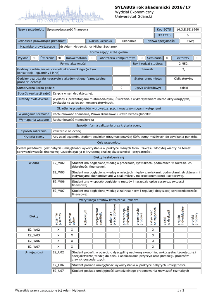 SYLABUS rok akademicki 2016/17 Wydział Ekonomiczny Uniwersytet Gdański Nazwa przedmiotu Sprawozdawczość finansowa Jednostka prowadząca przedmiot Nazwisko prowadzącego Nazwa kierunku Ekonomia Kod ECTS 14.3.E.SZ.1960 Pkt.ECTS 6 Nazwa specjalności FWP; dr Adam Mytlewski, dr Michał Suchanek Forma zajęć/Liczba godzin Wykład 30 Ćwiczenia 20 Konwersatoria 0 Laboratoria komputerowe Forma aktywności 0 Sumaryczna liczba godzin: 0 0 Lektoraty Rok i rodzaj studiów: 2 NS2, Semestr: 3, Status przedmiotu: Obligatoryjny Język wykładowy: polski Godziny z udziałem nauczyciela akademickiego (w tym konsultacje, egzaminy i inne): Godziny bez udziału nauczyciela akademickiego (samodzielna praca studenta): Seminaria 0 Sposób realizacji zajęć Zajęcia w sali dydaktycznej. Metody dydaktyczne Wykłady z prezentacjami multimedialnymi, Ćwiczenia z wykorzystaniem metod aktywizujących, Dyskusja na zajęciach konwersatoryjnych, Określenie przedmiotów wprowadzających wraz z wymogami wstępnymi Wymagania formalne Rachunkowość finansowa, Prawo Biznesowe i Prawo Przedsiębiorstw Wymagania wstepne Rachunkowość menedżerska Sposób i forma zaliczenia oraz kryteria oceny Sposób zaliczenia Kryteria oceny Zaliczenie na ocenę Aby zdać egzamin, student powinien otrzymac powyżej 50% sumy możliwych do uzyskania punktów. Cele przedmiotu Celem przedmiotu jest nabycie umiejętności wykorzystania w praktyce różnych form i zakresu zdobytej wiedzy na temat sprawozdawczości finansowej uzupełniając ją o krytyczną analizę skuteczności i przydatności. Efekty kształcenia się Wiedza E2_W02 Student ma pogłębioną wiedzę o procesach, zjawiskach, podmiotach w zakresie ich działalności finansowej. E2_W03 Student ma pogłębioną wiedzę o relacjach między zjawiskami, podmiotami, strukturami i instytucjami ekonomicznymi w skali mikro-, makroekonomicznej i sektorowej. E2_W06 Student zna w sposób pogłębiony metody i narzędzia opisu sprawozdawczości finansowej. E2_W07 Student ma pogłębioną wiedzę z zakresu norm i regulacji dotyczącej sprawozdawczości finansowej. Weryfikacja efektów kształcenia - Wiedza Efekty E2_W02 X X X E2_W03 X X X E2_W06 X X X E2_W07 X X X Umiejętności E2_U02 Student potrafi, w oparciu o dyscyplinę naukową ekonomia, wykorzystać teoretyczną i specjalistyczną wiedzę do opisu i analizowania przyczyn oraz przebiegu procesów i zjawisk gospodarczych. E2_U06 Student posiada umiejętność wykorzystania w praktyce nabytych umiejętności. E2_U07 Student posiada umiejętność samodzielnego proponowania rozwiązań rozmaitych Wszystkie prawa zastrzeżone (c) Adam Mytlewski 1/3 SYLABUS rok akademicki 2016/17 Wydział Ekonomiczny Uniwersytet Gdański problemów. E2_U08 Student posiada umiejętność rozumienia i samodzielnego analizowania zjawisk i procesów ekonomicznych, rozszerzoną o umiejętność pogłębionej teoretycznie oceny tych zjawisk w wybranych obszarach, z zastosowaniem odpowiednio dobranej metody badawczej. Weryfikacja efektów kształcenia - Umiejętności Efekty E2_U02 X X X E2_U06 X X X E2_U07 X X X E2_U08 X X X Kompetencje E2_K01 Student rozumie potrzebę stałego uczenia się i aktualizowania swojej wiedzy. E2_K04 Student prawidłowo identyfikuje, diagnozuje i rozstrzyga dylematy oraz różne warianty rozwiązań związane z wykonywaniem zawodu. E2_K05 Student uczestnicząc w przygotowaniu projektów ekonomiczno-społecznych potrafi godzić wymagania prawne, ekonomiczne, ekologiczne, polityczne i społeczne. Weryfikacja efektów kształcenia - Kompetencje Efekty E2_K01 X X E2_K04 X E2_K05 X Treści programowe A Założenia koncepcyjne sprawozdawczości finansowej 1. Potrzeba koncepcji ramowej 2. Koncepcja rzetelnej, prawidłowej i istotnej prezentacji informacji 3. Nadrzędne zasady rachunkowości: ostrożności, kontynuacji działalności, ciągłości, porównywalności, memoriału, istotności,wyższości formy nad treścią i inne. 4. Rozpoznanie i pomiar 5. Prawne a ekonomiczne aspekty rachunkowości 6. Alternatywne modele i praktyki B Ramy regulacyjne sprawozdawczości finansowej 1. Przyczyny istnienia ram regulacyjnych 2. Proces ustalanie standardów 3. Podmioty specjalne, organizacje non-profit oraz podmioty publiczne C Sprawozdania finansowe 1. Sprawozdanie z przepływu środków pieniężnych Wszystkie prawa zastrzeżone (c) Adam Mytlewski 2/3 SYLABUS rok akademicki 2016/17 Wydział Ekonomiczny Uniwersytet Gdański 2. Rzeczowe aktywa trwałe 3. Wartości niematerialne i prawne4. Zapasy5. Aktywa finansowe i zobowiązania finansowe6. Najem i dzierżawa7. Rezerwy na zobowiązania, zobowiązania warunkowe i aktywa warunkowe8. Utrata wartości aktywów9. Opodatkowanie10. Wymogi regulacyjne dotyczące przygotowania sprawozdań finansowych11. Raportowanie wyników finansowychD Połączenia jednostek gospodarczych1. Pojecie i zasady grupy kapitałowej2. Pojecie skonsolidowanego sprawozdania finansowego3. Przygotowanie skonsolidowanego sprawozdania finansowegoE Analiza i interpretacja sprawozdań finansowych1. Ograniczenia sprawozdań finansowych2. Obliczanie i interpretacja wskaźników finansowych i tendencji dla potrzeb zainteresowanych stron (np. udziałowców)3. Ograniczenia technik interpretacji danych4. Podmioty specjalne, organizacje non-profit oraz podmioty publiczne Wykaz literatury podstawowej i uzupełniającej Literatura obowiązkowa: Materiały szkoleniowe ACCA; E. Walinska , A. Wencel , J. Gad , A. Jurewicz, Sprawozdanie finansowe według MSSF, Wolters Kluwer Polska, Warszawa 2011. Literatura uzupełniająca: W. A Nowak, Teoria sprawozdawczości finansowej. Perspektywa standardów rachunkowości, Wolters Kluwer Polska, Warszawa2010; Rachunkowość. Rachunkowość i sprawozdawczość finansowa, pod. Red. E. Walinskiej, Wolters Kluwer Polska, Warszawa 2012 Kontakt [email protected], [email protected], Wszystkie prawa zastrzeżone (c) Adam Mytlewski 3/3