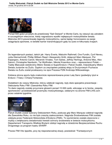 Taddy Błażusiak i Patryk Dudek na Gali Mistrzów Świata 2013 w Monte-Carlo środa, 04 grudnia 2013 22:28 Ponad 500 gości przybyło do prestiżowej "Sali Gwiazd" w Monte-Carlo, by cieszyć się udziałem w szczególnym wieczorze, kiedy nagradzano wysiłki najlepszych motocyklistów świata. Mistrzów 2013 prezentowały legendy motocyklizmu, same będąc honorowane za swoje osiągnięcia sportowe, w świetle kamer transmitujących galę na żywo w kilkunastu krajach. Do legendarnych postaci, takich jak Harry Everts, Malcolm Rathmell, Ove Fundin, Cyril Neveu, Jutta Kleinschmidt, Phillip William Read i Alessandro Gritti, dołączyli Marc Marquez, Pol Espargaro, Antonio Cairoli, Maverick Vinales, Tom Sykes, Jeffrey Herlings, Antoine Meo, Alex Salvini, Christophe Nambotin, Tai Woffinden, Nikolai Krasnikov oraz – reprezentanci Polski – Taddy Błażusiak wielokrotny Mistrz Świata w SuperEnduro i Patryk Dudek, Indywidualny Mistrz Świata Juniorów na Żużlu. Dyplom za zwycięstwo polskiej ekipy w Drużynowym Pucharze Świata na Żużlu został przekazany na ręce Prezesa PZM Andrzeja Witkowskiego. Kobieca strona sportu była znakomicie reprezentowana przez Laię Sanz (podwójny tytuł w Enduro i Trialu) i Chiarę Fontanesi. Dodatkiem do rzeszy Mistrzów, którzy odebrali nagrody, były dwie specjalne prezentacje Debiutanta Roku FIM i Zawodnika Roku FIM. Te dwie nagrody zostały przyznane głosami ponad 15 000 osób, wliczając w to fanów, zespoły, sportowców i przedstawicieli przemysłu motocyklowego, oddanymi na stronie FIM-LIVE.com przez ostatnie tygodnie. Patryk Dudek został wybrany Debiutantem Roku, podczas gdy Marc Marquez odebrał nagrodę dla Zawodnika Roku, co nie było zresztą zaskoczeniem. Nagroda Środowiskowa FIM została zdobyta przez Federació Motociclista d'Andorra (FMA). To wyróżnienie zostało stworzone z myślą o zwiększaniu świadomości kwestii ochrony środowiska w świecie motocyklizmu. Departament Transportu Wielkiej Brytanii zdobył nagrodę w dziedzinie Bezpieczeństwa Ruchu Drogowego za program kasku SHARP. Prezes FIM Vito Ippolito, przy tej niepowtarzalnej okazji, powiedział: "Fantastycznym 1/2 Taddy Błażusiak i Patryk Dudek na Gali Mistrzów Świata 2013 w Monte-Carlo środa, 04 grudnia 2013 22:28 przeżyciem było móc prowadzić czwartą edycję Gali FIM w Monte-Carlo, nadto drugi raz z rzędu. To miejsce ponownie okazało się znakomitą scenerią dla grupy tegorocznych Mistrzów FIM, oraz by podzielić się tą specjalną okazją z milionami widzów na całym świecie. Chciałbym podziękować zawodnikom, załogom, całej motocyklowej rodzinie za wsparcie tego ważnego wydarzenia, gdy ponownie wspólnie pokazaliśmy światu siłę ducha tkwiącego w motocyklizmie". źródło: pzm.pl 2/2