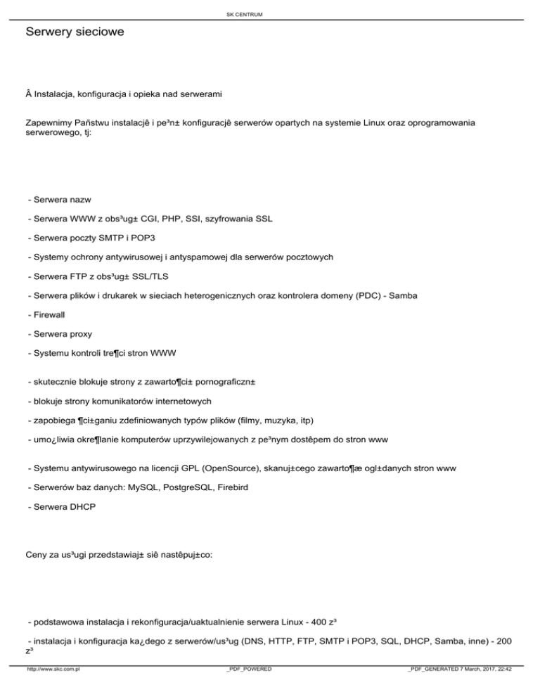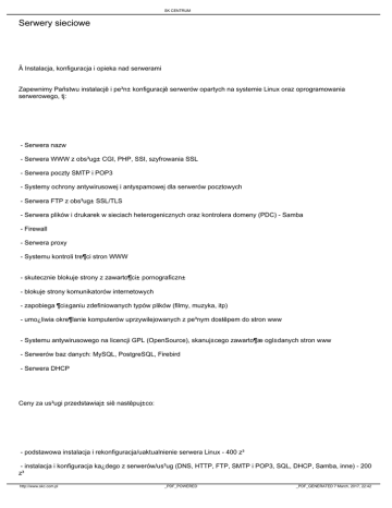SK CENTRUM Serwery sieciowe  Instalacja, konfiguracja i opieka nad serwerami Zapewnimy Pañstwu instalacjê i pe³n± konfiguracjê serwerów opartych na systemie Linux oraz oprogramowania serwerowego, tj: - Serwera nazw - Serwera WWW z obs³ug± CGI, PHP, SSI, szyfrowania SSL - Serwera poczty SMTP i POP3 - Systemy ochrony antywirusowej i antyspamowej dla serwerów pocztowych - Serwera FTP z obs³ug± SSL/TLS - Serwera plików i drukarek w sieciach heterogenicznych oraz kontrolera domeny (PDC) - Samba - Firewall - Serwera proxy - Systemu kontroli tre¶ci stron WWW - skutecznie blokuje strony z zawarto¶ci± pornograficzn± - blokuje strony komunikatorów internetowych - zapobiega ¶ci±ganiu zdefiniowanych typów plików (filmy, muzyka, itp) - umo¿liwia okre¶lanie komputerów uprzywilejowanych z pe³nym dostêpem do stron www - Systemu antywirusowego na licencji GPL (OpenSource), skanuj±cego zawarto¶æ ogl±danych stron www - Serwerów baz danych: MySQL, PostgreSQL, Firebird - Serwera DHCP Ceny za us³ugi przedstawiaj± siê nastêpuj±co: - podstawowa instalacja i rekonfiguracja/uaktualnienie serwera Linux - 400 z³ - instalacja i konfiguracja ka¿dego z serwerów/us³ug (DNS, HTTP, FTP, SMTP i POP3, SQL, DHCP, Samba, inne) - 200 z³ http://www.skc.com.pl _PDF_POWERED _PDF_GENERATED 7 March, 2017, 22:42 SK CENTRUM - dodatkowe skrypty i programy - cena do negocjacji - zdalna administracja serwerem - od 300 z³/mies. Uwaga: Do podanych cen nale¿y dodaæ 22% podatku VAT. http://www.skc.com.pl _PDF_POWERED _PDF_GENERATED 7 March, 2017, 22:42