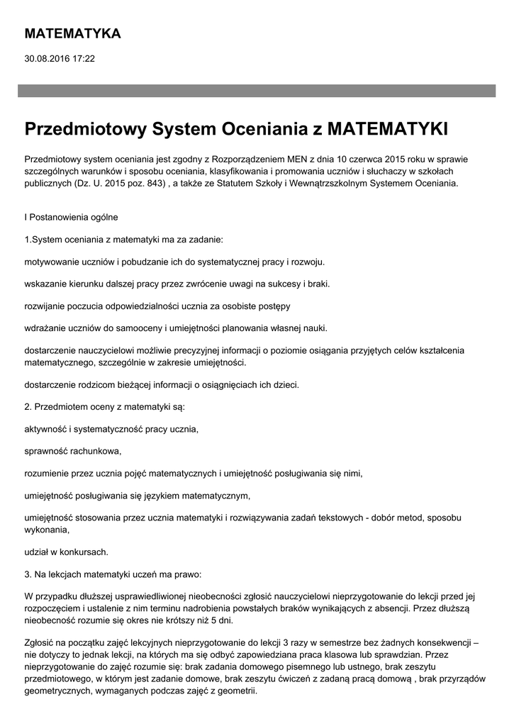 MATEMATYKA 30.08.2016 17:22 Przedmiotowy System Oceniania z MATEMATYKI Przedmiotowy system oceniania jest zgodny z Rozporządzeniem MEN z dnia 10 czerwca 2015 roku w sprawie szczególnych warunków i sposobu oceniania, klasyfikowania i promowania uczniów i słuchaczy w szkołach publicznych (Dz. U. 2015 poz. 843) , a także ze Statutem Szkoły i Wewnątrzszkolnym Systemem Oceniania. I Postanowienia ogólne 1.System oceniania z matematyki ma za zadanie: motywowanie uczniów i pobudzanie ich do systematycznej pracy i rozwoju. wskazanie kierunku dalszej pracy przez zwrócenie uwagi na sukcesy i braki. rozwijanie poczucia odpowiedzialności ucznia za osobiste postępy wdrażanie uczniów do samooceny i umiejętności planowania własnej nauki. dostarczenie nauczycielowi możliwie precyzyjnej informacji o poziomie osiągania przyjętych celów kształcenia matematycznego, szczególnie w zakresie umiejętności. dostarczenie rodzicom bieżącej informacji o osiągnięciach ich dzieci. 2. Przedmiotem oceny z matematyki są: aktywność i systematyczność pracy ucznia, sprawność rachunkowa, rozumienie przez ucznia pojęć matematycznych i umiejętność posługiwania się nimi, umiejętność posługiwania się językiem matematycznym, umiejętność stosowania przez ucznia matematyki i rozwiązywania zadań tekstowych - dobór metod, sposobu wykonania, udział w konkursach. 3. Na lekcjach matematyki uczeń ma prawo: W przypadku dłuższej usprawiedliwionej nieobecności zgłosić nauczycielowi nieprzygotowanie do lekcji przed jej rozpoczęciem i ustalenie z nim terminu nadrobienia powstałych braków wynikających z absencji. Przez dłuższą nieobecność rozumie się okres nie krótszy niż 5 dni. Zgłosić na początku zajęć lekcyjnych nieprzygotowanie do lekcji 3 razy w semestrze bez żadnych konsekwencji – nie dotyczy to jednak lekcji, na których ma się odbyć zapowiedziana praca klasowa lub sprawdzian. Przez nieprzygotowanie do zajęć rozumie się: brak zadania domowego pisemnego lub ustnego, brak zeszytu przedmiotowego, w którym jest zadanie domowe, brak zeszytu ćwiczeń z zadaną pracą domową , brak przyrządów geometrycznych, wymaganych podczas zajęć z geometrii. Do wyjaśnienia i uzasadnienia od nauczyciela wystawionej przez niego oceny. Do wglądu przez niego i jego rodziców do sprawdzonych i ocenionych prac pisemnych. Prosić nauczyciela o rady i wskazówki dotyczące sposobu rozwiązania napotkanych trudności. Do informacji o przewidywanej ocenie niedostatecznej na koniec pierwszego semestru lub roku szkolnego na miesiąc przed posiedzeniem rady pedagogicznej klasyfikacyjnej. 4. Na lekcjach matematyki uczeń ma obowiązek: Systematycznie uczestniczyć w zajęciach i punktualnie na nie przychodzić. Przynosić na lekcje: zeszyt przedmiotowy, przybory do pisania, zeszyt ćwiczeń, przybory geometryczne ( tylko podczas lekcji geometrii) Systematycznie i starannie prowadzić zeszyt przedmiotowy oraz przygotowywać się do lekcji. Uczestniczyć we wszystkich pracach klasowych i zapowiedzianych sprawdzianach. Podczas rozwiązywania zadań na: pracach klasowych, kartkówkach, sprawdzianach i pracach samodzielnych podlegających ocenie udzielać odpowiedzi długopisem, piórem lub pisakiem niezmazywalnym. Zachowywać się kulturalnie i grzecznie, wysłuchiwać w ciszy i z szacunkiem opinii innych. Aktywnie uczestniczyć w lekcjach i angażować się we wszelkie czynności edukacyjne podejmowane w klasie na zajęciach lekcyjnych oraz zgodnie współpracować w grupie i z całym zespołem klasowym. Uzupełnić braki wynikające z nieobecności na 1-2 ostatnich lekcjach w ciągu 2 dni, zaś braki wynikające z dłuższej, usprawiedliwionej nieobecności w terminie ustalonym z nauczycielem. II Zasady oceniania Oceniane są różne formy aktywności takie jak: diagnoza umiejętności, prace klasowe, sprawdziany, kartkówki, prace samodzielne, prace projektowe, praca z arkuszem egzaminacyjnym, prace domowe (z umiejętnością odtworzenia ich samodzielnie w klasie) , zeszyt ćwiczeń, wypowiedzi ustne, aktywność na lekcji, estetyka prowadzenia zeszytu, udział w konkursach i zajęciach dodatkowych. Uczniowie są oceniani według skali określonej w przepisach Wewnątrzszkolnych Zasad Oceniania. Uczniom ( posiadającym opinię poradni psychologiczno-pedagogicznej) mającym zalecenia dostosowania wymagań edukacyjnych do ich możliwości należy zastosować odrębne kryteria oceniania uwzględniające błędy wynikające z dysfunkcji takich jak: dyskalkulia, dysleksja, dysgrafia. Każdy uczeń w trakcie jednego semestru na lekcjach matematyki oceniony będzie co najmniej osiem razy, przy czym przewiduje się wystawienie co najmniej jednej diagnozy umiejętności, dwóch ocen z prac klasowych oraz czterech kartkówek. O częstotliwości oceniania pozostałych form aktywności uczniów decyduje nauczyciel matematyki, który uwzględnia potrzeby i możliwości swojego zespołu klasowego. W kryterialnym ocenianiu zadań otwartych uwzględniana jest: metoda W przypadku złej metody( niewłaściwego zapisu wyrażenia) uczeń otrzymuje 0 punktów za część rachunkową. Natomiast, jeśli można zastosować różne metody wybór nie ma wpływu na ocenę; czytelność pracy Praca powinna zawierać uzasadnienie ( komentarze )bądź opis postępowania, a notatki muszą być spójne. poprawność zapisu obliczeń; poprawność obliczeń, które poprzedzone są wyrażeniem prowadzącym do rozwiązania problemu; kompletność wymaganych elementów zadania( np. rysunek, analiza zadania, stosowne jednostki, odpowiedzi na wszystkie postawione pytania) Punkty za zadanie naliczane będą zgodnie z uwzględnieniem „kontynuacji błędu” Uwagi: nieczytelne elementy pracy są pomijane w ocenie praca pisana ołówkiem lub długopisem " ścieralnym" jest ścierana. Ocenie podlegać będą tylko pozostałe treści; Aktywność lub samodzielna praca na lekcji uczniów może być nagradzana „plusa