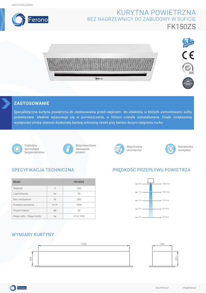 KARTA KATALOGOWA KURYTNA POWIETRZNA BEZ NAGRZEWNICY DO ZABUDOWY W SUFICIE FK150ZS GWARANCJA JAKOŚ CI ZASTOSOWANIE Specjalistyczna kurtyna powietrzna do zastosowania przed wejściem do obiektów, w których zamontowano sufity podwieszane. Idealnie wpasowuje się w pomieszczenie, w którym została zainstalowana. Dzięki zwiększonej wydajności silnika stanowi doskonałą barierę ochronną nawet przy bardzo dużym natężeniu ruchu Podwójna technologia bezpieczeństwa Bezprzewodowe sterowanie pilotem SPECYFIKACJA TECHNICZNA Model Niezawodny wentylator PRĘDKOŚĆ PRZEPŁYWU POWIETRZA FK150ZS Napięcie V Częstotliwość Hz 50 Moc wentylatora W 380 m3/h 1900 Poziom hałasu dB 55 Waga netto / Waga brutto kg 27,0 / 29,5 Przepływ powietrza Regulowana strumienica 0m 16,0 m/s 1m 10,0 m/s 2m 7,5 m/s 3m 6,0 m/s 4m 4,0 m/s 230 WYMIARY KURTYNY 235 320 235 1500 www.ferono.pl [email protected]