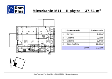 Mieszkanie M11 – II piętro – 37,51 m 2 Pomieszczenie Powierzchnia 1 Korytarz 7,38 m2 2 Łazienka 3,68 m2 3 Sypialnia 8,47 m2 4 Salon Kuchnia 17,98 m2 Suma Dom Plus Karol Pietryka tel 501 047 644, 535 992 272 www.domplus.net 37,51 m2