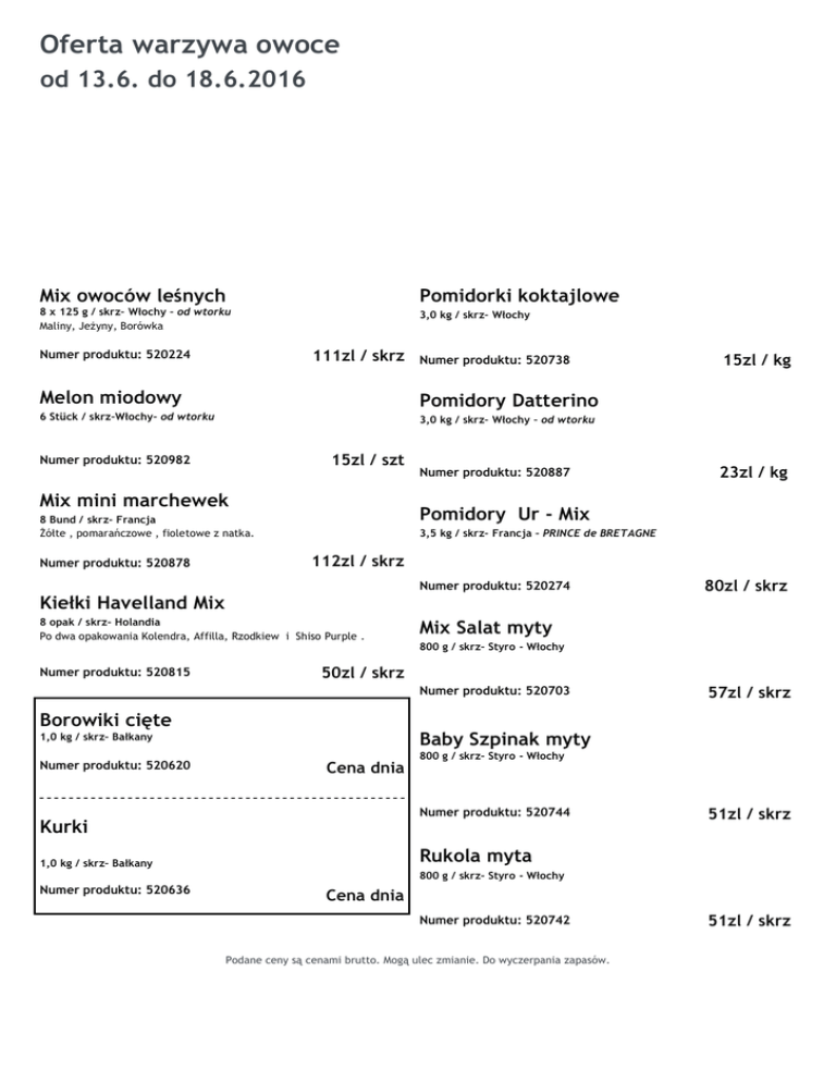 Oferta warzywa owoce od 13.6. do 18.6.2016 Mix owoców leśnych Pomidorki koktajlowe 8 x 125 g / skrz– Włochy – od wtorku Maliny, Jeżyny, Borówka 3,0 kg / skrz– Włochy 111zl / skrz Numer produktu: 520224 Numer produktu: 520738 Melon miodowy Pomidory Datterino 6 Stück / skrz–Włochy– od wtorku 3,0 kg / skrz– Włochy – od wtorku 15zl / szt Numer produktu: 520982 Mix mini marchewek 3,5 kg / skrz– Francja – PRINCE de BRETAGNE 112zl / skrz Numer produktu: 520274 Kiełki Havelland Mix 8 opak / skrz– Holandia Po dwa opakowania Kolendra, Affilla, Rzodkiew i Shiso Purple . Numer produktu: 520815 80zl / skrz Mix Salat myty 800 g / skrz– Styro - Włochy 50zl / skrz Numer produktu: 520703 Borowiki cięte 57zl / skrz Baby Szpinak myty 1,0 kg / skrz– Bałkany Numer produktu: 520620 23zl / kg Pomidory Ur - Mix 8 Bund / skrz– Francja Żółte , pomarańczowe , fioletowe z natka. Numer produktu: 520878 Numer produktu: 520887 15zl / kg Cena dnia 800 g / skrz– Styro - Włochy Numer produktu: 520744 Kurki 51zl / skrz Rukola myta 1,0 kg / skrz– Bałkany 800 g / skrz– Styro - Włochy Numer produktu: 520636 Cena dnia Numer produktu: 520742 Podane ceny są cenami brutto. Mogą ulec zmianie. Do wyczerpania zapasów. 51zl / skrz