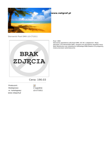 www.netgraf.pl Sterownik Pixel DMX LG-CT1011 Pixel DMX Sterownik oświetlenia LED Pixel DMX, DC 9V z adapterem. Może sterować 170 elementów DMX, używany do sterowania wysokiej mocy Wall Washerów oraz oświetlenia sufitowego RGB.Zawiera 24 programy, może pracować automatycznie. Cena: 190.03 Producent: Dostepnosc: 2 tygodnie nr. katalogowy: LG-CT1011 www.netgraf.pl