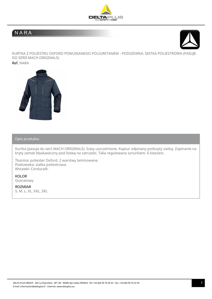 NARA KURTKA Z POLIESTRU OXFORD POWLEKANEGO POLIURETANEM - PODSZEWKA: SIATKA POLIESTROWA (PASUJE DO SERII MACH ORIGINALS) Ref. NARA Opis produktu Kurtka (pasuje do serii MACH ORIGINALS). Szwy uszczelnione. Kaptur odpinany podszyty siatką. Zapinanie na kryty zamek błyskawiczny pod listwą na zatrzaski. Talia regulowana sznurkiem. 6 kieszeni. Tkanina: poliester Oxford. 2 warstwy laminowane. Podszewka: siatka poliestrowa. Wstawki: Cordura®. KOLOR Granatowy ROZMIAR S, M, L, XL, XXL, 3XL DELTA PLUS GROUP - ZAC La Peyrolière - BP 140 - 84405 Apt cedex FRANCE- Tel.:+33 (0)4 90 74 20 33 - Fax :+33 (0)4 90 74 32 59 E-mail :[email protected] - Internet: www.deltaplus.eu 1 Zastosowanie - Zagrożenia Zimno / niepogoda Zużycie Rolnictwo / ogrodnictwo Rzemiosło Budownictwo / roboty publiczne Przemysł lekki Prace remontowe / Usługi / logistyka Zalety produktu + Korzyści dla użytkownika Kaptur odpinany Dekoracyjne paski odblaskowe z przodu i na rękawach Kieszonka na identyfikator w zestawie Uszczelnione zamki błyskawiczne Kurtka 3 w 1 z bluzą NAGOYA Wewnątrz otwór ułatwiający wykonanie nadruku DELTA PLUS GROUP - ZAC La Peyrolière - BP 140 - 84405 Apt cedex FRANCE- Tel.:+33 (0)4 90 74 20 33 - Fax :+33 (0)4 90 74 32 59 E-mail :[email protected] - Internet: www.deltaplus.eu 2 Certyfikaty - Normy DYREKTYWA ŚOI 89/686/EWG EN ISO 13688:2013 Ogóle wymagania dla odzieży EN343:2003 A1:2007 Odzież ochronna chroniąca przed złymi warunkami pogodowymi 3: odporność na przenikanie wody (od 1 do 3) 3: Oddychalność (od 1 do 3) Referencje + Ceny przy zakupie pełnego kartonu Referencje + Ceny przy zakupie pełnego kartonu Kod kreskowy KOLOR ROZMIAR NARABMPT 3295249200251 Granatowy S 5 - NARABMTM 3295249200268 Granatowy M 5 - NARABMGT 3295249200275 Granatowy L 5 - NARABMXG 3295249200282 Granatowy XL 5 - NARABMXX 3295249200299 Granatowy XXL 5 - NARABM3X 3295249200305 Granatowy 3XL 5 - DELTA PLUS GROUP - ZAC La Peyrolière - BP 140 - 84405 Apt cedex FRANCE- Tel.:+33 (0)4 90 74 20 33 - Fax :+33 (0)4 90 74 32 59 E-mail :[email protected] - Internet: www.deltaplus.eu 3