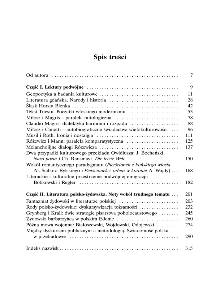 Spis treści Od autora . . . . . . . . . . . . . . . . . . . . . . . . . . . . . . . . . . . . . . . . . . . . . . . . . . . 7 Część I. Lektury podwójne . . . . . . . . . . . . . . . . . . . . . . . . . . . . . . . . . . . . . 9 Geopoetyka a badania kulturowe . . . . . . . . . . . . . . . . . . . . . . . . . . . . . . . . Literatura gdańska. Narody i historia . . . . . . . . . . . . . . . . . . . . . . . . . . . . Śląsk Horsta Bienka . . . . . . . . . . . . . . . . . . . . . . . . . . . . . . . . . . . . . . . . . . . Tekst Triestu. Początki włoskiego modernizmu . . . . . . . . . . . . . . . . . . . . Miłosz i Magris – paralela mitologiczna . . . . . . . . . . . . . . . . . . . . . . . . . . Claudio Magris: dialektyka harmonii i rozpadu . . . . . . . . . . . . . . . . . . . . Miłosz i Canetti – autobiograficzne świadectwa wielokulturowości . . . Musil i Roth. Ironia i nostalgia . . . . . . . . . . . . . . . . . . . . . . . . . . . . . . . . . Różewicz i Mann: paralela komparatystyczna . . . . . . . . . . . . . . . . . . . . . Melancholijne dialogi Różewicza . . . . . . . . . . . . . . . . . . . . . . . . . . . . . . . . Dwa przypadki kulturowego przekładu Owidiusza: J. Bocheński, Naso poeta i Ch. Ransmayr, Die letzte Welt . . . . . . . . . . . . . . . . . . . . . Wokół romantycznego paradygmatu (Pierścionek z końskiego włosia Al. Ścibora-Rylskiego i Pierścionek z orłem w koronie A. Wajdy) . . . Literackie i kulturalne przestrzenie podwójnej emigracji: Bobkowski i Regler . . . . . . . . . . . . . . . . . . . . . . . . . . . . . . . . . . . . . . . . 11 28 42 53 78 88 96 111 125 137 150 168 182 Część II. Literatura polsko-żydowska. Noty wokół trudnego tematu . . . 201 Fantazmat żydowski w literaturze polskiej . . . . . . . . . . . . . . . . . . . . . . . . Rody polsko-żydowskie: dyskursywizacja tożsamości . . . . . . . . . . . . . . . . Grynberg i Krall: dwie strategie pisarstwa poholocaustowego . . . . . . . . Żydowski barbarzyńca w polskim Edenie . . . . . . . . . . . . . . . . . . . . . . . . . Późna mowa wojenna: Białoszewski, Wojdowski, Odojewski . . . . . . . . . Między dyskursem publicznym a metodologią. Świadomość polska w przebudowie . . . . . . . . . . . . . . . . . . . . . . . . . . . . . . . . . . . . . . . . . . . . 203 232 245 260 274 Indeks nazwisk . . . . . . . . . . . . . . . . . . . . . . . . . . . . . . . . . . . . . . . . . . . . . . . . 315 290 Od autora Dwa wątki, ponieważ zebrane tu teksty zorganizowane są wokół dwóch podstawowych zagadnień: porównawczego czytania tekstów kultury (najczęściej literatury, ale nie tylko), po drugie zaś – kwestii polsko-żydowskich. Oba wątki mieszczą się znakomicie w myśleniu zorientowanym komparatystycznie; część I pt. Lektury podwójne już w tytule to zapowiada i konsekwentnie realizuje, wątek polsko-żydowski, właśnie dlatego, że jest polsko-żydowski to kryterium spełnia (część II książki). W pierwszej części zajmuję się porównawczym czytaniem tekstów literackich, plastycznych i filmowych, w drugiej natomiast porównawczym traktowaniem kultury polskiej i żydowskiej, które we wszystkich tekstach pozostają w stałym – niełatwym – dialogu. Nie zajmuje mnie w nich ani czysta kultura polska, ani czysta kultura żydowska, interesujące jest pogranicze polsko-żydowskie, tak dla obu kultur trudne, a zarazem bardzo płodne. W tym sensie książka ma charakter komparatystyczny, kategorią najczęściej występującą jest różnica i jej pochodne, która – jeśli nie jest fetyszyzowana – prowadzi do jakiegoś poziomu porozumienia, a nie usztywnienia odmienności. Całość jest też potwierdzeniem tez wysuwanych przeze mnie we wstępie do podręcznika pt. Komparatystyka dla humanistów, którego opracowanie zainicjowałem, a potem całość zredagowałem (wydany w WUW w 2011 r.). Mówiłem tam o komparatystyce jako odpowiedzi na postępującą globalizację świata, zwracałem uwagę na ważność różnicy kulturowej, kontekstowy charakter dzisiejszej refleksji nad zjawiskami życia duchowego, na rozwój analitycznych praktyk kulturowych, w których element porównywania i różnicowania jest niezwykle istotny. Wreszcie wspominałem o korzyściach płynących z porównawczego badania literatury i artefaktów kultury, które pozwalają rozpoznać wartości rodzimego dorobku, nie ulegać modom, rozeznać się lepiej w swoim dziedzictwie zarazem poznając inne kultury. Takie nastawienie pozwala także na wprowadzenie tekstów polskich w obieg międzynarodowego dyskursu filozoficznego i estetycznego. Interdyscyplinarność, pluralizm stanowisk i tekstów, stała autorefleksja dopełniają ten obraz. Na koniec trzeba 8 Od autora wspomnieć o polityczności komparatystyki, tzn. o takim myśleniu w badaniach literacko-kulturowych, którym zawsze towarzyszy myśl, że nie są one zawieszone w próżni, lecz funkcjonują w określonej przestrzeni społecznej, odnoszą się do jakiegoś świata i skierowane są do wiadomego odbiorcy. W ten sposób dzieła artystyczne utwierdzają określone kody dyskursu społecznego, ale też inicjują nowe jego kierunki i odmiany. Mam nadzieję, że zawarte tu artykuły realizują te założenia i oczekiwania. Wprawdzie wszystkie teksty były (lub wkrótce będą) publikowane, lecz dziś prace z zakresu humanistyki wydawane są w tak niewielkich nakładach, że przy kulejącej dystrybucji nie ma obaw o powtórzenie i nadobecność. Oczywiście, jak zawsze w takich okolicznościach, poszczególne teksty zostały przejrzane i wewnętrznie uzgodnione, choć pewnych powtórzeń nie da się uniknąć. M.D.