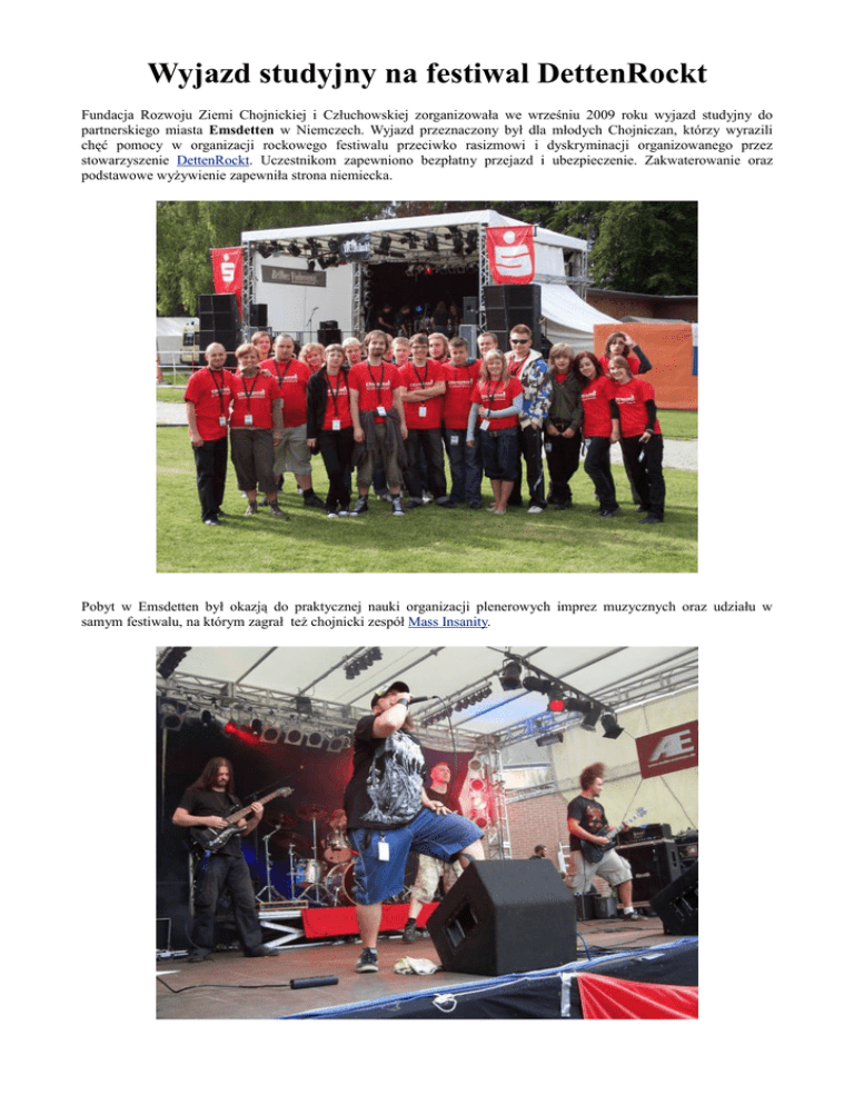 Wyjazd studyjny na festiwal DettenRockt Fundacja Rozwoju Ziemi Chojnickiej i Człuchowskiej zorganizowała we wrześniu 2009 roku wyjazd studyjny do partnerskiego miasta Emsdetten w Niemczech. Wyjazd przeznaczony był dla młodych Chojniczan, którzy wyrazili chęć pomocy w organizacji rockowego festiwalu przeciwko rasizmowi i dyskryminacji organizowanego przez stowarzyszenie DettenRockt. Uczestnikom zapewniono bezpłatny przejazd i ubezpieczenie. Zakwaterowanie oraz podstawowe wyżywienie zapewniła strona niemiecka. Pobyt w Emsdetten był okazją do praktycznej nauki organizacji plenerowych imprez muzycznych oraz udziału w samym festiwalu, na którym zagrał też chojnicki zespół Mass Insanity. Zadaniem uczestników była pomoc organizatorom festiwalu - młodzieży skupionej wokół stowarzyszenia Dettenrockt w pracach przygotowawczych, patrolowaniu terenu podczas imprezy i pracach porządkowych po jej zakończeniu. Członkowie Dettenrock zorganizowali też spotkanie w lokalnym centrum młodzieżowym, podczas którego opowiadali o tym jak organizowany jest festiwalu oraz w jaki sposób powstało i działa ich stowarzyszenie. Festiwal odbył się 12 września 2009. Wyjazd trwał od 9 do 14 września. W programie wizyty znalazło się też spotkanie z panią Anneliese Meyer zu Altenschildesche, Zastępcą Burmistrza Emsdetten. Jako, że wśród wyjeżdżających była chojnicka bibliotekarka - Wioletta Karpiak, niejako przy okazji odbyła się wymiana książek dla dzieci i młodzieży pomiędzy bibliotekami z Chojnic i Emsdetten. Przez okres kilku miesięcy polskojęzyczne książki były dostępne w Emsdetten, a niemieckojęzyczne w Chojnicach. Rozpoczęło to regularną współpracę obu placówek. Wyjazd studyjny organizowała Fundacja Rozwoju Ziemi Chojnickiej i Człuchowskiej w ramach projektu dofinansowanego ze środków Fundacji Współpracy Polsko-Niemieckiej i Urzędu Miejskiego w Chojnicach.