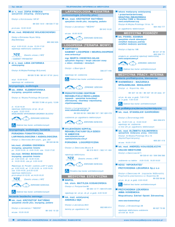 n dr n. med. ZOFIA RYBICKA specjalista alergolog, otolaryngolog LARYNGOLOGIA, PEDIATRIA pulmonologia (choroby p³uc) n lek. Olsztyn ul.Ko³obrzeska 13F/37 89 533 10 61 / 89 533 77 32 med. KRZYSZTOF RATYÑSKI specjalista chorób p³uc, laryngolog, pediatra n lek. med. IRENEUSZ WOJCIECHOWSKI 89 543 10 22 ZDROWIE DZIECKA 695 502 525 LOGOPEDIA (TERAPIA MOWY) n CERTUSVIA GABINET LOGOPEDII I NEUROLOGOPEDII www.certusvia.pl Zawarta umowa z NFZ mgr MARTA CHODYKO-GILAS i GABINET PRYWATNY specjalista diagnozy i terapii zaburzeñ mowy u dzieci, m³odzie¿y i doros³ych l dr n. med. LIDIA ZATORSKA otolaryngolog Olsztyn Al.Wojska Polskiego 39 (Lancet) 89 535 72 80 / 89 541 97 81 (dom) Gabinet bez barier architektonicznych ZDROWIE DZIECKA ANNA KLEMENTOWSKA 89 535 72 80 od godz. 12.00 r. 15.30-16.30 rejestracja telefoniczna od pn. do pt. w godz. 12.00-19.00 MO¯LIWOÆ WYKONANIA BADANIA S£UCHU ZDROWIE DZIECKA Olsztyn ul.Gêbika 10B 89 541 27 05 602 356 771 przyjêcia po uprzedniej rejestracji telefonicznej www.nzozpieczewo.pl ZDROWIE DZIECKA Gabinet bez barier architektonicznych badania profilaktyczne, kierowców n WARMIÑSKO - MAZURSKA SPÓ£DZIELNIA INWALIDÓW Olsztyn ul. Kopernika 46a 89 527 43 48 / 89 527 30 22 wew. 37 REHABILITACJI REHO-LANDIA logopeda - specjalista komunikacji alternatywnej, rewalidacji indywidualnej, oligofrenopedagog 89 533 02 92 / 608 380 107 / 501 634 472 codziennie po uzgodnieniu telefonicznym Gabinet bez barier architektonicznych PORADNIA FONIATRYCZNA, LARYNGOLOGICZNA I AUDIOLOGICZNA Olsztyn ul. Dworcowa 28 II piêtro, gab. 207 89 533 66 96 lek.med. JOANNA OSOWSKA n WOJEWÓDZKI SZPITAL wt.czw. 16.00-17.00 med. KRZYSZTOF RATYÑSKI Olsztyn ul.Janowicza 1 "MEDYK" 89 543 10 22 n lek. med. ANDRZEJ KO£ODZIEJCZYK US£UGI MEDYCZNE codziennie na telefon ZDROWIE DZIECKA 8.00-13.00, 16.00-18.00 n NZOZ HIPOKRATES PRZYCHODNIA LEKARSKA Sp.z o.o Poradnia bez barier architektonicznych MEDYCYNA ESTETYCZNA lek. stom. MATYLDA KOSAKOWSKA Olsztyn ul. Partyzantów 80 89 535 12 77 / 609 975 035 rejestracja tel. od pn. do pt. w godz. 8.00-18.00 med. estetycznej ANDRZEJ SÊK INFORMACJA ROZSZERZONA W OG£OSZENIU RAMKOWYM Gabinet bez barier architektonicznych n PRZYCHODNIA LEKARSKA ANNA KOWENICKA www.nzoz-kowenicka.pl Olsztyn ul.Janowicza 26/2 terminy po uzgodnieniu tel. Olsztyn ul.Dworcowa 4A (naprzeciw McDonalds) Przychodnia przeniesiona z ul. Kopernika 30 89 533 56 62 od pn. do pt. w godz. 8.00-18.00 Niepubliczny Zak³ad Opieki Zdrowotnej n lek. specjalista chorób p³uc, laryngolog, pediatra 605 201 410 Olsztyn ul.Dworcowa 8/71 89 533 61 03 / 509 596 563 n BINPOL leczenie bezdechu sennego 604 236 674 pn. 10.00-11.00, r. 15.00-16.30 rejestracja tel. codziennie w inne dni po uzgodnieniu telefonicznym PORADNIA LOGOPEDYCZNA Zawarta umowa z NFZ Gabinet bez barier architektonicznych Olsztyn ul.¯eromskiego 24D Olsztyn Al.Wojska Polskiego 35 p.16 (Szpital Psychiatryczny) rejestracja telefoniczna ZDROWIE DZIECKA med. STANIS£AW GAWROÑSKI www.ameryka.com.pl [email protected] lek.med. IWONA BOGUCKA Zawarta umowa z NFZ n lek. specjalista medycyny pracy, internista Olsztyn ul. Dworcowa 28 pok. 8 89 519 48 01 / 502 141 404 Rejestracja do Poradni: osobista p.227 II piêtro pn. 8.30-14.00, wt. 11.30-16.00, r. 8.00-14.00, czw. 8.00-14.00, pt.8.30-13.00 rejestracja telefoniczna pn.r.czw.pt.10-12.00, wt.14.00-16.00 Gabinet bez barier architektonicznych n lek. med. EL¯BIETA KALINOWSKA REHABILITACYJNY DLA DZIECI W AMERYCE laryngolog, specjalista foniatra pn. 12.00-15.00, r. 8.00-13.00, czw. 10.00-17.00 laryngolog, specjalista foniatra pn. 9.00-12.00, wt. 12.30-15.00, r. 14.00-18.00, czw.,pt. 9.00-14.00 od pn. do czw. w godz. 7.00-17.00 pt. w godz. 7.00-15.00 bad. profilaktyczne,kierowców,internistyczne Olsztyn ul.Lengowskiego 19 www.reholandia.olsztyn.pl ZDROWIE DZIECKA laryngologia, audiologia, foniatria MEDYCYNA PODRÓ¯Y PAWE£ ADAMUS specjalista chorób dzieciêcych certyfikat medycyny podró¿y certyfikat medycyny sportowej n PEDIATRYCZNE CENTRUM Olsztyn al. Wojska Polskiego 39 (Lancet) n n lek. 604 492 777 MEDYCYNA PRACY, INTERNA rejestracja tel. codziennie laryngologia, audiologia wt.czw. 16.00-18.00 po uzgodnieniu telefonicznym 506 377 440 rejestracja tel. codziennie n lek. Certyfikat PSME w Warszawie www.certyfikowani.org Olsztyn ul.Boenigka 9 wt.pt. 15.00-16.00 laryngolog, specjalista audiolog medycyny estetycznej i przeciwstarzeniowej GRA¯YNA ¯MUDZIÑSKA wt.czw. 16.00-18.00 Olsztyn ul.¯o³nierska 18 pok.106 Ip. (Szp.Dzieciêcy) wt.pt. 8.00-10.00, r.czw. 15.30-17.00 rejestracja telefoniczna codziennie n lekarz Olsztyn Al.Wojska Polskiego 19 lok. 10 Olsztyn ul.Janowicza 1 "MEDYK" pn.r.czw. 12.00-18.00 n lek. 31 TELEFONICZNA INFORMACJA MEDYCZNA Tel. 194-34 602 605 614 Olsztyn, ul.G³owackiego 28 rejestracja telefoniczna codziennie od 8.00 do 16.00 89 527 73 93 www.InformacjaMedyczna.olsztyn.pl