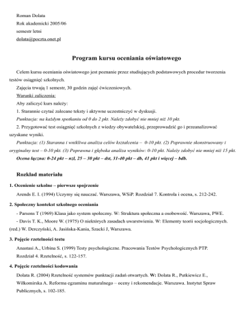 Roman Dolata Rok akademicki 2005/06 semestr letni [email protected] Program kursu oceniania oświatowego Celem kursu oceniania oświatowego jest poznanie przez studiujących podstawowych procedur tworzenia testów osiągnięć szkolnych. Zajęcia trwają 1 semestr, 30 godzin zajęć ćwiczeniowych. Warunki zaliczenia: Aby zaliczyć kurs należy: 1. Starannie czytać zalecane teksty i aktywne uczestniczyć w dyskusji. Punktacja: na każdym spotkaniu od 0 do 2 pkt. Należy zdobyć nie mniej niż 10 pkt. 2. Przygotować test osiągnięć szkolnych z wiedzy obywatelskiej, przeprowadzić go i przeanalizować uzyskane wyniki. Punktacja: (1) Staranna i wnikliwa analiza celów kształcenia – 0-10 pkt. (2) Poprawnie skonstruowany i oryginalny test – 0-10 pkt. (3) Poprawna i głęboka analiza wyników: 0-10 pkt. Należy zdobyć nie mniej niż 15 pkt. Ocena łączna: 0-24 pkt – nzl, 25 – 30 pkt – dst, 31-40 pkt – db, 41 pkt i więcej – bdb. Rozkład materiału 1. Ocenienie szkolne – pierwsze spojrzenie Arends E. I. (1994) Uczymy się nauczać. Warszawa, WSiP. Rozdział 7. Kontrola i ocena, s. 212-242. 2. Społeczny kontekst szkolnego oceniania - Parsons T (1969) Klasa jako system społeczny. W: Struktura społeczna a osobowość. Warszawa, PWE. - Davis T. K., Moore W. (1975) O niektórych zasadach uwarstwienia. W: Elementy teorii socjologicznych. (red.) W. Derczyński, A. Jasińska-Kania, Szacki J, Warszawa. 3. Pojęcie rzetelności testu Anastasi A., Urbina S. (1999) Testy psychologiczne. Pracowania Testów Psychologicznych PTP. Rozdział 4. Rzetelność, s. 122-157. 4. Pojęcie rzetelności kodowania Dolata R. (2004) Rzetelność systemów punktacji zadań otwartych. W: Dolata R., Putkiewicz E., Wiłkomirska A. Reforma egzaminu maturalnego – oceny i rekomendacje. Warszawa. Instytut Spraw Publicznych, s. 102-185. 5. Pojęcie trafności testu Anastasi A., Urbina S. (1999) Testy psychologiczne. Pracowania Testów Psychologicznych PTP. Rozdział 5. Trafność: podstawowe pojęcia, 158-191. 6. Analiza pozycji testowych Anastasi A., Urbina S. (1999) Testy psychologiczne. Pracowania Testów Psychologicznych PTP. Rozdział 7. Analiza pozycji testowych, 233-271. 7. System egzaminów zewnętrznych w Polsce – opis Materiały na stronie WWW Centralnej Komisji Egzaminacyjnej, www.cke.edu.pl 8. System egzaminów zewnętrznych w Polsce – analiza konsekwencji - Konarzewski K. (2004) Reforma oświaty. Warszawa, Instytut Spraw Publicznych. Rozdział 3. Egzaminy – co mówią o uczniu i szkole, s. 126-181. - Dolata R. Rynek szkół publicznych, segregacje społeczne i nierówności edukacyjne – studium przypadku (2005) Maszynopis, www.dolata.republika.pl. 9. Międzynarodowe badania osiągnięć szkolnych – PISA/OECD 2000 i 2003 - Białecki I., Haman J. (2002) Program Międzynarodowej Oceny Umiejętności Uczniów OECD/PISA. Wyniki polskie, raport z badań, 54 strony. - Program Międzynarodowej Oceny Umiejętności Uczniów OECD/PISA. Wyniki badania 2003 w Polsce (2004), 40 stron. 10. Międzynarodowe badania osiągnięć szkolnych – Civic Educational Study IEA Dolata R., Koseła K., Wiłkomirska A., Zielińska A. (2004) Młodzi obywatele. Wyniki międzynarodowych badań młodzieży. Wydawnictwa Uniwersytetu Warszawskiego. Rozdziały 1-3, s. 9-60. 11. Międzynarodowe badania osiągnięć szkolnych – Civic Educational Study IEA, cd Dolata R., Koseła K., Wiłkomirska A., Zielińska A. (2004) Młodzi obywatele. Wyniki międzynarodowych badań młodzieży. Wydawnictwa Uniwersytetu Warszawskiego. Rozdziały 6, 7, s. 99-161. 12. Monitorowanie osiągnięć szkolnych Dolata R., Murawska B., Putkiewicz E., Żytko M. (1997) Monitorowanie osiągnięć szkolnych jako metoda doskonalenia edukacji. Zarys metody oraz przykłady zastosowań w edukacji początkowej. Warszawa, Wydawnictwo Żak, rozdział III, s. 103-134. 13. Edukacyjna wartość dodana Jakubowski M. (2006) Metody szacowania edukacyjnej wartości dodanej. Maszynopis, www.dolata.republika.pl. 2