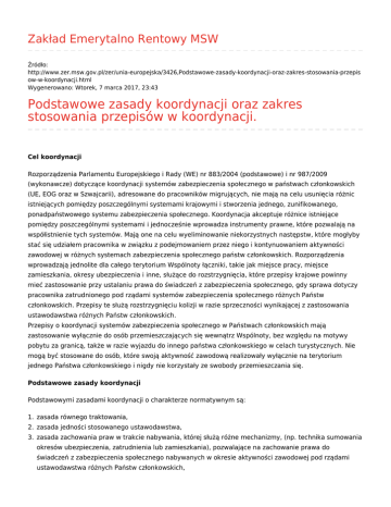 Zakład Emerytalno Rentowy MSW Źródło: http://www.zer.msw.gov.pl/zer/unia-europejska/3426,Podstawowe-zasady-koordynacji-oraz-zakres-stosowania-przepis ow-w-koordynacji.html Wygenerowano: Wtorek, 7 marca 2017, 23:43 Podstawowe zasady koordynacji oraz zakres stosowania przepisów w koordynacji. Cel koordynacji Rozporządzenia Parlamentu Europejskiego i Rady (WE) nr 883/2004 (podstawowe) i nr 987/2009 (wykonawcze) dotyczące koordynacji systemów zabezpieczenia społecznego w państwach członkowskich (UE, EOG oraz w Szwajcarii), adresowane do pracowników migrujących, nie mają na celu usunięcia różnic istniejących pomiędzy poszczególnymi systemami krajowymi i stworzenia jednego, zunifikowanego, ponadpaństwowego systemu zabezpieczenia społecznego. Koordynacja akceptuje różnice istniejące pomiędzy poszczególnymi systemami i jednocześnie wprowadza instrumenty prawne, które pozwalają na współistnienie tych systemów. Mają one na celu wyeliminowanie niekorzystnych następstw, które mogłyby stać się udziałem pracownika w związku z podejmowaniem przez niego i kontynuowaniem aktywności zawodowej w różnych systemach zabezpieczenia społecznego państw członkowskich. Rozporządzenia wprowadzają jednolite dla całego terytorium Wspólnoty łączniki, takie jak miejsce pracy, miejsce zamieszkania, okresy ubezpieczenia i inne, służące do rozstrzygnięcia, które przepisy krajowe powinny mieć zastosowanie przy ustalaniu prawa do świadczeń z zabezpieczenia społecznego, gdy sprawa dotyczy pracownika zatrudnionego pod rządami systemów zabezpieczenia społecznego różnych Państw członkowskich. Przepisy te służą rozstrzygnięciu kolizji w razie sprzeczności wynikającej z zastosowania ustawodawstwa różnych Państw członkowskich. Przepisy o koordynacji systemów zabezpieczenia społecznego w Państwach członkowskich mają zastosowanie wyłącznie do osób przemieszczających się wewnątrz Wspólnoty, bez względu na motywy pobytu za granicą, także w razie wyjazdu do innego państwa członkowskiego w celach turystycznych. Nie mogą być stosowane do osób, które swoją aktywność zawodową realizowały wyłącznie na terytorium jednego Państwa członkowskiego i nigdy nie korzystały ze swobody przemieszczania się. Podstawowe zasady koordynacji Podstawowymi zasadami koordynacji o charakterze normatywnym są: 1. zasada równego traktowania, 2. zasada jedności stosowanego ustawodawstwa, 3. zasada zachowania praw w trakcie nabywania, której służą różne mechanizmy, (np. technika sumowania okresów ubezpieczenia, zatrudnienia lub zamieszkania), pozwalające na zachowanie prawa do świadczeń z zabezpieczenia społecznego nabywanych w okresie aktywności zawodowej pod rządami ustawodawstwa różnych Państw członkowskich, 4. zasada zachowania praw nabytych, której zasadniczą treścią jest uchylenie krajowych klauzul terytorialnych i ustanowienie możliwości transferu świadczeń. Zakres podmiotowy rozporządzenia (WE) nr 883/2004 Niniejsze rozporządzenie stosuje się: 1. do obywateli Państwa członkowskiego, bezpaństwowców i uchodźców mieszkających w Państwie członkowskim, którzy podlegają lub podlegali ustawodawstwu jednego lub kilku Państw członkowskich oraz do członków ich rodzin i osób pozostałych przy życiu ; 2. do osób pozostałych przy życiu po osobach zmarłych, które podlegały ustawodawstwu jednego lub kilku Państw członkowskich, niezależnie od obywatelstwa tych osób, o ile pozostali przy życiu są obywatelami jednego z Państw członkowskich lub bezpaństwowcami, lub uchodźcami, zamieszkującymi na terytorium jednego z Państw członkowskich. Określenie „uchodźca” ma znaczenie nadane mu art. 1 Konwencji dotyczącej statusu uchodźców, sporządzonej w Genewie, dnia 28 lipca 1951. Określenie „bezpaństwowiec” ma znaczenie nadane mu art. 1 Konwencji dotyczącej statusu bezpaństwowców, sporządzonej systemów Nowym Jorku, dnia 28 września 1954 r. Koordynacją systemów zabezpieczenia społecznego są objęci między innymi: żołnierze zawodowi, funkcjonariusze Policji (Milicji Obywatelskiej), Agencji Bezpieczeństwa Wewnętrznego, Agencji Wywiadu, Służby Kontrwywiadu Wojskowego, Służby Wywiadu Wojskowego, Urzędu Ochrony Państwa (organów bezpieczeństwa publicznego), Centralnego Biura Antykorupcyjnego, Straży Granicznej, Biura Ochrony Rządu, Państwowej Straży Pożarnej, Służby Więziennej, oraz sędziowie i prokuratorzy, emeryci i renciści oraz członkowie ich rodzin. Zakres przedmiotowy rozporządzenia (WE) nr 883/2004 Niniejsze rozporządzenie stosuje się do całego ustawodawstwa odnoszącego się do następujących działów zabezpieczenia społecznego: 1. świadczeń z tytułu choroby, 2. świadczeń z tytułu macierzyństwa i równoważnych świadczeń dla ojca, 3. świadczeń z tytułu inwalidztwa, 4. świadczeń z tytułu starości, 5. rent rodzinnych, 6. świadczeń z tytułu wypadków przy pracy i choroby zawodowej, 7. zasiłków na wypadek śmierci, 8. świadczeń dla bezrobotnych, 9. świadczeń przedemerytalnych, 10. świadczeń rodzinnych. Przepisy o koordynacji stosuje się do ogólnych i specjalnych systemów zabezpieczenia społecznego. System specjalny dla urzędników służby cywilnej (funkcjonariuszy państwowych) Zgodnie z przepisami o koordynacji „specjalny system dla urzędników służby cywilnej” oznacza każdy system zabezpieczenia społecznego, który różni się od powszechnego systemu zabezpieczenia społecznego stosowanego do pracowników najemnych w danym Państwie członkowskim i któremu podlegają bezpośrednio wszystkie lub niektóre kategorie urzędników służby cywilnej lub osób traktowanych na równi z nimi. Zgodnie z definicją zawartą w przepisach o koordynacji, polskimi systemami specjalnymi dla urzędników służby cywilnej są systemy zaopatrzenia emerytalnego żołnierzy zawodowych, funkcjonariuszy Policji (Milicji Obywatelskie