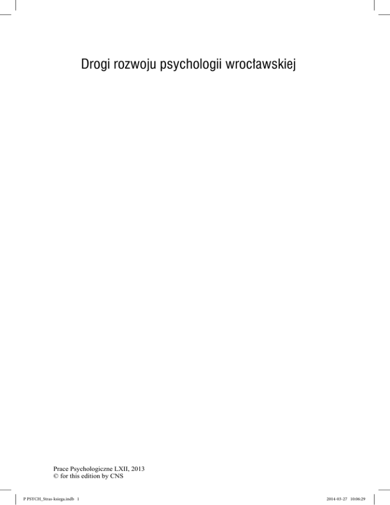 Drogi rozwoju psychologii wroc³awskiej Prace Psychologiczne LXII, 2013 © for this edition by CNS P PSYCH_Stras-ksiega.indb 1 2014-03-27 10:06:29 Acta Universitatis Wratislaviensis No 3546 Prace Psychologiczne LXII, 2013 © for this edition by CNS P PSYCH_Stras-ksiega.indb 2 2014-03-27 10:06:29 Prace Psychologiczne LXII Drogi rozwoju psychologii wroc³awskiej Tom jubileuszowy z okazji 45-lecia studiów psychologicznych w Uniwersytecie Wroc³awskim Pod redakcj¹ Marii Straœ-Romanowskiej Wroc³aw 2013 Wydawnictwo Uniwersytetu Wroc³awskiego Prace Psychologiczne LXII, 2013 © for this edition by CNS P PSYCH_Stras-ksiega.indb 3 2014-03-27 10:06:29 Recenzenci Zenon W. Dudek Barbara Harwas-Napierała Zygfryd A. Juczyński Hanna Liberska Tadeusz Listwan Eugenia Mandal Wojciech Otrębski Władysław J. Paluchowski Ryszard Stachowski Redaktor Serii Danuta Borecka-Biernat Praca sfinansowana przez Instytut Psychologii Uniwersytetu Wrocławskiego Ilustracja na okładce: © matju — 123rf.com © Copyright by Wydawnictwo Uniwersytetu Wrocławskiego Sp. z o.o. Wrocław 2013 ISSN 0239-6661 (AUWr) ISSN 0137-110X (PP) ISBN 978-83-229-3415-9 Publikacja przygotowana w Wydawnictwie Uniwersytetu Wrocławskiego Sp. z o.o. 50-137 Wrocław, pl. Uniwersytecki 15 tel. 71 3752885, e-mail: [email protected] Prace Psychologiczne LXII, 2013 © for this edition by CNS P PSYCH_Stras-ksiega.indb 4 2014-03-27 10:06:29 Spis treœci Wprowadzenie (Maria STRAŚ-ROMANOWSKA) . . . . . . . . . . . . . . . . . . . . . . . . . . . . . . . . . . . . . 7 Czêœæ I. Psychologia wroc³awska dawniej i dziœ Bogna BARTOSZ, Alicja KEPLINGER, Przemysław NOWICKI, Kierunki rozwoju wrocławskiej psychologii 2001–2011: historia, teraźniejszość, perspektywy . . . . . . . . . . . . . . . . . . . . Izabela INDEKA, Kiriakos CHATZIPENTIDIS, Biblioteka Instytutu Psychologii Uniwersytetu Wrocławskiego w latach 1972–2012 . . . . . . . . . . . . . . . . . . . . . . . . . . . . . . . . . . . . . . . . . Henryk JAROSIEWICZ, Czynności i wytwory jako przedmiot psychologii w szkole lwowskiej i wrocławskiej . . . . . . . . . . . . . . . . . . . . . . . . . . . . . . . . . . . . . . . . . . . . . . . . . . . . . . . . . Maria PORĘBSKA, Rozwój psychiczny człowieka. Koncepcja funkcjonalna . . . . . . . . . . . . . . Maria STRAŚ-ROMANOWSKA, Jakość życia w poglądach przedstawicieli psychologii wrocławskiej. Między tradycją a współczesnością . . . . . . . . . . . . . . . . . . . . . . . . . . . . . . . . Urszula DĘBSKA, Bogna BARTOSZ, Halina GUŁA-KUBISZEWSKA, Wojciech STAROŚCIAK, Aureliusz KOSENDIAK, Badania porównawcze kwestionariuszami jakości życia . . . . . 15 45 57 79 95 109 Czêœæ II. Kontynuacja dyskursu — dawne problemy w nowych badaniach Stanisław A. WITKOWSKI, Dorota KANAFA-CHMIELEWSKA, W trosce o podnoszenie efektywności menedżerów i organizacji — badania wrocławskich psychologów zarządzania . . . Dorota KANAFA-CHMIELEWSKA, Zachowania obywatelskie w organizacji. Istota, znaczenie i pomiar zjawiska . . . . . . . . . . . . . . . . . . . . . . . . . . . . . . . . . . . . . . . . . . . . . . . . . . . . . . . Katarzyna DURNIAT, Mobbing w miejscu pracy: zarys tradycji badawczej, podstawowe założenia, metodologia i wybrane wyniki badań własnych . . . . . . . . . . . . . . . . . . . . . . . . . . Anna OLESZKOWICZ, Bunt młodzieńczy wczoraj i dzisiaj. Perspektywa dziesięciu lat . . . . . Bożena JANDA-DĘBEK, Rozpoznawanie kłamców i innych osób o cechach niepożądanych społecznie . . . . . . . . . . . . . . . . . . . . . . . . . . . . . . . . . . . . . . . . . . . . . . . . . . . . . . . . . . . . . Danuta BORECKA-BIERNAT, Kwestionariusz strategii radzenia sobie rodziców w sytuacjach konfliktu społecznego w percepcji dziecka . . . . . . . . . . . . . . . . . . . . . . . . . . . . . . . . . . . Kinga LACHOWICZ-TABACZEK, Justyna ŚNIECIŃSKA, Samoocena jako monitor zdolności do działania i radzenia sobie — nowe spojrzenie na źródła i funkcje samooceny . . . . . . . . Zbigniew ŁOŚ, Alicja SENEJKO, Doświadczanie globalizacji diagnozowane Kwestionariuszem Świat-Ja a style tożsamości młodzieży . . . . . . . . . . . . . . . . . . . . . . . . . . . . . . . . . . Ryszard POPRAWA, Pić czy nie pić na drodze do szczęścia? . . . . . . . . . . . . . . . . . . . . . . . . . . 127 163 175 191 209 223 247 267 293 Prace Psychologiczne LXII, 2013 © for this edition by CNS P PSYCH_Stras-ksiega.indb 5 2014-03-27 10:06:29 6 Spis treœci Czêœæ III. Nowe obszary badañ Urszula DĘBSKA, Niepełnosprawność i rehabilitacja z nieco innej perspektywy . . . . . . . . . . . Anna SZEMPLIŃSKA, Fundacja L’Arche. Spotkanie z Innym w domach L’Arche — od wykluczenia do więzi . . . . . . . . . . . . . . . . . . . . . . . . . . . . . . . . . . . . . . . . . . . . . . . . . . . . . . . . . Dorota CHMIELEWSKA-ŁUCZAK, Kinga BIERWIACZONEK, Matylda SIUTA-BRODZIŃSKA, Moratorium on-line. Internet jako przestrzeń eksperymentowania z tożsamością . . . . . . . . Magdalena ŻURKO, Zarażanie się objawami depresyjnymi przez nastoletnich przyjaciół. Perspektywa jakościowa . . . . . . . . . . . . . . . . . . . . . . . . . . . . . . . . . . . . . . . . . . . . . . . . . . . . Ewa KALECIŃSKA-ADAMCZYK, Odtwarzanie i budowanie relacji w procesach komunikacji dialogowej i monologowej. Teoretyczne i metodologiczne podejścia badawcze. . . . . . . Katarzyna SERAFIŃSKA, Bogusława BŁOCH, Problematyka płci i różnic płciowych. W stronę kontekstualnego rozumienia płci . . . . . . . . . . . . . . . . . . . . . . . . . . . . . . . . . . . . . . . . . . . Krystyna WĘGŁOWSKA-RZEPA, Psychologia analityczna i jej zastosowanie w praktyce i w badaniach własnych . . . . . . . . . . . . . . . . . . . . . . . . . . . . . . . . . . . . . . . . . . . . . . . . . . . . . . . . . Olga BĄK, Udzielanie informacji zwrotnych w diagnozie psychologicznej — doświadczenia zawodowe psychologów praktyków . . . . . . . . . . . 