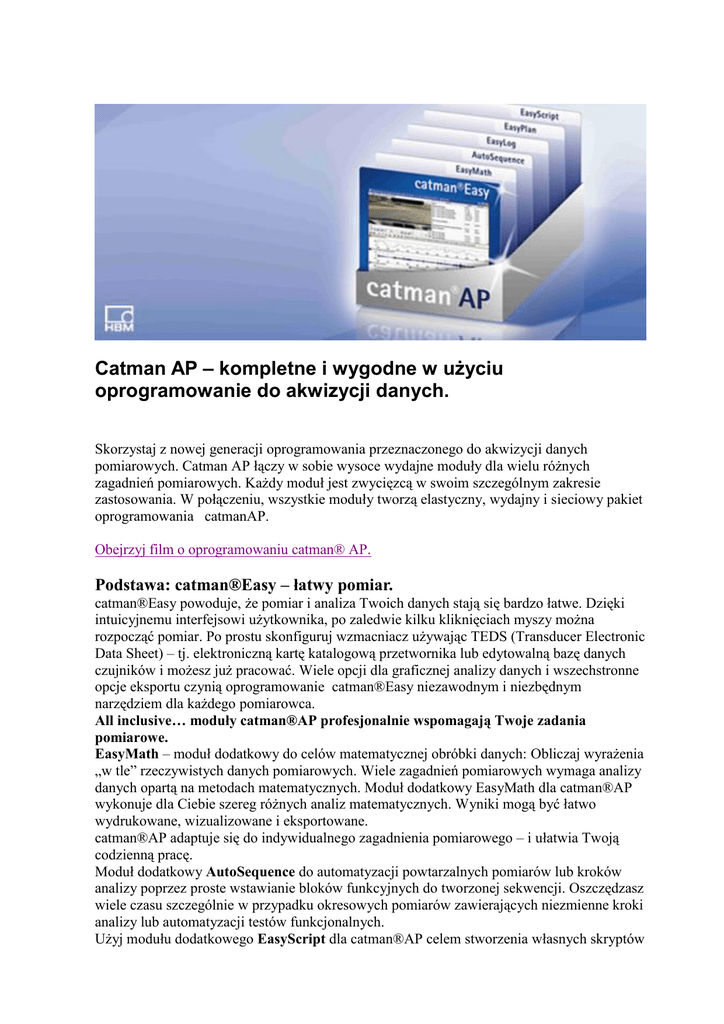 Catman AP – kompletne i wygodne w użyciu oprogramowanie do akwizycji danych. Skorzystaj z nowej generacji oprogramowania przeznaczonego do akwizycji danych pomiarowych. Catman AP łączy w sobie wysoce wydajne moduły dla wielu różnych zagadnień pomiarowych. Każdy moduł jest zwycięzcą w swoim szczególnym zakresie zastosowania. W połączeniu, wszystkie moduły tworzą elastyczny, wydajny i sieciowy pakiet oprogramowania catmanAP. Obejrzyj film o oprogramowaniu catman® AP. Podstawa: catman®Easy – łatwy pomiar. catman®Easy powoduje, że pomiar i analiza Twoich danych stają się bardzo łatwe. Dzięki intuicyjnemu interfejsowi użytkownika, po zaledwie kilku kliknięciach myszy można rozpocząć pomiar. Po prostu skonfiguruj wzmacniacz używając TEDS (Transducer Electronic Data Sheet) – tj. elektroniczną kartę katalogową przetwornika lub edytowalną bazę danych czujników i możesz już pracować. Wiele opcji dla graficznej analizy danych i wszechstronne opcje eksportu czynią oprogramowanie catman®Easy niezawodnym i niezbędnym narzędziem dla każdego pomiarowca. All inclusive… moduły catman®AP profesjonalnie wspomagają Twoje zadania pomiarowe. EasyMath – moduł dodatkowy do celów matematycznej obróbki danych: Obliczaj wyrażenia „w tle” rzeczywistych danych pomiarowych. Wiele zagadnień pomiarowych wymaga analizy danych opartą na metodach matematycznych. Moduł dodatkowy EasyMath dla catman®AP wykonuje dla Ciebie szereg różnych analiz matematycznych. Wyniki mogą być łatwo wydrukowane, wizualizowane i eksportowane. catman®AP adaptuje się do indywidualnego zagadnienia pomiarowego – i ułatwia Twoją codzienną pracę. Moduł dodatkowy AutoSequence do automatyzacji powtarzalnych pomiarów lub kroków analizy poprzez proste wstawianie bloków funkcyjnych do tworzonej sekwencji. Oszczędzasz wiele czasu szczególnie w przypadku okresowych pomiarów zawierających niezmienne kroki analizy lub automatyzacji testów funkcjonalnych. Użyj modułu dodatkowego EasyScript dla catman®AP celem stworzenia własnych skryptów dla indywidualnych potrzeb pomiarowych, na przykład by opracować szczególny pomiar lub kroki analizy we własnym zakresie i tym samym zintegrować własne nowe funkcje w środowisku catman®AP. EasyScript bazuje na standardzie Microsoft VBA. Niezawodny i wygodny, nawet w trybie „offline”. Użycie modułu dodatkowego EasyLog umożliwia autonomiczny zapis danych pomiarowych na PC card lub twardym dysku (w połączeniu ze wzmacniaczami MGC+). Dodatkowy moduł EasyPlan do parametryzacji offline daje możliwość łatwek konfiguracji wzmacniacza bez konieczności jego podłączania do PC w danym momencie. Wersja 3.4 – teraz z rozszerzoną funkcją zapisu video. Najnowsza wersja 3.4 oprogramowania catman®AP przekonuje szeregiem nowych funkcji i wysoką użytecznością. Korzystaj z następujących innowacji: integracja do 4 kamer video celem ciągłej lub wyzwalanej obserwacji badanego obiektu integracja przetworników Kistler RoaDyn do pomiarów sił i momentów obrotowych na kołach w dynamicznych testach pojazdów, badaniach hamulców i akwizycji danych podczas drogowych testów obciążeniowych (nowy moduł w oprogramowania o nazwie EasyRoadload) import konfiguracji kanału z systemów zarządzania testami za pomocą arkuszy Microsoft Excel ruchome panele dla wizualizacji danych na wielu ekranach grafika z pionowym uszeregowaniem do 12 osi y dodawanie i usuwanie modułów QuantumX w istniejących projektach pomiarowych obsługa nowych przemysłowych wzmacniaczy HBM o nazwie PMX sprawdzanie stanu nowych wzmacniaczy mostkowych MX1615 z rodziny QuantumX Istotne cechy konfiguracja wzmacniacza za pomocą TEDS lub bazy przetworników opcje graficznego wyświetlacza: wskaźnik cyfrowy, wskaźnik analogowy, paskowy, tekstowy i LED, tabela, tło w postaci obrazu; opcja eksportu danych przebiegów pomiarowych w różnych formatach (np. Microsoft Word) kanały wirtualne dla obliczeń w czasie rzeczywistym (algebra wraz z różniczkowaniem i całkowaniem, analiza sygnału z rozet tensometrycznych, monitorowanie wartości szczytowych, filtry cyfrowe) monitorowanie zdarzeń i wartości granicznych analiza danych graficznych i logowania analiza video (synchronizacja pomiaru i danych video) eksportowanie danych do wszystkich powszechnie używanych formatów: Excel, ASCII, DIAdem i nSoft obsługiwany sprzęt: MGCplus, MGCsplit, Spider8, eDAQ, eDAQlite, interrogatory optyczne, CAHhead. QuantumX, PMX, EspressoDAQ EasyMath – moduł dodatkowy dla matematycznej obróbki Twoich danych pomiarowych (swobodne obliczenia kanałów, analiza częstotliwościowa, eliminacja próbek na podstawie danych statystycznych, interpolacja itp.) AutoSequence – moduł dodatkowy do automatyzacji powtarzalnych pomiarów lub kroków analizy EasyLog – moduł dodatkowy do autonomicznego zapisu Twoich danych pomiarowych na PC card lub twardym dysku (MGC+ lub eDAQ) EasyScript – moduł dodatkowy do tworzenia własnych skryptów dla indywidualnych zagadnień pomiarowych kontrola kanału pomiarowego do monitorowania funkcji wzmacniacza i korekcji połączeń przetwornika DataViewer dla szybkiego przeglądu indywidualnych zestawów danych, łącznie z tabelami i grafiką, z charakterystycznymi danymi statystycznymi i odwzorowania. Biuro Inżynierskie Maciej Zajączkowski, ul. Krauthofera 16, PL 60-203 Poznań Tel./Fax. +48 61 66 25 666, e-mail: [email protected] , www:http://www.hbm.com.pl