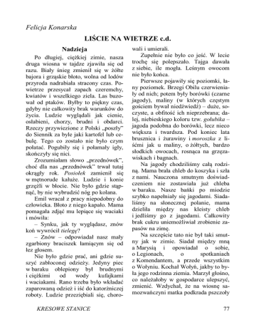 Felicja Konarska LIŚCIE NA WIETRZE c.d. Nadzieja Po długiej, ciężkiej zimie, nasza druga wiosna w tajdze zjawiła się od razu. Biały śnieg zmienił się w żółte bajora i grząskie błoto, wolna od lodów przyroda nadrabiała stracony czas. Powietrze przesycał zapach czeremchy, kwiatów i wszelkiego ziela. Las buzował od ptaków. Byłby to piękny czas, gdyby nie całkowity brak warunków do życia. Ludzie wyglądali jak cienie, osłabieni, chorzy, brudni i obdarci. Rzeczy przywiezione z Polski „poszły” do Siennik za byle jaki kartofel lub cebulę. Tego co zostało nie było czym połatać. Pogubiły się i połamały igły, skończyły się nici. Zrozumiałam słowo „przednówek”, choć dla nas „przednówek” trwał tutaj okrągły rok. Posiołek zamienił się w mętnorude kałuże. Ludzie i konie grzęźli w błocie. Nie było gdzie stąpnąć, by nie wybrudzić nóg po kolana. Emil wracał z pracy niepodobny do człowieka. Błoto z niego kapało. Mama pomagała zdjąć mu lepiące się waciaki i mówiła: – Synku, jak ty wyglądasz, znów koń wywrócił tielegę? – Znów – odpowiadał nasz mały zgarbiony braciszek łamiącym się od łez głosem. Nie było gdzie prać, ani gdzie suszyć zabłoconej odzieży. Jedyny piec w baraku oblepiony był brudnymi i ciężkimi od wody kufajkami i waciakami. Rano trzeba było wkładać zaparowaną odzież i iść do katorżniczej roboty. Ludzie przeziębiali się, choroKRESOWE STANICE wali i umierali. Zupełnie nie było co jeść. W lecie trochę się polepszało. Tajga dawała z siebie, ile mogła. Leśnym owocom nie było końca. Pierwsze pojawiły się poziomki, łany poziomek. Brzegi Obilu czerwieniały od nich; potem były borówki (czarne jagody), maliny (w których częstym gościem bywał niedźwiedź) – duże, soczyste, a obfitość ich nieprzebrana; dalej, niebieskiego koloru tzw. gołubika – jagoda podobna do borówki, lecz nieco większa i twardsza. Pod koniec lata brusznica i żurawiny i moroszka z liśćmi jak u maliny, o żółtych, bardzo słodkich owocach, rosnąca na grzęzawiskach i bagnach. Na jagody chodziliśmy całą rodziną. Mama brała chleb do koszyka i szła z nami. Nauczona smutnym doświadczeniem nie zostawiała już chleba w baraku. Nasze bańki po miodzie szybko napełniały się jagodami. Siadaliśmy na słonecznej polanie, mama dzieliła między nas kleisty chleb i jedliśmy go z jagodami. Całkowity brak cukru uniemożliwiał zrobienie zapasów na zimę. Na szczęście tato nie był taki smutny jak w zimie. Siadał między mną a Marysią i opowiadał o sobie, o Legionach, o spotkaniach z Komendantem, a przede wszystkim o Wołyniu. Kochał Wołyń, jakby to była jego rodzinna ziemia. Marzył głośno, co należałoby w gospodarce ulepszyć, zmienić. Wzdychał, że na wiosnę samozwańczyni matka podkrada pszczoły 77 i ucieka z rojem. O pszczołach mówił i myślał bez końca. Zamyślał się: – Szkoda, że zrzekłem się swojej ojcowizny w górach, dzieci zostaną bez ziemi. Na Wołyń już pewno nie wrócimy. Mama pochyliła się i płakała. W barakach trochę się rozluźniło. Ci, co budowali, pierwsi dostali nowe izby dla swych rodzin. Bardzo zazdrościłam im, że byli sami. My ciągle dzieliliśmy barak z wieloma rodzinami. Co pewien czas przenoszono nas z baraku do baraku, aby przeprowadzić dezynsekcję, ale na pluskwy nie było rady. Pewien Sybirak powiedział, że pluskwa wytrzymuje plus i minus 100° C i przez dwadzieścia lat może wegetować. Jest niezniszczalna. Na Obil przychodziły listy z Polski. Ludzie pisali do krewnych otrzymywali listy i paczki. My też pisaliśmy do dziadunia o swojej nędzy, o głodzie, o chorobach, ale długo nie było żadnej odpowiedzi ani paczki. Było nam bardzo smutno i ciężko. Wiedziałam, że dziadunio cenił naszego tatę, cieszył się dobrobytem mamy i mówił: – Wasz tato to pan – dobrze wydałem córkę. Zapominał, że mama sama się wydała za tatę. Ze spuszczonymi głowami wracaliśmy od listonosza do baraku. Skarżyliśmy się mamie, że jesteśmy tak bardzo głodni, oberwani i chorzy. Mama pocieszała nas i mówiła: - Zobaczycie, pewnego dnia my też dostaniemy dużą paczkę i długi list. W końcu dostaliśmy paczkę! Nie potrafię opisać naszej radości. Emil wziął ją ostrożnie z rąk listonosza i niósł przed sobą. Marysia i ja chciałyśmy chociaż jej dotknąć. Bez słowa usiedliśmy do78 okoła mamy i patrzyliśmy, jak mama rozpakowuje ten skarb. Była to istotnie duża paczka. Przysłali dziaduniowie mąkę, cukier, słoninę, jakieś kiełbaski i chustkę na głowę dla mamy, bo pisała, że bardzo boli ją głowa. Było lekarstwo – jodoform dla Euzebiusza i dla mnie na czyraki i list napisany przez dziadunia. Z listu dowiedzieliśmy się, że dziaduniowie nic już prawie nie mają, że żyją pod strachem i grozą śmierci. Ukraińcy rozgrabili ich cały majątek, a im kazali wynosić się. Oni lada moment opuszczą dom. Teraz są sami. Wujka Mikołaja (najmłodszego brata mamy), wraz z wujenką i córką cioci Anastazji, Felą wywieźli Niemcy na roboty. Wujek Boleś aresztowany przez Ukraińców i nie wiadomo co dalej się z nimi dzieje. Oni są otoczeni wrogimi Ukraińcami, Niemcami i Rosjanami. Mama tak strasznie płakała, że nie mogła czytać. Euzebiusz wziął list i wolno czytał. Usłyszeliśmy, że nasze domy (stary i nowy) zrównane zostały z ziemią, stodoła, obory i zabudowania rozwalono i wywieziono. Pełna trupów studnia zawalona kamieniami, sad wycięty w pień, cały inwentarz roztaszczony, lipowa aleja podzieliła los sadu, ule rozkradzione. Nic a nic nie zostało z naszego pięknego majątku. To „morderstwo” na naszym gnieździe dokonało się jeszcze wówczas, gdy trzymano nas pod konwojem w Tysłuchowie i Zdołbunowie – zaledwie kilkadziesiąt kilometrów. Wszystko, co z takim trudem budowali rodzice przez 17 lat wspólnego życia, rozsypało się i prz