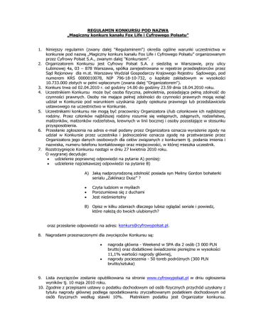 REGULAMIN KONKURSU POD NAZWĄ „Magiczny konkurs kanału Fox Life i Cyfrowego Polsatu” 1. Niniejszy regulamin (zwany dalej "Regulaminem") określa ogólne warunki uczestnictwa w konkursie pod nazwą „Magiczny konkurs kanału Fox Life i Cyfrowego Polsatu” organizowanym przez Cyfrowy Polsat S.A., zwanym dalej "Konkursem". 2. Organizatorem Konkursu jest Cyfrowy Polsat S.A. z siedzibą w Warszawie, przy ulicy Łubinowej 4a, 03 – 878 Warszawa, spółka zarejestrowana w rejestrze przedsiębiorców przez Sąd Rejonowy dla m.st. Warszawy Wydział Gospodarczy Krajowego Rejestru Sądowego, pod numerem KRS 0000010078, NIP 796-18-10-732, o kapitale zakładowym w wysokości 10.733.000 złotych w pełni wpłaconym (zwana dalej "Organizatorem"). 3. Konkurs trwa od 02.04.2010 r. od godziny 14.00 do godziny 23.59 dnia 18.04.2010 roku. 4. Uczestnikiem Konkursu może być osoba fizyczna, pełnoletnia, posiadająca pełną zdolność do czynności prawnych. Osoby nie mające pełnej zdolności do czynności prawnych mogą wziąć udział w Konkursie pod warunkiem uzyskania zgody opiekuna prawnego lub przedstawiciela ustawowego na uczestnictwo w Konkursie. 5. Uczestnikami konkursu nie mogą być pracownicy Organizatora i/lub członkowie ich najbliższej rodziny. Przez członków najbliższej rodziny rozumie się wstępnych, zstępnych, rodzeństwo, małżonków, małżonków rodzeństwa, krewnych w linii bocznej i osoby pozostające w stosunku przysposobienia. 6. Przesłanie zgłoszenia na adres e-mail podany przez Organizatora oznacza wyrażenie zgody na udział w Konkursie przez uczestnika i jednocześnie oznacza zgodę na przetwarzanie przez Organizatora jego danych osobowych dla celów związanych z konkursem tj. podania imienia i nazwiska, numeru telefonu kontaktowego oraz miejscowości, w której mieszka uczestnik. 7. Rozstrzygnięcie Konkursu nastąpi w dniu 27 kwietnia 2010 roku. O wygranej decyduje: • udzielenie poprawnej odpowiedzi na pytanie A) poniżej: • udzielenie najciekawszej odpowiedzi na pytanie B) A) Jaką nadprzyrodzoną zdolność posiada syn Meliny Gordon bohaterki serialu „Zaklinacz Dusz” ? • • • Czyta ludziom w myślach Porozumiewa się z duchami Jest nieśmiertelny B) Opisz w kilku zdaniach dlaczego lubisz oglądać seriale i powiedz, które należą do twoich ulubionych? oraz przesłanie odpowiedzi na adres: [email protected]. 8. Nagrodami przeznaczonymi dla zwycięzców Konkursu są: • • nagroda główna - Weekend w SPA dla 2 osób (3 000 PLN brutto) oraz dodatkowe świadczenie pieniężne w wysokości 11,1% wartości nagrody głównej, nagrody pocieszenia - 50 toreb podróżnych (300 PLN brutto/sztuka) 9. Lista zwycięzców zostanie opublikowana na stronie www.cyfrowypolsat.pl w dniu ogłoszenia wyników tj. 10 maja 2010 roku. 10. Zgodnie z przepisami ustawy o podatku dochodowym od osób fizycznych przychód uzyskany z tytułu nagrody głównej podlega opodatkowaniu zryczałtowanym podatkiem dochodowym od osób fizycznych według stawki 10%. Płatnikiem podatku jest Organizator konkursu. Organizator ma prawo potrącić kwotę podatku z dodatkowego świadczenia pieniężnego, o którym mowa powyżej w pkt 8, do czego uczestnik nieodwołalnie upoważnia Organizatora. Zwycięzca zobowiązany jest do przekazania w formie pisemnej Organizatorowi wszelkich danych niezbędnych do prawidłowego rozliczenia podatku w związku z wydaniem nagrody głównej w konkursie. 11. Nagrody do zwycięzców zostaną wysłane przez Organizatora na jego koszt pod adres zamieszkania wskazany przez Zwycięzców w zgłoszeniu konkursowym. 12. W przypadku niepodania swych danych osobowych lub niewyrażenia zgody na ich przetwarzanie przez Organizatora w zakresie wyżej podanym zwycięzca traci prawo do nagrody. 13. Nagrody zostaną wysłane w ciągu miesiąca licząc od dnia ogłoszenia wyników Konkursu. 14. Organizator Konkursu wyklucza możliwość zamiany nagrody w Konkursie na ekwiwalent pieniężny lub inną nagrodę rzeczową. 15. Każdy z Uczestników może otrzymać tylko jedną nagrodę (nagrodę główną bądź nagrodę pocieszenia). 16. Zasady przeprowadzania Konkursu określa niniejszy Regulamin. 17. Udział w Konkursie, jest równoznaczny ze złożeniem przez uczestnika oświadczenia o wyrażeniu zgody na postanowienia niniejszego Regulaminu. 18. Organizator nie ponosi odpowiedzialności za: a) nieprawdziwość danych i oświadczeń złożonych przez Uczestników konkursu. b) problemy w funkcjonowaniu Konkursu, jeżeli nastąpiły one wskutek zdarzeń, których Organizator przy zachowaniu należytej staranności nie był w stanie przewidzieć, lub którym nie mógł zapobiec, w szczególności w przypadku problemów związanych ze zdarzeniami losowymi o charakterze siły wyższej, c) przerwy w funkcjonowaniu Konkursu zaistniałe z przyczyn technicznych lub niezależnych od Organizatora, nie doręczenie nagrody spowodowane podaniem przez laureata błędnych danych osobowych niezbędnych do doręczenia nagrody lub spowodowane działaniem firmy kurierskiej lub Poczty Polskiej, za pośrednictwem której będą doręczane przesyłki. 19. Organizator zastrzega sobie prawo do unieważnienia lub odwołania Konkursu w każdym czasie bez podania przyczyny. 20. W celu zapewnienia prawidłowości przeprowadzenia Konkursu Organizator powoła dwuosobową Komisję Konkursową. Do zadań Komisji należeć będzie czuwanie nad prawidłowością przebiegu Konkursu a w szczególności : a) Wyłonienie zwycięzców, b) zapewnienie przyznania nagród wyłonionym zwycięzcom, c) zabezpieczenie zgodności wyłonienia zwycięzców oraz przyznania nagrody zgodnie z regulaminem i zasadami pełnej rzetelności przeprowadzonych czynności, d) właściwe oznaczenie i zabezpieczenie danych zwycięzców, e) podpisanie protokołu zawierającego opis czynności przyznania nagród, f) udział w ewentualnym postępowaniu reklamacyjnym g) podejmowanie decyzji w kwestiach, w których pojawią się wątp