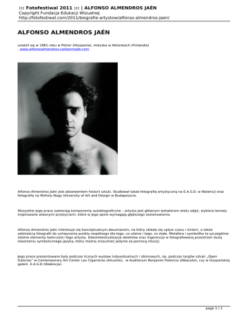::: Fotofestiwal 2011 ::: | ALFONSO ALMENDROS JAÉN Copyright Fundacja Edukacji Wizualnej http://fotofestiwal.com/2011/biografie-artystow/alfonso-almendros-jaen/ ALFONSO ALMENDROS JAÉN urodził się w 1981 roku w Petrer (Hiszpania), mieszka w Helsinkach (Finlandia) www.alfonsoalmendros.carbonmade.com Alfonso Almendros Jaén jest absolwentem historii sztuki. Studiował także fotografię artystyczną na E.A.S.D. w Walencji oraz fotografię na Moholy-Nagy University of Art and Design w Budapeszcie. Wszystkie jego prace zawierają komponenty autobiograficzne – artysta jest głównym bohaterem wielu zdjęć, wybiera tematy inspirowane własnymi przeżyciami, które w jego opinii wymagają głębszego zastanowienia. Alfonso Almendros Jaén interesuje się konceptualnym dwumianem, na który składa się upływ czasu i śmierć, a także zdolnością fotografii do uchwycenia punktu wspólnego dla tego, co ulotne i tego, co stałe. Metafora i symbolika to szczególnie istotne elementy twórczości tego artysty. Dekontekstualizacja obiektów oraz ingerencja w fotografowaną przestrzeń służą stworzeniu symbolicznego języka, który można zrozumieć jedynie za pomocą intuicji. Jego prace prezentowane były podczas licznych wystaw indywidualnych i zbiorowych, np. podczas targów sztuki „Open Galerias” w Contemporary Art Center Las Cigarreras (Alicante), w Auditorum Benjamin Palencia (Albacete), czy w hiszpańskiej galerii E.A.S.D (Walencja). page 1 / 1