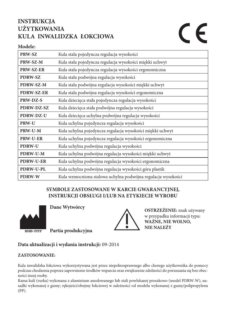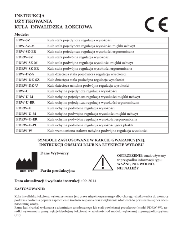 INSTRUKCJA UŻYTKOWANIA KULA INWALIDZKA ŁOKCIOWA Modele: PRW-SZ Kula stała pojedyncza regulacja wysokości PRW-SZ-M Kula stała pojedyncza regulacja wysokości miękki uchwyt PRW-SZ-ER Kula stała pojedyncza regulacja wysokości ergonomiczna PDRW-SZ Kula stała podwójna regulacja wysokości PDRW-SZ-M Kula stała podwójna regulacja wysokości miękki uchwyt PDRW-SZ-ER Kula stała podwójna regulacja wysokości ergonomiczna PRW-DZ-S Kula dziecięca stała pojedyncza regulacja wysokości PDRW-DZ-SZ Kula dziecięca stała podwójna regulacja wysokości PDRW-DZ-U Kula dziecięca uchylna podwójna regulacja wysokości PRW-U Kula uchylna pojedyncza regulacja wysokości PRW-U-M Kula uchylna pojedyncza regulacja wysokości miękki uchwyt PRW-U-ER Kula uchylna pojedyncza regulacja wysokości ergonomiczna PDRW-U Kula uchylna podwójna regulacja wysokości PDRW-U-M Kula uchylna podwójna regulacja wysokości miękki uchwyt PDRW-U-ER Kula uchylna podwójna regulacja wysokości ergonomiczna PDRW-U-PL Kula uchylna podwójna regulacja wysokości góra plastik PDRW-W Kula wzmocniona stalowa uchylna podwójna regulacja wysokości SYMBOLE ZASTOSOWANE W KARCIE GWARANCYJNEJ, INSTRUKCJI OBSŁUGI I/LUB NA ETYKIECIE WYROBU Dane Wytwórcy mm-rrrr Partia produkcyjna OSTRZEŻENIE: znak używany w przypadku informacji typu: WAŻNE, NIE WOLNO, NIE NALEŻY Data aktualizacji i wydania instrukcji: 09-2014 ZASTOSOWANIE: Kula inwalidzka łokciowa wykorzystywana jest przez niepełnosprawnego albo chorego użytkownika do pomocy podczas chodzenia poprzez zapewnienie środków wsparcia oraz zwiększenie zdolności do poruszania się bez obecności innej osoby. Rama kuli (rurka) wykonana z aluminium anodowanego lub stali powlekanej proszkowo (model PDRW-W), nasadki wykonanej z gumy; rękojeści/obejmy łokciowej w zależności od modelu wykonanej z gumy/polipropylenu (PP). ELEMENTY BLOKUJĄCE: Zapinka (A1) podwójna z podwójnym bolcem krótkim Zapinka (A4) z pojedynczym bolcem krótkim Nakrętka z gwintem (B) PIERWSZE URUCHOMIENIE Wyrób dostarczany jest standardowo w komplecie (2 szt.) w opakowaniu foliowym, zabezpieczony do transportu, po dokonaniu oględzin i regulacji, gotowy do użycia. Przed dokonaniem regulacji sprawdzić stan techniczny rurek (pod kątem pęknięć), nasadki, rękojeści i obejmy, nakrętki z gwintem (B), zapinek (A i A1). W przypadku stwierdzenia uszkodzeń zgłosić to bezzwłocznie u Sprzedającego lub bezpośrednio u Wytwórcy. UWAGA: zachować oryginalny dokument zakupu (paragon, faktura VAT). Po wyjęciu z opakowania foliowego, dokonaniu oględzin, należy dopasować żądaną wysokość do wzrostu użytkownika. UWAGA: kule dostarczane są w najniższej wysokości (dokonać regulacji). REGULACJA WYSOKOŚCI dolnej i górnej (gdzie dotyczy): 1. Poluzować nakrętkę z gwintem (B) 2. Zdjąć zapinkę (A1 lub A4) 3. Wewnętrzną rurkę dolną wysunąć, uzyskując potrzebną wysokość 4. Ustawić otwory rurek zewnętrznej oraz wewnętrznej tak, aby dokładnie nakładały się na siebie 5. Założyć zapinkę (A1 lub A4) 6. Dokręcić nakrętkę z gwintem (B) 7. Upewnić, się że dokonana regulacja została wykonana poprawnie a kula stoi stabilnie na podłożu. 8. Przy użytkowaniu dwóch kul jednocześnie, takie samej regulacji dokonać na drugiej kuli UŻYTKOWANIE wyrobu, zalecenia Wytwórcy: Wyrób przeznaczony dla jednej osoby. Obsługa jedną ręką. Zaleca się używanie jednoczasowo dwóch kul inwalidzkich. Wyrób przeznaczony do użytku wewnątrz i na zewnątrz pomieszczeń. Dopuszcza się eksploatację kuli inwalidzkiej dla dorosłych o wadze ciała do 120 kg Dopuszcza się eksploatację kuli inwalidzkiej dla dzieci o wadze ciała do 70 kg NIE WOLNO zawieszać ani przytwierdzać przedmiotów (np. toreb, plecaków) ani na rękojeści kuli, ani na jej obejmie. Niezastosowanie się tego zalecenie może skutkować uszkodzeniem ciała (np. podczas upadku) i/lub wyrobu. Wytwórca nie odpowiada za szkody, które wynikną w niezastosowania się do ww. obostrzenia. Zużytą gumową nasadkę należy wymienić na nową. W okresie zimowym zaleca się stosowanie nasadki antypoślizgowej. Kontrolę nasadki użytkownik obowiązany jest dokonywać we własnym zakresie, nie rzadziej niż raz w miesiącu, w okresie zimowym zalecamy codziennie. Zużyty sprzęt należy oddać do recyklingu. Dopasowanie wysokości wyrobu do parametrów użytkownika, sposób poruszania się z pomocą kul inwalidzkich dokona i przekaże użytkownikowi wskazówki osoba do tego medycznie upoważniona tj. lekarz, fizjoterapeuta, pracownik Sprzedawcy posiadający doświadczenie oraz poświadczone kwalifikacje do wydawania sprzętu ortopedyczno-rehabilitacyjnego w ramach umowy z NFZ. Wskazania ogólne od Wytwórcy: w przypadku użytkowania jednej kuli, należy użytkować ją po stronie nogi zdrowej/zdrowszej. CZYSZCZENIE / KONSERWACJA/PRZECHOWYWANIE: 1. Elementy z tworzywa oraz rurki czyścić miękką gąbką, zwilżoną w łagodnym środku czyszczącym, po czyszczeniu przetrzeć wilgotną szmatką, wypolerować do sucha. 2. NIE WOLNO stosować do czyszczenia środków ściernych, mocnych detergentów, benzyny, rozpuszczalników, środków powierzchniowo czynnych wchodzących w reakcję z aluminium. 3. Koniecznie na bieżąco usuwać zanieczyszczenia ze spodu nasadki (włosy, nici, lód, błoto). 4. Wszelki uszkodzenia, które wynikną ze złego czyszczenia, konserwacji wyrobu, nie podlegają naprawie gwarancyjnej. 5. Przechowywać w temperaturze pokojowej, w pomieszczeniach suchych, zamkniętych, wolnych od oparów chemicznych (zdala od sztucznych źródeł ciepła typu: kaloryfer, grzejnik, piec). 6. Przechowywanie w pomieszczeniach o wysokiej wilgotności powietrza (łazienka, pralnie, piwnice itp. lub na wolnym powietrzu) połączone z brakiem higieny zwłaszcza przy dłuższym przechowywaniu, będą przyczyną utraty parametrów użytkowych i estetycznych a tym samym gwarancji na wyrób. 7. Kontrolę stanu technicznego wy