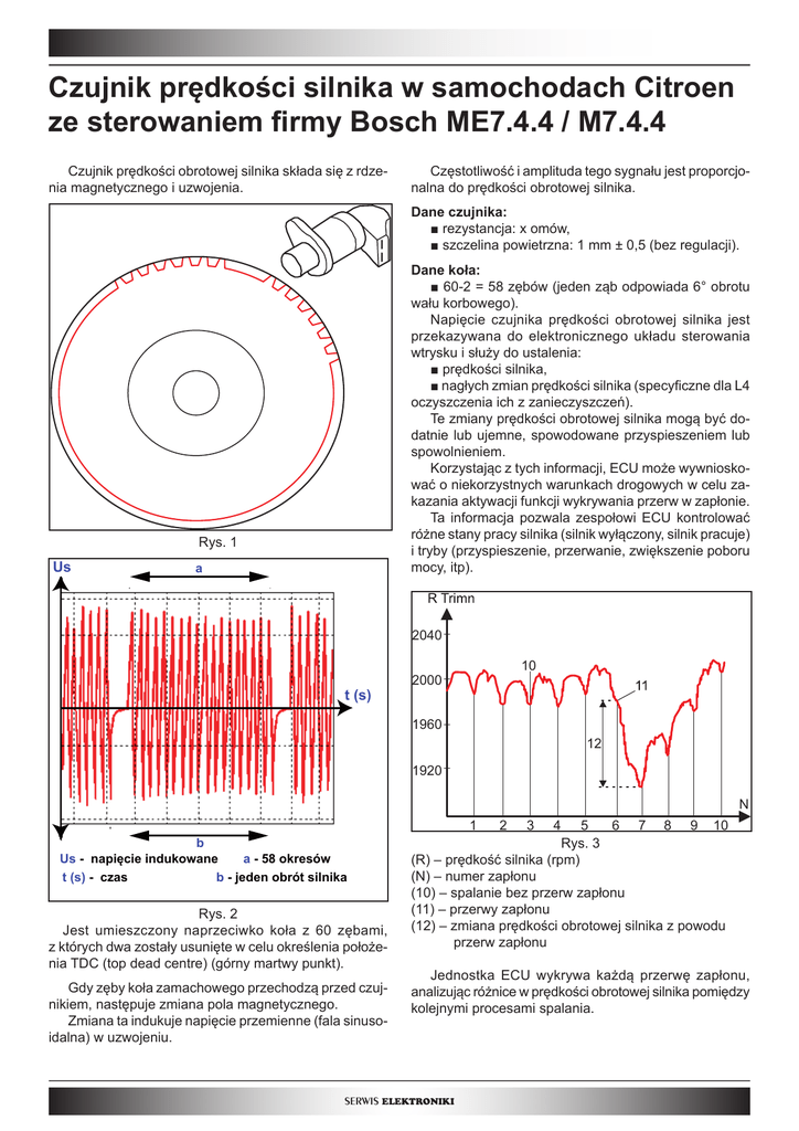 Czujnik prędkości silnika w samochodach Citroen ze sterowaniem firmy Bosch ME7.4.4 / M7.4.4 Czujnik prędkości obrotowej silnika składa się z rdzenia magnetycznego i uzwojenia. Częstotliwość i amplituda tego sygnału jest proporcjonalna do prędkości obrotowej silnika. Dane czujnika: ■ rezystancja: x omów, ■ szczelina powietrzna: 1 mm ± 0,5 (bez regulacji). Dane koła: ■ 60-2 = 58 zębów (jeden ząb odpowiada 6° obrotu wału korbowego). Napięcie czujnika prędkości obrotowej silnika jest przekazywana do elektronicznego układu sterowania wtrysku i służy do ustalenia: ■ prędkości silnika, ■ nagłych zmian prędkości silnika (specyficzne dla L4 oczyszczenia ich z zanieczyszczeń). Te zmiany prędkości obrotowej silnika mogą być dodatnie lub ujemne, spowodowane przyspieszeniem lub spowolnieniem. Korzystając z tych informacji, ECU może wywnioskować o niekorzystnych warunkach drogowych w celu zakazania aktywacji funkcji wykrywania przerw w zapłonie. Ta informacja pozwala zespołowi ECU kontrolować różne stany pracy silnika (silnik wyłączony, silnik pracuje) i tryby (przyspieszenie, przerwanie, zwiększenie poboru mocy, itp). Rys. 1 Us a 2040 10 2000 t (s) 1960 12 1920 N 1 b Us - napięcie indukowane a - 58 okresów t (s) - czas b - jeden obrót silnika Rys. 2 Jest umieszczony naprzeciwko koła z 60 zębami, z których dwa zostały usunięte w celu określenia położenia TDC (top dead centre) (górny martwy punkt). Gdy zęby koła zamachowego przechodzą przed czujnikiem, następuje zmiana pola magnetycznego. Zmiana ta indukuje napięcie przemienne (fala sinusoidalna) w uzwojeniu. 2 3 4 5 6 7 8 9 10 Rys. 3 (R) – prędkość silnika (rpm) (N) – numer zapłonu (10) – spalanie bez przerw zapłonu (11) – przerwy zapłonu (12) – zmiana prędkości obrotowej silnika z powodu przerw zapłonu Jednostka ECU wykrywa każdą przerwę zapłonu, analizując różnice w prędkości obrotowej silnika pomiędzy kolejnymi procesami spalania. SERWIS ELEKTRONIKI Podczas normalnej pracy, na jeden obrót wału korbowego, koło zamachowe musi wykonać 2 ruchy przyspieszające, odpowiadające 2 procesom spalania podczas tego obrotu. Jeżeli ruch przyspieszania nie zostanie wykryty, zostanie wykryta przerwa w zapłonie. Dioda diagnostyczna LED zacznie migać, jeśli przerwa w zapłonie może uszkodzić katalizator, gdy on występuje. Jeśli taka sytuacja wystąpi, to może prowadzić do ograniczenia danych regulacyjnych, które mogą zostać przekroczone. W tym przypadku dioda LED pozostanie zapalona. SERWIS ELEKTRONIKI