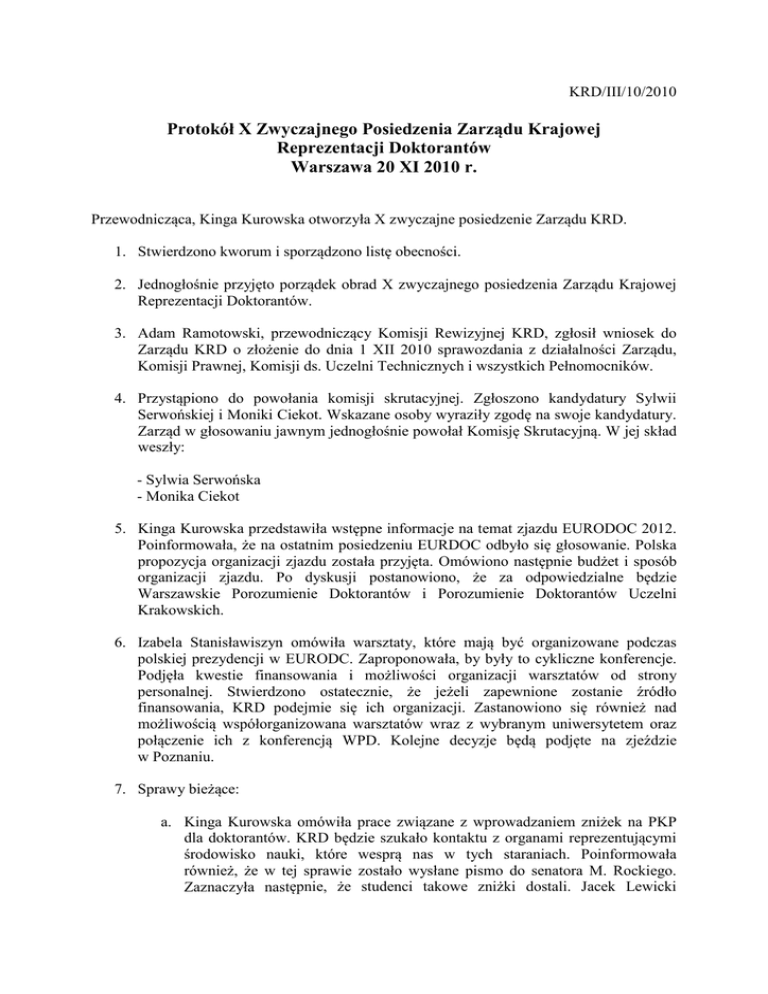Protokół X Zwyczajnego Posiedzenia Zarządu KRD