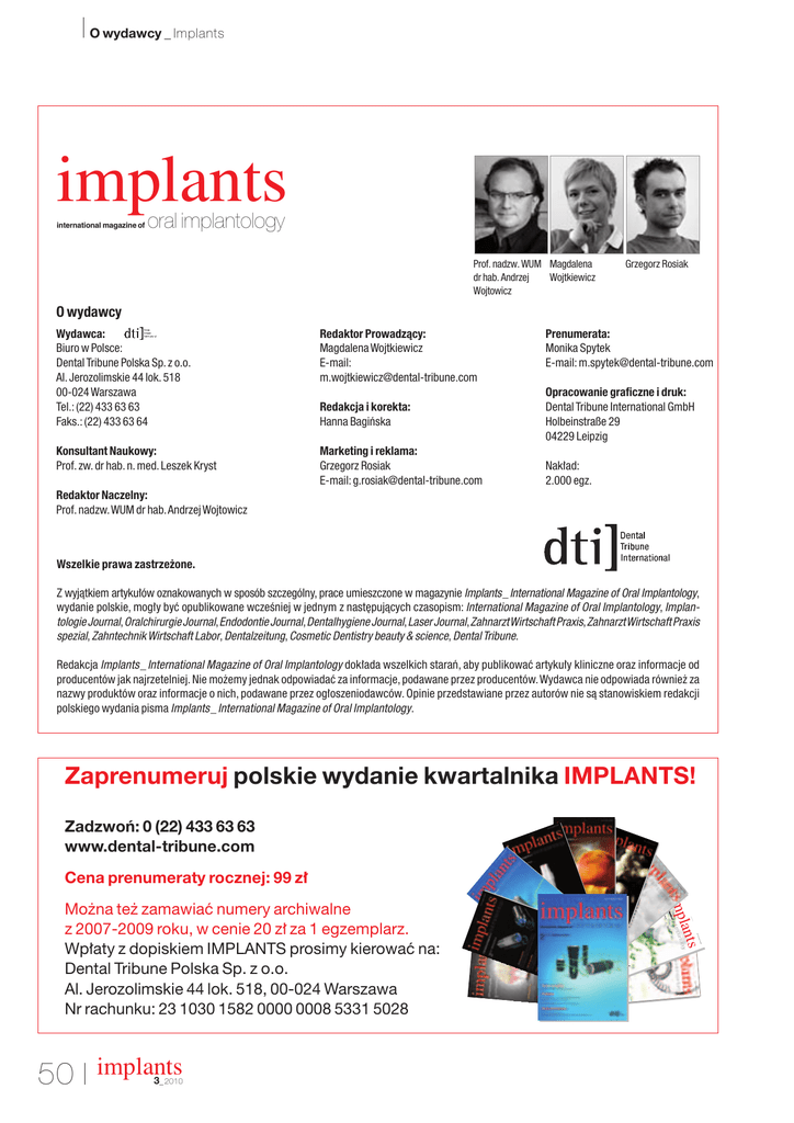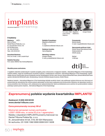 O wydawcy _ Implants implants international magazine of oral implantology Prof. nadzw. WUM Magdalena Wojtkiewicz dr hab. Andrzej Wojtowicz Grzegorz Rosiak O wydawcy Wydawca: Biuro w Polsce: Dental Tribune Polska Sp. z o.o. Al. Jerozolimskie 44 lok. 518 00-024 Warszawa Tel.: (22) 433 63 63 Faks.: (22) 433 63 64 Redaktor Prowadzàcy: Magdalena Wojtkiewicz E-mail: [email protected] Konsultant Naukowy: Prof. zw. dr hab. n. med. Leszek Kryst Marketing i reklama: Grzegorz Rosiak E-mail: [email protected] Redakcja i korekta: Hanna Bagiƒska Prenumerata: Monika Spytek E-mail: [email protected] Opracowanie graficzne i druk: Dental Tribune International GmbH Holbeinstraße 29 04229 Leipzig Nak∏ad: 2.000 egz. Redaktor Naczelny: Prof. nadzw. WUM dr hab. Andrzej Wojtowicz Wszelkie prawa zastrze˝one. Z wyjàtkiem artyku∏ów oznakowanych w sposób szczególny, prace umieszczone w magazynie Implants_International Magazine of Oral Implantology, wydanie polskie, mog∏y byç opublikowane wczeÊniej w jednym z nast´pujàcych czasopism: International Magazine of Oral Implantology, Implantologie Journal, Oralchirurgie Journal, Endodontie Journal, Dentalhygiene Journal, Laser Journal, Zahnarzt Wirtschaft Praxis, Zahnarzt Wirtschaft Praxis spezial, Zahntechnik Wirtschaft Labor, Dentalzeitung, Cosmetic Dentistry beauty & science, Dental Tribune. Redakcja Implants _ International Magazine of Oral Implantology dok∏ada wszelkich staraƒ, aby publikowaç artyku∏y kliniczne oraz informacje od producentów jak najrzetelniej. Nie mo˝emy jednak odpowiadaç za informacje, podawane przez producentów. Wydawca nie odpowiada równie˝ za nazwy produktów oraz informacje o nich, podawane przez og∏oszeniodawców. Opinie przedstawiane przez autorów nie sà stanowiskiem redakcji polskiego wydania pisma Implants _ International Magazine of Oral Implantology. Zaprenumeruj polskie wydanie kwartalnika IMPLANTS! Zadzwoƒ: 0 (22) 433 63 63 www.dental-tribune.com Cena prenumeraty rocznej: 99 z∏ ISS 89 N1 6-1 444 Cena : 29 of zine maga skie ie pol dan 9 wy 200 all onna atitio rna ern int inte 3 s lant imp PLN Vol. 4• wrze sieƒ • 3/20 09 gy ntolo impla oral 3_ 2010 nim przed cinku tyka je w od ê _Prak strukc owied za zap Rekon ia pierws arzen 10 – _Wyd logia 20 kowie Kra Osteo nia w tka spo 50 implants ania koÊci _Bad neracja Rege Mo˝na te˝ zamawiaç numery archiwalne z 2007-2009 roku, w cenie 20 z∏ za 1 egzemplarz. Wp∏aty z dopiskiem IMPLANTS prosimy kierowaç na: Dental Tribune Polska Sp. z o.o. Al. Jerozolimskie 44 lok. 518, 00-024 Warszawa Nr rachunku: 23 1030 1582 0000 0008 5331 5028