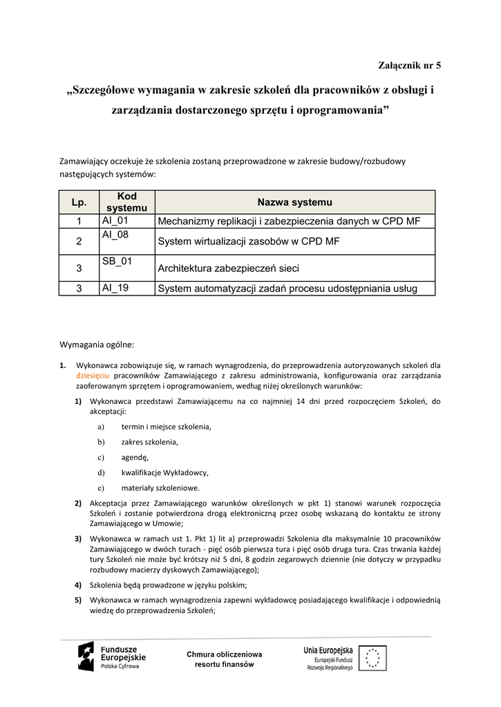 Załącznik nr 5 „Szczegółowe wymagania w zakresie szkoleń dla pracowników z obsługi i zarządzania dostarczonego sprzętu i oprogramowania” Zamawiający oczekuje że szkolenia zostaną przeprowadzone w zakresie budowy/rozbudowy następujących systemów: Lp. 1 2 3 3 Kod systemu AI_01 AI_08 SB_01 AI_19 Nazwa systemu Mechanizmy replikacji i zabezpieczenia danych w CPD MF System wirtualizacji zasobów w CPD MF Architektura zabezpieczeń sieci System automatyzacji zadań procesu udostępniania usług Wymagania ogólne: 1. Wykonawca zobowiązuje się, w ramach wynagrodzenia, do przeprowadzenia autoryzowanych szkoleń dla dziesięciu pracowników Zamawiającego z zakresu administrowania, konfigurowania oraz zarządzania zaoferowanym sprzętem i oprogramowaniem, według niżej określonych warunków: 1) Wykonawca przedstawi Zamawiającemu na co najmniej 14 dni przed rozpoczęciem Szkoleń, do akceptacji: a) termin i miejsce szkolenia, b) zakres szkolenia, c) agendę, d) kwalifikacje Wykładowcy, e) materiały szkoleniowe. 2) Akceptacja przez Zamawiającego warunków określonych w pkt 1) stanowi warunek rozpoczęcia Szkoleń i zostanie potwierdzona drogą elektroniczną przez osobę wskazaną do kontaktu ze strony Zamawiającego w Umowie; 3) Wykonawca w ramach ust 1. Pkt 1) lit a) przeprowadzi Szkolenia dla maksymalnie 10 pracowników Zamawiającego w dwóch turach - pięć osób pierwsza tura i pięć osób druga tura. Czas trwania każdej tury Szkoleń nie może być krótszy niż 5 dni, 8 godzin zegarowych dziennie (nie dotyczy w przypadku rozbudowy macierzy dyskowych Zamawiającego); 4) Szkolenia będą prowadzone w języku polskim; 5) Wykonawca w ramach wynagrodzenia zapewni wykładowcę posiadającego kwalifikacje i odpowiednią wiedzę do przeprowadzenia Szkoleń; 6) Wykonawca zobowiązuje się do zapewnienia miejsca szkolenia wraz ze stanowiskiem komputerowym dla każdego uczestnika szkolenia oraz wszelkie niezbędne oprogramowanie; 7) Każdy z uczestników szkoleń otrzyma komplet materiałów szkoleniowych w języku polskim (w formie papierowej lub elektronicznej). Zamawiający dopuszcza przekazanie materiałów szkoleniowych w języku angielskim pod warunkiem, że producent Systemu nie udostępnia materiałów w j. polskim; 8) Wykonawca zapewni salę szkoleniową na terenie Warszawy wraz z wyżywieniem (jeden gorący posiłek oraz kawa, herbata i zimne napoje podczas trwania Szkoleń); 9) Wykonawca zapewni 6 uczestnikom Szkoleń spoza Warszawy nocleg w Warszawie (lista osób objętych noclegiem zostanie przekazana przez Zamawiającego w terminie co najmniej 5 dni roboczych przed planowym rozpoczęciem Szkolenia); 10) Każdy z uczestników szkolenia otrzyma certyfikat producenta rozwiązania którego dotyczy szkolenie; 11) Wszelkie koszty związane ze wszystkimi aspektami szkoleń ponosi Wykonawca. 12) Wykonawca przedstawi do akceptacji i uzgodni z Zamawiającym program szkolenia wraz z harmonogramem szkoleń, w terminie 14 dni kalendarzowych od daty zawarcia umowy, Poniżej zawarte są wymagania dotyczące szkoleń dla poszczególnych systemów: AI_01 - Mechanizmy replikacji i zabezpieczenia danych w CPD MF 1. Merytoryczna zawartość Szkolenia w zakresie dostarczonych macierzy C.STO.UNI oraz C.STO.FLS. 1) Administracja i użytkowanie zaoferowanej macierzy dyskowej, 2) omówienie architektury zaoferowanego rozwiązania, 3) omówienie narzędzi administracyjnych (GUI, CLI), 4) omówienie narzędzi monitorujących system dyskowy, 5) omówienie katalogu najlepszych praktyk w środowisku wirtualnym zaoferowanym w ramach Umowy, 2. ćwiczenia praktyczne: 1) konfiguracja systemu dyskowego (interfejsy, grupy dyskowe), 2) tworzenie i modyfikacja jednostek LUN, 3) mapowanie jednostek LUN do serwerów, 4) konfiguracja zasobów w środowisku wirtualnym, 5) konfiguracja specyficznych opcji i ustawień typu kopie migawkowe, kopie pełne (klony), replikacja, tiering, thin provisioning, 6) monitoring i zarządzanie, uprawnienia użytkowników, 7) diagnostyka, 8) optymalizacja wydajności; AI_08 - System wirtualizacji zasobów w CPD MF C.PSR.R.X86.1 1. 2. Merytoryczna zawartość Szkolenia w zakresie dostarczonych serwerów C.PSR.R.X86.1 1) Administracja i użytkowanie zaoferowanych serwerów, 2) omówienie architektury zaoferowanych serwerów, 3) omówienie narzędzi administracyjnych 4) omówienie narzędzi monitorujących ćwiczenia praktyczne: 1) instalacja i konfiguracja serwerów, 2) instalacja i konfiguracja centralnych narzędzi administracyjnych i monitorowania, 3) konfiguracja komponentów, 4) konfiguracja i zarządzanie profilami serwerów, 5) monitoring i zarządzanie, uprawnienia użytkowników, 6) diagnostyka, 7) optymalizacja wydajności C.VM.X86.VMW 1. Merytoryczna zawartość Szkolenia w zakresie dostarczonego oprogramowania C.VM.X86.VMW Narzędzia i mechanizmy do zarządzania środowiskiem wirtualizacji - Konfiguracja - Omówienie dostępnych - Konfiguracja trybu wsparcia technicznego - Zapoznanie się z ważnymi plikami dzienników systemowych tworzonymi przez hosty Wydajność w zwirtualizowanym środowisku - Omówienie metodologii rozwiązywania problemów wydajnościowych - Omówienie technik wirtualizacji programowej i sprzętowej oraz ich wpływu na wydajność - Korzystanie z narzędzi monitorowania wydajności środowiska Skalowalność w odniesieniu do sieci - Tworzenie, konfigurowanie i zarządzanie rozproszonymi wirtualnymi switchami - Migracja maszyn wirtualnych ze switchy standardowych do switchy rozproszonych - Omówienie cech switchy rozproszonych Optymalizacja sieci - Omówienie cech wydajnościowych interfejsów sieciowych - Omówienie cech wydajnościowych mechanizmów sieciowych - Monitorowanie kluczowych parametrów wydajnościowych zasobów sieciowych - Rozwiązywanie typowych problemów wydajnościowych związanych z zasobami sieciowymi Skalowalność w odniesieniu do pamięci masowej - Konfigurowanie mechanizmów wielościeżkowych pamięci masowej -