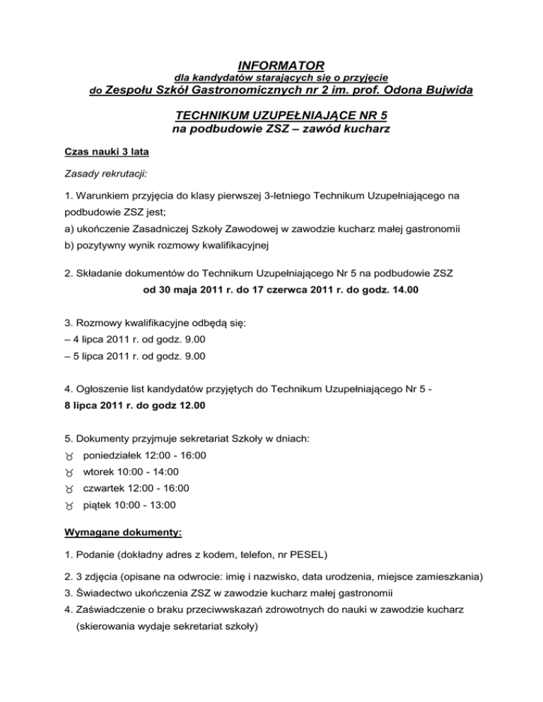INFORMATOR dla kandydatów starających się o przyjęcie do Zespołu Szkół Gastronomicznych nr 2 im. prof. Odona Bujwida TECHNIKUM UZUPEŁNIAJĄCE NR 5 na podbudowie ZSZ – zawód kucharz Czas nauki 3 lata Zasady rekrutacji: 1. Warunkiem przyjęcia do klasy pierwszej 3-letniego Technikum Uzupełniającego na podbudowie ZSZ jest; a) ukończenie Zasadniczej Szkoły Zawodowej w zawodzie kucharz małej gastronomii b) pozytywny wynik rozmowy kwalifikacyjnej 2. Składanie dokumentów do Technikum Uzupełniającego Nr 5 na podbudowie ZSZ od 30 maja 2011 r. do 17 czerwca 2011 r. do godz. 14.00 3. Rozmowy kwalifikacyjne odbędą się: – 4 lipca 2011 r. od godz. 9.00 – 5 lipca 2011 r. od godz. 9.00 4. Ogłoszenie list kandydatów przyjętych do Technikum Uzupełniającego Nr 5 8 lipca 2011 r. do godz 12.00 5. Dokumenty przyjmuje sekretariat Szkoły w dniach: poniedziałek 12:00 - 16:00 wtorek 10:00 - 14:00 czwartek 12:00 - 16:00 piątek 10:00 - 13:00 Wymagane dokumenty: 1. Podanie (dokładny adres z kodem, telefon, nr PESEL) 2. 3 zdjęcia (opisane na odwrocie: imię i nazwisko, data urodzenia, miejsce zamieszkania) 3. Świadectwo ukończenia ZSZ w zawodzie kucharz małej gastronomii 4. Zaświadczenie o braku przeciwwskazań zdrowotnych do nauki w zawodzie kucharz (skierowania wydaje sekretariat szkoły) Dodatkowe Informacje Szkoła istnieje w Krakowie od 1910 r. Patronem jest prof. Odon Bujwid, lekarz bakteriolog, założyciel pierwszej stacji badania żywności w Polsce. Szkoła posiada nowoczesną bazę do kształcenia ogólnego i zawodowego w tym: - 4 pracownie technologiczne. - Pracownię obsługi konsumenta - Pracownię komputerową z Internetem - Halę sportową z 3 salami gimnastycznymi Kształcenie praktyczne odbywa się w dwóch nowocześnie wyposażonych restauracjach: - Restauracji Pokusa ( tel. 0-12 423 62 36 ) - Restauracji turystycznej w schronisku PTSM ( tel. 0-12 633 16 02 ) Od wielu lat szkoła współpracuje ze szkołami na Węgrzech, Słowacji i w Czechach. Obecnie uczestniczy w Europejskim Programie Edukacyjnym: Leonardo da Vinci. W ramach programu młodzież odbywa staże zagraniczne w Cavaillon (Francja), Macon (Francja), Praga (Czechy), Koszyce (Słowacja). Młodzież ma szansę rozwijać swoje zainteresowania w wielu kołach przedmiotowych i artystycznych. Szkoła organizuje Małopolski Konkurs "Stół pięknie nakryty" oraz eliminacje okręgowe Olimpiady Wiedzy o żywieniu, w marcu odbywają się Dni Otwarte Szkoły. Uczniowie pod kierunkiem nauczycieli-zawodowców biorą też udział w Wielkiej Kolekcji Sztuki Kulinarnej, Małopolskim Konkursie Galicyjskim, Małopolskiej Olimpiadzie Jajcarskiej, targach Horeca. W roku szkolnym 2008/09 rozpoczęto realizację projektu "Praktyczna gastronomia we współczesnej Europie", który otrzymał dofinansowanie z Europejskiego Funduszu Społecznego w ramach Priorytetu IX Programu Operacyjnego Kapitał Ludzki. Wytwarzane w warsztacie szkolnym ciasteczka wyśmienite zostały w sierpniu 2008 roku wpisane na listę produktów tradycyjnych Ministerstwa Rolnictwa i Rozwoju Wsi. Szkoła jest szkołą bezpieczną - posiada monitoring.