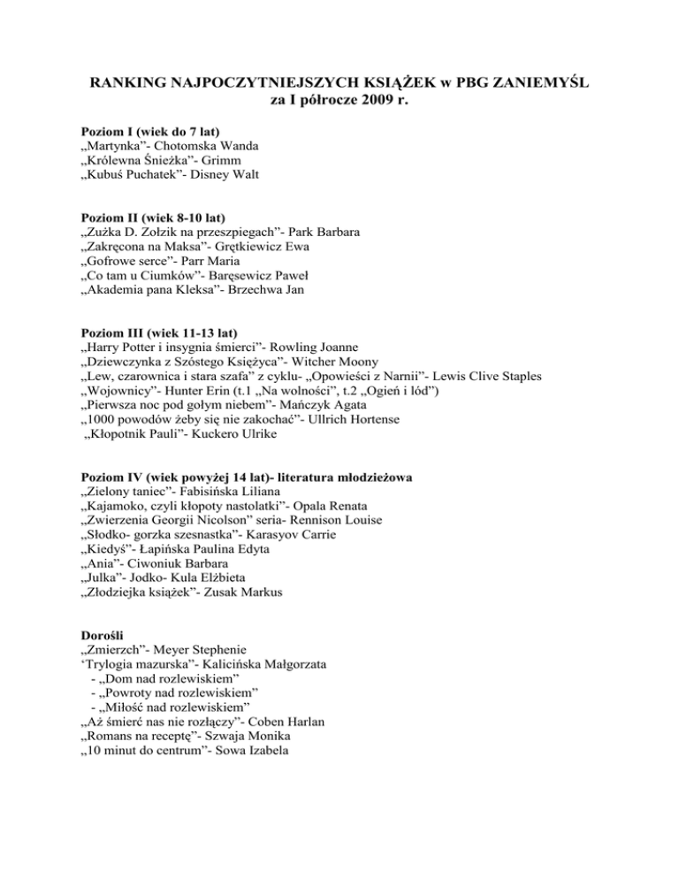 RANKING NAJPOCZYTNIEJSZYCH KSIĄŻEK w PBG ZANIEMYŚL za I półrocze 2009 r. Poziom I (wiek do 7 lat) „Martynka”- Chotomska Wanda „Królewna Śnieżka”- Grimm „Kubuś Puchatek”- Disney Walt Poziom II (wiek 8-10 lat) „Zużka D. Zołzik na przeszpiegach”- Park Barbara „Zakręcona na Maksa”- Grętkiewicz Ewa „Gofrowe serce”- Parr Maria „Co tam u Ciumków”- Baręsewicz Paweł „Akademia pana Kleksa”- Brzechwa Jan Poziom III (wiek 11-13 lat) „Harry Potter i insygnia śmierci”- Rowling Joanne „Dziewczynka z Szóstego Księżyca”- Witcher Moony „Lew, czarownica i stara szafa” z cyklu- „Opowieści z Narnii”- Lewis Clive Staples „Wojownicy”- Hunter Erin (t.1 „Na wolności”, t.2 „Ogień i lód”) „Pierwsza noc pod gołym niebem”- Mańczyk Agata „1000 powodów żeby się nie zakochać”- Ullrich Hortense „Kłopotnik Pauli”- Kuckero Ulrike Poziom IV (wiek powyżej 14 lat)- literatura młodzieżowa „Zielony taniec”- Fabisińska Liliana „Kajamoko, czyli kłopoty nastolatki”- Opala Renata „Zwierzenia Georgii Nicolson” seria- Rennison Louise „Słodko- gorzka szesnastka”- Karasyov Carrie „Kiedyś”- Łapińska Paulina Edyta „Ania”- Ciwoniuk Barbara „Julka”- Jodko- Kula Elżbieta „Złodziejka książek”- Zusak Markus Dorośli „Zmierzch”- Meyer Stephenie ‘Trylogia mazurska”- Kalicińska Małgorzata - „Dom nad rozlewiskiem” - „Powroty nad rozlewiskiem” - „Miłość nad rozlewiskiem” „Aż śmierć nas nie rozłączy”- Coben Harlan „Romans na receptę”- Szwaja Monika „10 minut do centrum”- Sowa Izabela