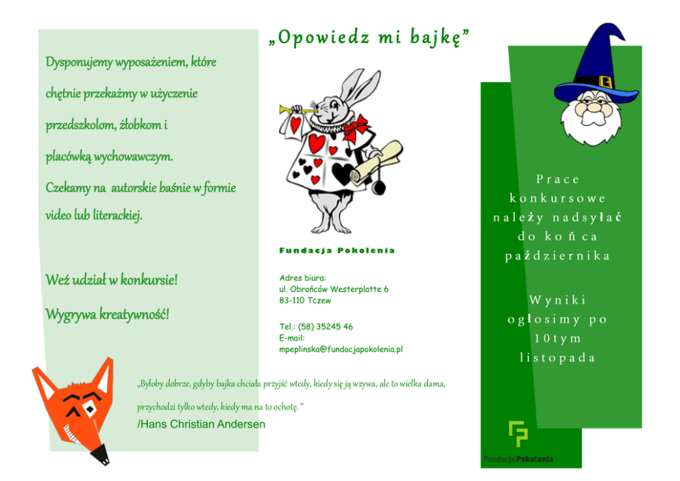 „Opowiedz mi bajkę” Dysponujemy wyposażeniem, które chętnie przekażmy w użyczenie przedszkolom, żłobkom i placówką wychowawczym. Czekamy na autorskie baśnie w formie video lub literackiej. ż Fundacja Pokolenia Weź udział w konkursie! Wygrywa kreatywność! Adres biura: ul. Obrońców Westerplatte 6 83-110 Tczew Tel.: (58) 35245 46 E-mail: [email protected] „Byłoby dobrze, gdyby bajka chciała przyjść wtedy, kiedy się ją wzywa, ale to wielka dama, przychodzi tylko wtedy, kiedy ma na to ochotę. ” /Hans Christian Andersen ź ł ł ć Regulamin: 1. Zgłoszenia i prace konkursowe należy nadsyłać drogą mailową na adres: [email protected]. 2. Konkurs trwa do 31 października 2015 roku (włącznie) 3. Projekt powinien zaangażować do współpracy dzieci i dorosłych. 4. Nagrodą w konkursie są meble, zabawki i wyposażenie udostępnione przez Fundację Pokolenia na podstawie umowy o użyczenie. 5. Sposób przedstawienia i tematyka bajki są dowolne. Może być o krótki utwór literacki, film video itp.. 6. W przypadku filmu jego długość nie powinna przekraczać 5 min. 7. Zalecanym formatem pliku video jest MP4. Jako zgłoszenie można również wysyłać link z adresem strony internetowej, na której umieszczono pracę konkursową. 8. Nagrodę zdobędą te placówki, które najkreatywniej zinterpretują zadanie konkursowe. Decyzję podejmie Komisja. 9. Wszelkie kwestie budzące wątpliwości, nie objęte regulaminem, rozstrzygają organizatorzy. Pytania prosimy kierować na e mail: [email protected]