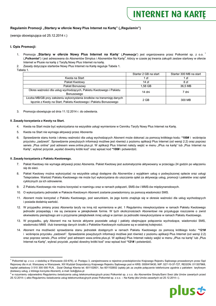 Regulamin Promocji „Startery w ofercie Nowy Plus Internet na Kartę” („Regulamin”) (wersja obowiązująca od 25.12.2014 r.) I. Opis Promocji: Promocja „Startery w ofercie Nowy Plus Internet na Kartę” („Promocja”) jest organizowana przez Polkomtel sp. z o.o. 1 („Polkomtel”) i jest adresowana do Abonentów Simplus i Abonentów Na Kartę2, którzy w czasie jej trwania zakupili zestaw startowy w ofercie Internet w Plusie na kartę z Taryfą Nowy Plus Internet na kartę. 2. Zasady dotyczące starterów Nowy Plus Internet na Kartę reguluje Tabela 1. Tabela 1. Starter 2 GB na start Starter 300 MB na start Kwota na Start 1 zł 1 zł Pakiet Kwotowy 14 zł 8 zł Pakiet Bonusowy 1,58 GB 36,5 MB Okres ważności dla usług wychodzących, Pakietu Kwotowego i Pakietu 14 dni 7 dni Bonusowego Liczba MB/GB przy założeniu wykorzystania środków na transmisję danych 2 GB 300 MB łącznie z Kwoty na Start, Pakietu Kwotowego i Pakietu Bonusowego 1. 3. Promocja obowiązuje od dnia 11.12.2014 r. do odwołania. II. Zasady korzystania z Kwoty na Start. 4. Kwota na Start może być wykorzystana na wszystkie usługi wymienione w Cenniku Taryfy Nowy Plus Internet na Kartę. 5. Kwota na Start nie wymaga aktywacji przez Abonenta 6. Sprawdzenie stanu konta i okresu ważności dla usług wychodzących Abonent może dokonać za pomocą krótkiego kodu: *100# i wciśnięcia przycisku „zadzwoń”. Sprawdzenie powyższych informacji możliwe jest również z poziomu aplikacji Plus Internet (od wersji 2.2) oraz poprzez serwis „Plus online” pod adresem www.online.plus.pl. W aplikacji Plus Internet należy wejść w menu „iPlus na kartę” lub „Plus Internet na Kartę”, wybrać przycisk „wysłać dowolny krótki kod” oraz wpisać kod *100# i potwierdzić. II. Zasady korzystania z Pakietu Kwotowego. 7. Pakiet Kwotowy nie wymaga aktywacji przez Abonenta. Pakiet Kwotowy jest automatycznie aktywowany w przeciągu 24 godzin po włączeniu się do sieci. 8. Pakiet Kwotowy można wykorzystać na wszystkie usługi dostępne dla Abonentów z wyjątkiem usług o podwyższonej opłacie oraz usługi Teleprzelew. Wartość Pakietu Kwotowego nie może być wykorzystana do uiszczania opłat za aktywację usług, promocji i pakietów oraz opłat cyklicznych za ich odnowienie. 9. Z Pakietu Kwotowego nie można korzystać w roamingu oraz w ramach połączeń, SMS-ów i MMS-ów międzynarodowych. 10. O wykorzystaniu jednostek w Pakiecie Kwotowym Abonent zostanie powiadomiony za pomocą wiadomości SMS. 11. Abonent może korzystać z Pakietu Kwotowego, pod warunkiem, że jego konto znajduje się w okresie ważności dla usług wychodzących i posiada dodatnią wartość. 12. W przypadku zmiany przez Abonenta taryfy na inną niż wymieniona w pkt. 1 Regulaminu niewykorzystane w ramach Pakietu Kwotowego jednostki przepadają i nie są zwracane w jakiejkolwiek formie. W tych okolicznościach Abonentowi nie przysługuje roszczenie o zwrot ekwiwalentu pieniężnego ani o przyznanie jakiejkolwiek innej usługi w zamian za jednostki niewykorzystane w ramach Pakietu Kwotowego. 13. W przypadku, gdy Abonent ma na koncie aktywne pozostałe usługi i pakiety obejmujące połączenia wychodzące, wiadomości SMS, wiadomości MMS i/lub transmisję danych środki z Pakietów Kwotowych rozliczane są w ostatniej kolejności. 14. Abonent ma możliwość sprawdzenia stanu jednostek dostępnych w ramach Pakietu Kwotowego za pomocą krótkiego kodu: *121# i wciśnięcia przycisku „zadzwoń”. Sprawdzenie powyższych informacji możliwe jest również z poziomu aplikacji Plus Internet (od wersji 2.2) oraz poprzez serwis „Plus online” pod adresem www.online.plus.pl. W aplikacji Plus Internet należy wejść w menu „iPlus na kartę” lub „Plus Internet na Kartę”, wybrać przycisk „wysłać dowolny krótki kod” oraz wpisać kod *121# i potwierdzić. 1 Polkomtel sp. z o.o. z siedzibą w Warszawie (02-676), ul. Postępu 3, zarejestrowana w rejestrze przedsiębiorców Krajowego Rejestru Sądowego prowadzonym przez Sąd Rejonowy dla m.st. Warszawy w Warszawie, XIII Wydział Gospodarczy Krajowego Rejestru Sądowego pod nr KRS: 0000419430, NIP: 527-10-37-727, REGON: 011307968, kapitał zakładowy 3 510 300 000 PLN, . Dział Obsługi Klienta tel. 601102601, fax 601102602 (opłaty jak za zwykłe połączenie telefoniczne zgodnie z pakietem taryfowym dostawcy usług, z którego korzysta Abonent), e-mail: [email protected] 2 w rozumieniu odpowiednio Regulaminu świadczenia usług telekomunikacyjnych przez Polkomtel sp. z o.o. dla Abonentów Simplu/Sami Swoi (dla Umów zawartych przed 25.12.2014 r.) albo Regulaminu świadczenia usług telekomunikacyjnych przez Polkomtel sp. z o.o. – Na Kartę (dla Umów zawartych od 25.12.2014 r.). III. Zasady korzystania z Pakietu Bonusowego. 15. Abonent może wykorzystać Pakiet Bonusowy na transmisję danych w technologii LTE3, HSPA+, HSPA, HSDPA, 3G (UMTS), EDGE i GPRS. W technologii HSPA+, HSPA, HSDPA, 3G (UMTS), EDGE i GPRS Pakiet Bonusowy obejmuje dostęp do internetu poprzez Punkty Dostępu (APN): WAP (wap, wap.plusgsm.pl, plus); Internet (Internet, www.plusgsm.pl, plus). W technologii HSPA+, HSPA, HSDPA, 3G(UMTS), EDGE, GPRS Pakiet Bonusowy nie obejmuje pakietowej transmisji danych poprzez Punkt Dostępu (APN): video.plusgsm.pl, i za pomocą protokołu (RTSP) („Video Streaming") oraz transmisji danych w ramach usługi MMS, które rozliczane są zgodnie z Cennikiem Taryfy Nowy Plus Internet na Kartę. Transmisja danych w ramach APN wap.plus.pl przy połączeniach z portalem Plus.pl nie pomniejsza jednostek dostępnych w ramach Pakietu Bonusowego a opłaty naliczane są zgodnie z Taryfą Nowy Plus Internet na Kartę bądź regulaminem promocji „Plus.pl najlepszy portal w komórce bez dodatkowych opłat.”. W technologii LTE Pakiet Bonusowy obejmuje dostęp do internetu poprzez Punkt Dostępu (APN): Internet oraz plus. Pakiet Bonusowy obejmuje połączenia transmisji „V