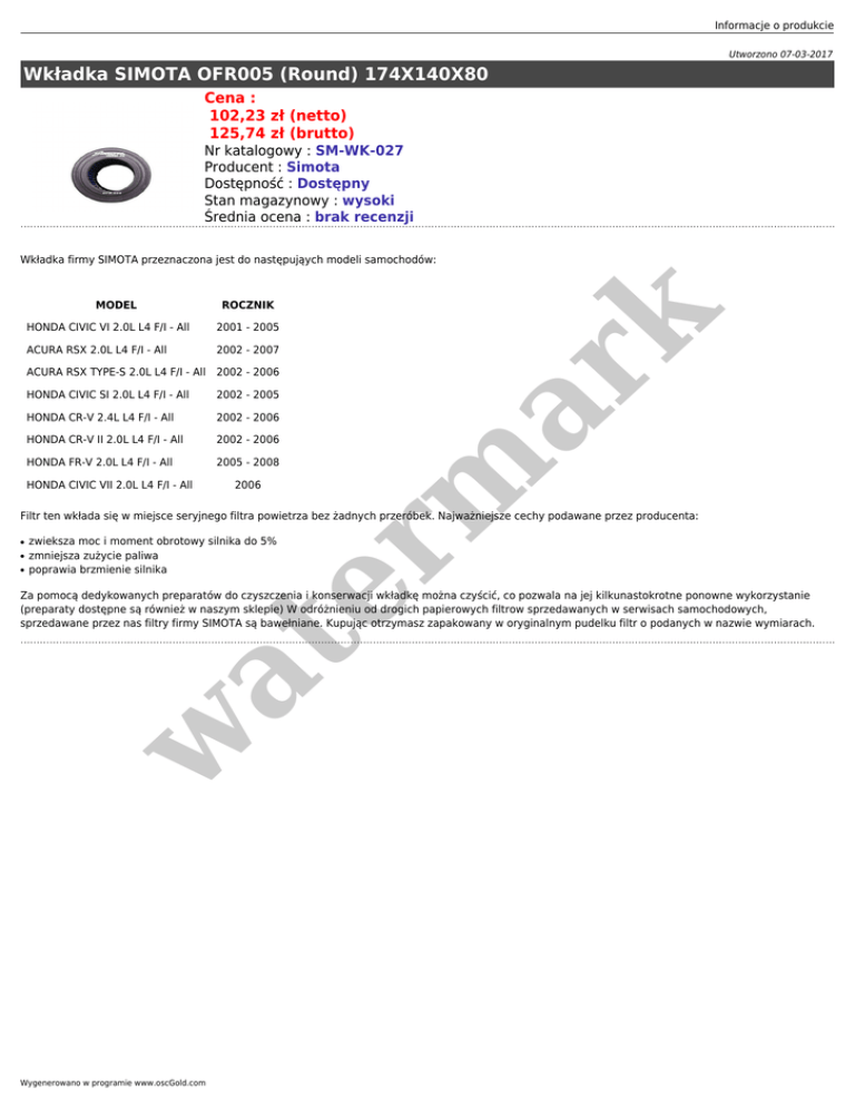 Informacje o produkcie Utworzono 07-03-2017 Wkładka SIMOTA OFR005 (Round) 174X140X80 Cena : 102,23 zł (netto) 125,74 zł (brutto) Nr katalogowy : SM-WK-027 Producent : Simota Dostępność : Dostępny Stan magazynowy : wysoki Średnia ocena : brak recenzji Wkładka firmy SIMOTA przeznaczona jest do następująych modeli samochodów: ROCZNIK er m ar k MODEL HONDA CIVIC VI 2.0L L4 F/I - All 2001 - 2005 ACURA RSX 2.0L L4 F/I - All 2002 - 2007 ACURA RSX TYPE-S 2.0L L4 F/I - All 2002 - 2006 HONDA CIVIC SI 2.0L L4 F/I - All 2002 - 2005 HONDA CR-V 2.4L L4 F/I - All 2002 - 2006 HONDA CR-V II 2.0L L4 F/I - All 2002 - 2006 HONDA FR-V 2.0L L4 F/I - All 2005 - 2008 HONDA CIVIC VII 2.0L L4 F/I - All 2006 Filtr ten wkłada się w miejsce seryjnego filtra powietrza bez żadnych przeróbek. Najważniejsze cechy podawane przez producenta: ● ● ● zwieksza moc i moment obrotowy silnika do 5% zmniejsza zużycie paliwa poprawia brzmienie silnika w at Za pomocą dedykowanych preparatów do czyszczenia i konserwacji wkładkę można czyścić, co pozwala na jej kilkunastokrotne ponowne wykorzystanie (preparaty dostępne są również w naszym sklepie) W odróżnieniu od drogich papierowych filtrow sprzedawanych w serwisach samochodowych, sprzedawane przez nas filtry firmy SIMOTA są bawełniane. Kupując otrzymasz zapakowany w oryginalnym pudelku filtr o podanych w nazwie wymiarach. Wygenerowano w programie www.oscGold.com