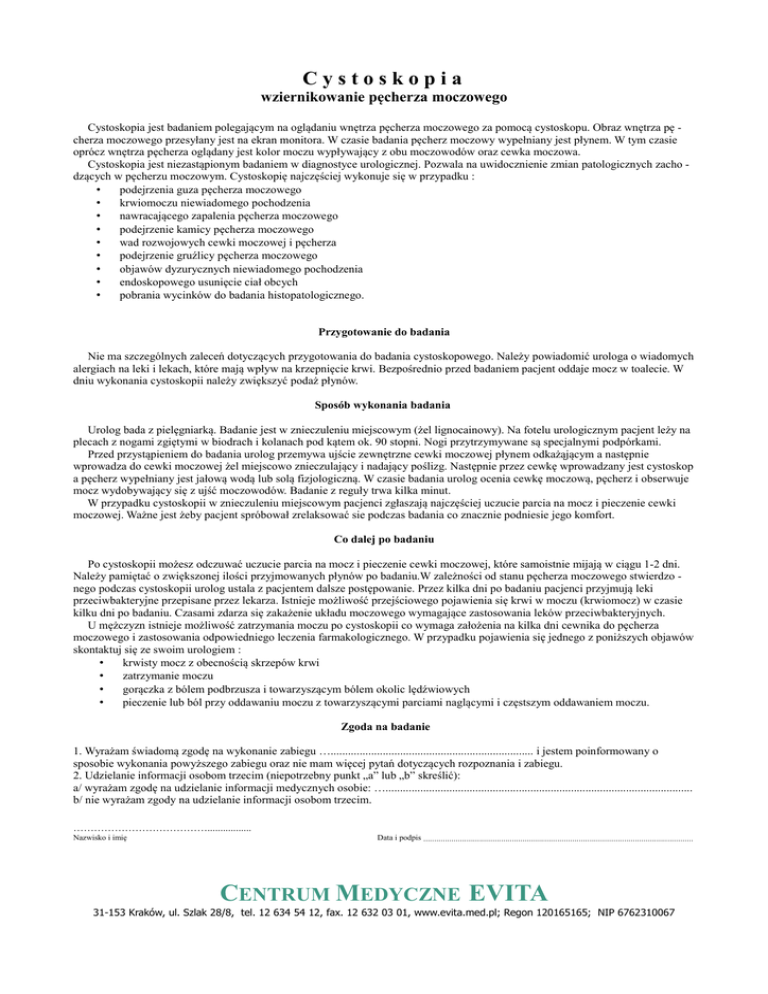 Cystoskopia wziernikowanie pęcherza moczowego Cystoskopia jest badaniem polegającym na oglądaniu wnętrza pęcherza moczowego za pomocą cystoskopu. Obraz wnętrza pę cherza moczowego przesyłany jest na ekran monitora. W czasie badania pęcherz moczowy wypełniany jest płynem. W tym czasie oprócz wnętrza pęcherza oglądany jest kolor moczu wypływający z obu moczowodów oraz cewka moczowa. Cystoskopia jest niezastąpionym badaniem w diagnostyce urologicznej. Pozwala na uwidocznienie zmian patologicznych zacho dzących w pęcherzu moczowym. Cystoskopię najczęściej wykonuje się w przypadku : • podejrzenia guza pęcherza moczowego • krwiomoczu niewiadomego pochodzenia • nawracającego zapalenia pęcherza moczowego • podejrzenie kamicy pęcherza moczowego • wad rozwojowych cewki moczowej i pęcherza • podejrzenie gruźlicy pęcherza moczowego • objawów dyzurycznych niewiadomego pochodzenia • endoskopowego usunięcie ciał obcych • pobrania wycinków do badania histopatologicznego. Przygotowanie do badania Nie ma szczególnych zaleceń dotyczących przygotowania do badania cystoskopowego. Należy powiadomić urologa o wiadomych alergiach na leki i lekach, które mają wpływ na krzepnięcie krwi. Bezpośrednio przed badaniem pacjent oddaje mocz w toalecie. W dniu wykonania cystoskopii należy zwiększyć podaż płynów. Sposób wykonania badania Urolog bada z pielęgniarką. Badanie jest w znieczuleniu miejscowym (żel lignocainowy). Na fotelu urologicznym pacjent leży na plecach z nogami zgiętymi w biodrach i kolanach pod kątem ok. 90 stopni. Nogi przytrzymywane są specjalnymi podpórkami. Przed przystąpieniem do badania urolog przemywa ujście zewnętrzne cewki moczowej płynem odkażąjącym a następnie wprowadza do cewki moczowej żel miejscowo znieczulający i nadający poślizg. Następnie przez cewkę wprowadzany jest cystoskop a pęcherz wypełniany jest jałową wodą lub solą fizjologiczną. W czasie badania urolog ocenia cewkę moczową, pęcherz i obserwuje mocz wydobywający się z ujść moczowodów. Badanie z reguły trwa kilka minut. W przypadku cystoskopii w znieczuleniu miejscowym pacjenci zgłaszają najczęściej uczucie parcia na mocz i pieczenie cewki moczowej. Ważne jest żeby pacjent spróbował zrelaksować sie podczas badania co znacznie podniesie jego komfort. Co dalej po badaniu Po cystoskopii możesz odczuwać uczucie parcia na mocz i pieczenie cewki moczowej, które samoistnie mijają w ciągu 1-2 dni. Należy pamiętać o zwiększonej ilości przyjmowanych płynów po badaniu.W zależności od stanu pęcherza moczowego stwierdzo nego podczas cystoskopii urolog ustala z pacjentem dalsze postępowanie. Przez kilka dni po badaniu pacjenci przyjmują leki przeciwbakteryjne przepisane przez lekarza. Istnieje możliwość przejściowego pojawienia się krwi w moczu (krwiomocz) w czasie kilku dni po badaniu. Czasami zdarza się zakażenie układu moczowego wymagające zastosowania leków przeciwbakteryjnych. U mężczyzn istnieje możliwość zatrzymania moczu po cystoskopii co wymaga założenia na kilka dni cewnika do pęcherza moczowego i zastosowania odpowiedniego leczenia farmakologicznego. W przypadku pojawienia się jednego z poniższych objawów skontaktuj się ze swoim urologiem : • krwisty mocz z obecnością skrzepów krwi • zatrzymanie moczu • gorączka z bólem podbrzusza i towarzyszącym bólem okolic lędźwiowych • pieczenie lub ból przy oddawaniu moczu z towarzyszącymi parciami naglącymi i częstszym oddawaniem moczu. Zgoda na badanie 1. Wyrażam świadomą zgodę na wykonanie zabiegu …...................................................................... i jestem poinformowany o sposobie wykonania powyższego zabiegu oraz nie mam więcej pytań dotyczących rozpoznania i zabiegu. 2. Udzielanie informacji osobom trzecim (niepotrzebny punkt „a” lub „b” skreślić): a/ wyrażam zgodę na udzielanie informacji medycznych osobie: ….......................................................................................................... b/ nie wyrażam zgody na udzielanie informacji osobom trzecim. …………………………………................. Nazwisko i imię Data i podpis ............................................................................................................................. CENTRUM MEDYCZNE EVITA 31-153 Kraków, ul. Szlak 28/8, tel. 12 634 54 12, fax. 12 632 03 01, www.evita.med.pl; Regon 120165165; NIP 6762310067