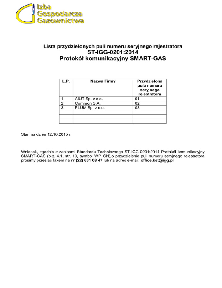 Lista przydzielonych puli numeru seryjnego rejestratora ST-IGG-0201:2014 Protokół komunikacyjny SMART-GAS L.P. 1. 2. 3. Nazwa Firmy AIUT Sp. z o.o. Common S.A. PLUM Sp. z o.o. Przydzielona pula numeru seryjnego rejestratora 01 02 03 Stan na dzień 12.10.2015 r. Wniosek, zgodnie z zapisami Standardu Technicznego ST-IGG-0201:2014 Protokół komunikacyjny SMART-GAS (pkt. 4.1, str. 10, symbol WP_SN),o przydzielenie puli numeru seryjnego rejestratora prosimy przesłać faxem na nr (22) 631 08 47 lub na adres e-mail: [email protected]