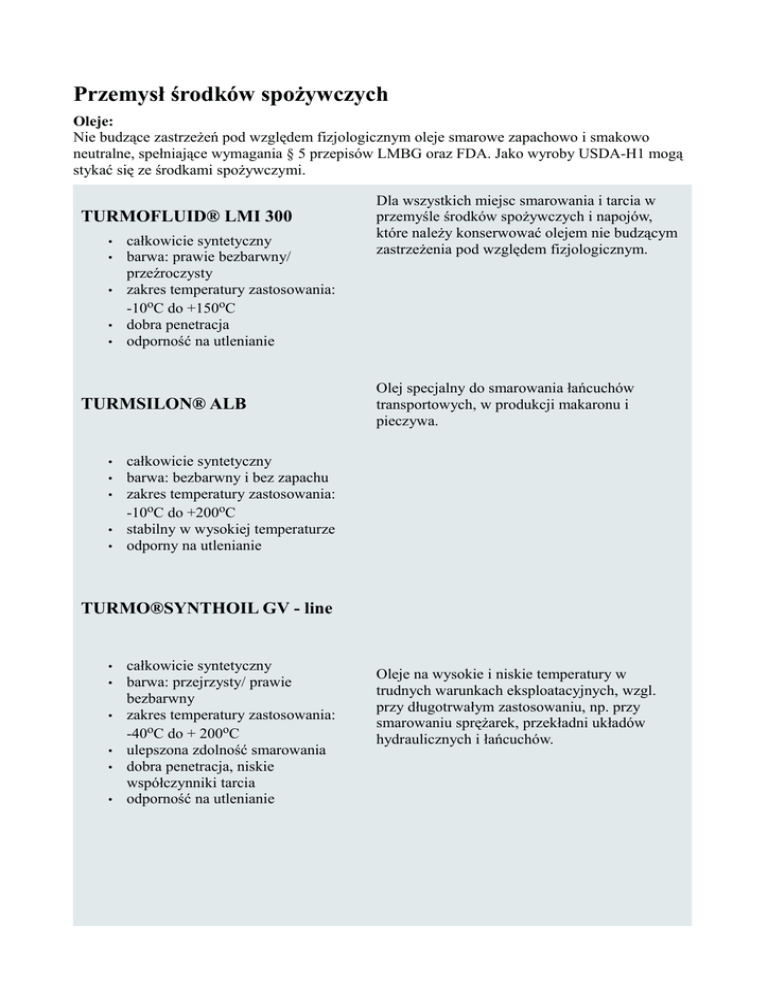 Przemysł środków spożywczych Oleje: Nie budzące zastrzeżeń pod względem fizjologicznym oleje smarowe zapachowo i smakowo neutralne, spełniające wymagania § 5 przepisów LMBG oraz FDA. Jako wyroby USDA-H1 mogą stykać się ze środkami spożywczymi. TURMOFLUID® LMI 300 • • • • • całkowicie syntetyczny barwa: prawie bezbarwny/ przeźroczysty zakres temperatury zastosowania: -10oC do +150oC dobra penetracja odporność na utlenianie TURMSILON® ALB • • • • • Dla wszystkich miejsc smarowania i tarcia w przemyśle środków spożywczych i napojów, które należy konserwować olejem nie budzącym zastrzeżenia pod względem fizjologicznym. Olej specjalny do smarowania łańcuchów transportowych, w produkcji makaronu i pieczywa. całkowicie syntetyczny barwa: bezbarwny i bez zapachu zakres temperatury zastosowania: -10oC do +200oC stabilny w wysokiej temperaturze odporny na utlenianie TURMO®SYNTHOIL GV - line • • • • • • całkowicie syntetyczny barwa: przejrzysty/ prawie bezbarwny zakres temperatury zastosowania: -40oC do + 200oC ulepszona zdolność smarowania dobra penetracja, niskie współczynniki tarcia odporność na utlenianie Oleje na wysokie i niskie temperatury w trudnych warunkach eksploatacyjnych, wzgl. przy długotrwałym zastosowaniu, np. przy smarowaniu sprężarek, przekładni układów hydraulicznych i łańcuchów. TURMO®SYNTH VG - line • • • półsyntetyczny barwa: przejrzysty/ prawie bezbarwny zakres temperatury zastosowania: -10oC do + 120oC Oleje o zastosowaniu uniwersalnym w przemyśle środków spożywczych w miejscach tarcia wymagających smarowania olejem, np. w układach hydraulicznych, przekładniach, łożyskach, łańcuchach, wrzecionach, podnośnikach i przegubach. Emulsja: ELEFANTENMILCH • • • • biodegradacyjne barwa: biała rozpuszcza cukier gotowy do użycia Ta emulsja jest specjalnym środkiem znajdującym zastosowanie przeważnie w przemyśle cukierniczym, np. w zawijarkach i pakowarkach, tableciarkach i zawijarkach staniolowych, dźwigniach wahliwych, przegubach, dźwignikach, wrzecionach, łańcuchach i kleszczach. Smary stałe: Nie budzące zastrzeżeń pod względem fizjologicznym oleje smarowe zapachowo i smakowo neutralne, spełniające wymagania § 5 przepisów LMBG i FDA. Jako wyroby USDA-H1 mogą stykać się ze środkami spożywczymi. TURMO®SYNTHGREASE Szereg AL • • • • • • półsyntetyczny barwa: jasny/ przeźroczysty zakres temperatury zastosowania: -30oC do +150oC odporny na zimną i gorącą wodę dobrze przyczepny dobrze przemieszczający się w instalacjach centralnego smarowania Te smary spełniły oczekiwania w łożyskowaniach tocznych i ślizgowych, prowadnicach, szynach ślizgowych, prowadnicach walcowych, rolkach bieżnych, tarczach krzywkowych, wieńcach zębatych, zębatkach w napełniarkach i zamykarkach, płuczkach, urządzeniach transportowych i sortowniczych, tłoczniach, jak również w rurociągach i hakach rolkowych ubojni. Smary jednolite dla wszystkich miejsca smarowania w przemyśle napojów, w mleczarniach, serowarniach, piecach ubojni, wędliniarniach i zakładach mięsnych, dla przemysłu rybnego, cukierniczego, piekarniczego i makaronowego, dla przetwórni drobiu, wytwórni konserw, środków spożywczych, mrożonek, dla dużych kuchni oraz palarni kawy. TURMO®SYNTHGREASE Szereg ALN • • • • • • • • całkowicie syntetyczny barwa: żółtawa zakres temperatury zastosowania: -30oC do +220oC odporny na zimną i gorącą wodę oraz na parę termicznie wysoko odporny dobra penetracja, niskie współczynniki tarcia dobra ochrona przed zużyciem, odporny na utlenianie dobrze przemieszczający się w instalacjach centralnego smarowania Te smary spełniły oczekiwania w łożyskowaniach tocznych i ślizgowych, prowadnicach, szynach ślizgowych, prowadnicach walcowych, rolkach bieżnych, tarczach krzywkowych, wieńcach zębatych, zębatkach w napełniarkach i zamykarkach, płuczkach, urządzeniach transportowych i sortowniczych, tłoczniach, jak również w rurociągach i hakach rolkowych ubojni. Smary jednolite dla wszystkich miejsca smarowania w przemyśle napojów, w mleczarniach, serowarniach, piecach ubojni, wędliniarniach i zakładach mięsnych, dla przemysłu rybnego, cukierniczego, piekarniczego i makaronowego, dla przetwórni drobiu, wytwórni konserw, środków spożywczych, mrożonek, dla dużych kuchni oraz palarni kawy. TURMO®SYNTHGREASE Szereg W • • • • • • • półsyntetyczny barwa: jasna/ beżowa zakres temperatury zastosowania: -30oC do +120oC odporny na zimną i gorącą wodę oraz na media dobra penetracja dobra ochrona przed zużyciem dobrze przemieszczający się w instalacjach centralnego smarowania TURMO®SYNTH 2000 + 2000 EL • • • • półsyntetyczny barwa: beżowa/ przeźroczysta zakres temperatury zastosowania: -20oC do + 120oC odporny na zimną i gorącą wodę, Smary specjalne dla przemysłu środków spożywczych i napojów. Do zastosowania w napełniaczach beczek, armaturze w piwnicach składowych, instalacjach poboru, uszczelnieniach (kauczuk etylenowopropylenowy - EPDM), jak również w łożyskach tocznych i ślizgowych. • • • parujący lekki dynamicznie, dobrze przyczepny neutralny na pianę piwną odporny na roztwory dezynfekujące TURMSILON® LMI 5000 • • • • • • • • całkowicie syntetyczny barwa: biała zakres temperatury zastosowania: -40oC do +220oC odporny na zimną i gorącą wodę neutralny na pianę piwną odporny na roztwory dezynfekcyjne neutralny na elastomery (NBR, EPDM itd.), z wyjątkiem kauczuku silikonowego Do smarowania armatury piwnej i wyszynkowej, armatury wlotowej napełniacza z uszczelnieniami EPDM, jak również gumowymi, np. uszczelnienia kołnierzowe, membrany i uszczelnienia wargowe. Środki natryskowe: Nie budzące zastrzeżeń pod względem fizjologicznym środki natryskowe zapachowo i smakowo neutralne, spełniające wymagania § 5 pr