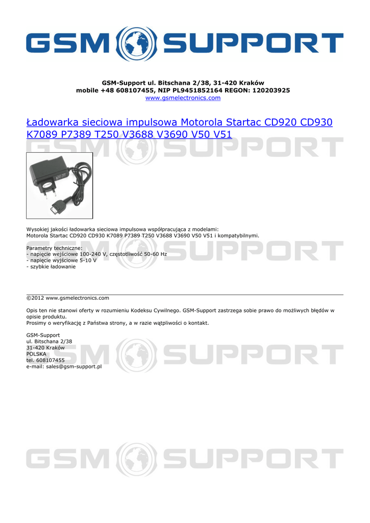 GSM-Support ul. Bitschana 2/38, 31-420 Kraków mobile +48 608107455, NIP PL9451852164 REGON: 120203925 www.gsmelectronics.com Ładowarka sieciowa impulsowa Motorola Startac CD920 CD930 K7089 P7389 T250 V3688 V3690 V50 V51 Wysokiej jakości ładowarka sieciowa impulsowa współpracująca z modelami: Motorola Startac CD920 CD930 K7089 P7389 T250 V3688 V3690 V50 V51 i kompatybilnymi. Parametry techniczne: - napięcie wejściowe 100-240 V, częstotliwość 50-60 Hz - napięcie wyjściowe 5-10 V - szybkie ładowanie ©2012 www.gsmelectronics.com Opis ten nie stanowi oferty w rozumieniu Kodeksu Cywilnego. GSM-Support zastrzega sobie prawo do możliwych błędów w opisie produktu. Prosimy o weryfikację z Państwa strony, a w razie wątpliwości o kontakt. GSM-Support ul. Bitschana 2/38 31-420 Kraków POLSKA tel. 608107455 e-mail: [email protected] Powered by TCPDF (www.tcpdf.org)