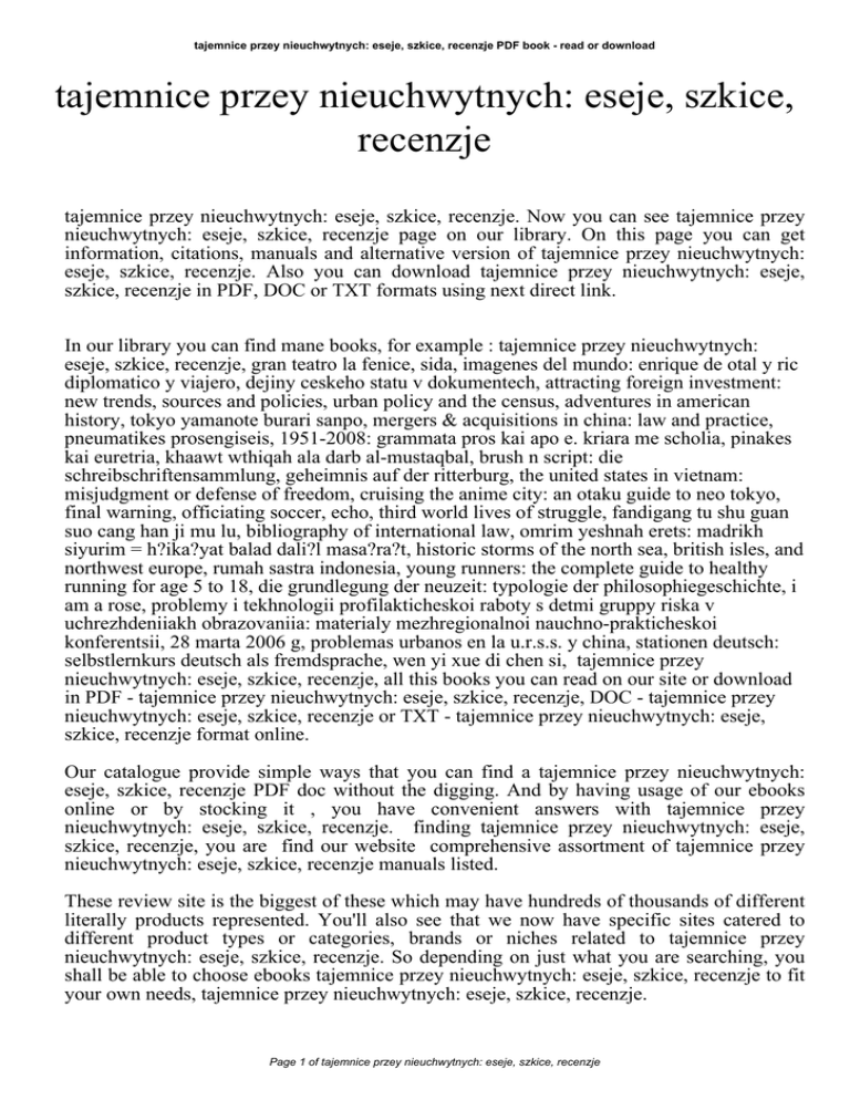 tajemnice przey nieuchwytnych: eseje, szkice, recenzje PDF book - read or download tajemnice przey nieuchwytnych: eseje, szkice, recenzje tajemnice przey nieuchwytnych: eseje, szkice, recenzje. Now you can see tajemnice przey nieuchwytnych: eseje, szkice, recenzje page on our library. On this page you can get information, citations, manuals and alternative version of tajemnice przey nieuchwytnych: eseje, szkice, recenzje. Also you can download tajemnice przey nieuchwytnych: eseje, szkice, recenzje in PDF, DOC or TXT formats using next direct link. In our library you can find mane books, for example : tajemnice przey nieuchwytnych: eseje, szkice, recenzje, gran teatro la fenice, sida, imagenes del mundo: enrique de otal y ric diplomatico y viajero, dejiny ceskeho statu v dokumentech, attracting foreign investment: new trends, sources and policies, urban policy and the census, adventures in american history, tokyo yamanote burari sanpo, mergers & acquisitions in china: law and practice, pneumatikes prosengiseis, 1951-2008: grammata pros kai apo e. kriara me scholia, pinakes kai euretria, khaawt wthiqah ala darb al-mustaqbal, brush n script: die schreibschriftensammlung, geheimnis auf der ritterburg, the united states in vietnam: misjudgment or defense of freedom, cruising the anime city: an otaku guide to neo tokyo, final warning, officiating soccer, echo, third world lives of struggle, fandigang tu shu guan suo cang han ji mu lu, bibliography of international law, omrim yeshnah erets: madrikh siyurim = h?ika?yat balad dali?l masa?ra?t, historic storms of the north sea, british isles, and northwest europe, rumah sastra indonesia, young runners: the complete guide to healthy running for age 5 to 18, die grundlegung der neuzeit: typologie der philosophiegeschichte, i am a rose, problemy i tekhnologii profilakticheskoi raboty s detmi gruppy riska v uchrezhdeniiakh obrazovaniia: materialy mezhregionalnoi nauchno-prakticheskoi konferentsii, 28 marta 2006 g, problemas urbanos en la u.r.s.s. y china, stationen deutsch: selbstlernkurs deutsch als fremdsprache, wen yi xue di chen si, tajemnice przey nieuchwytnych: eseje, szkice, recenzje, all this books you can read on our site or download in PDF - tajemnice przey nieuchwytnych: eseje, szkice, recenzje, DOC - tajemnice przey nieuchwytnych: eseje, szkice, recenzje or TXT - tajemnice przey nieuchwytnych: eseje, szkice, recenzje format online. Our catalogue provide simple ways that you can find a tajemnice przey nieuchwytnych: eseje, szkice, recenzje PDF doc without the digging. And by having usage of our ebooks online or by stocking it , you have convenient answers with tajemnice przey nieuchwytnych: eseje, szkice, recenzje. finding tajemnice przey nieuchwytnych: eseje, szkice, recenzje, you are find our website comprehensive assortment of tajemnice przey nieuchwytnych: eseje, szkice, recenzje manuals listed. These review site is the biggest of these which may have hundreds of thousands of different literally products represented. You'll also see that we now have specific sites catered to different product types or categories, brands or niches related to tajemnice przey nieuchwytnych: eseje, szkice, recenzje. So depending on just what you are searching, you shall be able to choose ebooks tajemnice przey nieuchwytnych: eseje, szkice, recenzje to fit your own needs, tajemnice przey nieuchwytnych: eseje, szkice, recenzje. Page 1 of tajemnice przey nieuchwytnych: eseje, szkice, recenzje
