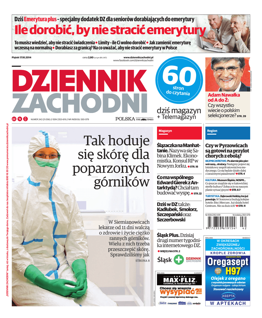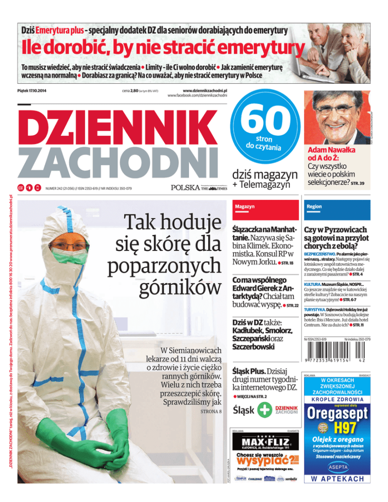 DziśEmerytura plus– specjalny dodatek DZ dla seniorów dorabiających do emerytury Ile dorobić, by nie stracić emerytury To musisz wiedzieć, aby nie stracić świadczenia a Limity – ile Ci wolno dorobić a Jak zamienić emeryturę wczesną na normalną a Dorabiasz za granicą? Na co uważać, aby nie stracić emerytury w Polsce cena 2,80 (w tym 8% VAT) www.dziennikzachodni.pl www.facebook.com/dziennikzachodni 60 stron do czytania dziś magazyn + Telemagazyn Magazyn Tak hoduje się skórę dla poparzonych górników Adam Nawałka od A do Ż: Czy wszystko wiecie o polskim selekcjonerze? STR. 39 Region ŚlązaczkanaManhat- Czy w Pyrzowicach tanie.Nazywa się Sa- są gotowi na przylot bina Klimek. Ekono- chorych z ebolą? mistka. Konsul RP w BEZPIECZEŃSTWO. PoalarmiejakopierNastępny pojawi się Nowym Jorku. a STR.18 wsiruszą...strażacy. lotniskowy zespół ratownictwa meComawspólnego EdwardGierekzAntarktydą?Chciałtam budowaćwyspę. a STR.22 DziśwDZtakże: Kadłubek, Smolorz, Szczepańskioraz Szczerbowski W Siemianowicach lekarze od 11 dni walczą o zdrowie i życie ciężko rannych górników. Wielu z nich trzeba przeszczepić skórę. Sprawdziliśmy jak ŚląskPlus.Dzisiaj drugi numer tygodnika internetowego DZ. a WIĘCEJNASTR.2 dycznego. Co się będzie działo dalej z zarażonymi pasażerami? aSTR.4 KULTURA.MuzeumŚląskie,NOSPR... Co jeszcze znajdzie się w katowickiej strefie kultury? Zobaczcie na naszym planie sytuacyjnym! aSTR.6-7 TURYSTYKA.DąbrowskiHolidayInnjuż powstaje.W Sosnowcu budują kolejne hotele: Ibis i Mercure. Już działa hotel Centrum. Nie za dużo ich? a STR.11 NrISSN2353-619 REKLAMA Nrindeksu350-079 004565417 W OKRESACH ZWIĘKSZONEJ ZACHOROWALNOŚCI KROPLE ZDROWIA STRONA 8 REKLAMA FOT. KAROL GRUSZKA „DZIENNIK ZACHODNI” taniej, niż w kiosku, z dostawą do Twojego domu. Zadzwoń do nas: bezpłatna infolinia 800 16 30 20 www.prenumerata.dziennikzachodni.pl NUMER 242 (21.056) // ISSN 2353-619 // NR INDEKSU 350-079 FOT. CZAREK SOKOŁOWSKI/AP Piątek 17.10.2014 014494978 W A P T E K AC H Polska Dziennik Zachodni Piątek, 17 października 2014 02// www.dziennikzachodni.pl Druga strona Ponad połowa Polaków (61 proc.) akceptuje klapsy, większość rodziców przyznaje, że zdarzyło im się je stosować (64 proc.); co czwarty Polak nie wie, że w Polsce obowiązuje zakaz bicia dzieci – dane z badań wykonanych na zlecenie Rzecznika Praw Dziecka Marek Twaróg, redaktor naczelny DZ O co zapytacie kandydata na prezydenta? Jutro w prezencie z „Dziennikiem Zachodnim”: OBRAZEK Z WIZERUNKIEM ŚWIĘTEGO JACKA ODROWĄŻA MAGAZYN RODZINNY a Spotkaniamedyczne: prof.MariaFormińska-Kapuścikzeszpitala Ceglanaowadach wzrokuudzieci. a OdkrywamyŚląskie:Pałac MłodzieżywKatowicach. Z S 4 N MIN Już dziś od godz. 7 najnowsze wydanie Nauczyciel Roku 2014 na www.slaskplus.pl Najpiękniejsze chwile są wtedy, gdy moi uczniowie zdają egzaminy i dostają pracę Rozmowa BarbaraHalska,nauczyciel przedmiotówinformatycznych wZespoleSzkółnr6wJastrzębiu-Zdroju,została„NauczycielemRoku2014”. F rekwencja w ostatnich wyborach samorządowych wyniosła w Katowicach mniej niż 40 procent, w innych miastach nie było specjalnie lepiej, choć zdarzały się wyjątki. Generalnie tam, gdzie sprawa była otwarta i mieszkańcy czuli, że każdy głos może przesądzić o czyimś zwycięstwie, lokale wyborcze nie świeciły pustkami. A w Katowicach – jak wiadomo – sytuacja była zupełnie inna. Piotr Uszok od początku miał wygrać, więc pogodzeni z tym i najwyraźniej zadowoleni z tego faktu wyborcy wybrali częściej niedzielne nicnierobienie niż obowiązki demokracji. a miesiąc, pierwszy raz od lat, będzie inaczej. Będzie walka o każdy głos, bo też każdy z liczących się kandydatów ma swoje przewagi: jeden dobre nazwisko, drugi znane nazwisko, trzeci sprawność oratorską, czwarty umiejętności rozgrywania partyjnych szachów, piąty to, szósty tamto. I każdy ma też swoje wady: dobre nazwisko, znane nazwisko, sprawność i tak dalej… W zależności od tego, kto ocenia. pecyfika naszej aglomeracji powoduje, że choć ten i ów zagłosuje – chwała Bogu – na swojego kandydata w Bytomiu, Chorzowie, Sosnowcu, Rudzie Śląskiej, Rybniku czy Mikołowie, to jednak wynik elekcji w Katowicach jest również niezwykle ważny. Katowice to miasto katowiczan, ale to też centrum aglomeracji i miasto wszystkich, którzy tu pracują, uczą się, załatwiają sprawy, przyjeżdżają na koncerty, zakupy i kawę. listopada w kinoteatrze Rialto „Dziennik Zachodni” zorganizuje debatę prezydencką z kandydatami do zaszczytnej funkcji prezydenta Katowic. Zamierzamy im zadać również te pytania, które zaproponują nam Państwo, szanowni Czytelnicy. a pytania do kandydatów na prezydenta Katowic czekamy pod adresem mejlowym [email protected] Uprzejmie prosimy o pytania krótkie i celne. a TWITTER: @MAREKTWAROG MAX 15 7 W CZWARTEK NOWE TECHNOLOGIE a Czyste technologie zmieniają Śląsk. a Innowacyjne uczelnie. Tytuł„NauczycielaRoku2014” brzmidumnie.Jakieemocjetowarzyszyłypaniw momencie,w którymusłyszałao swoimzwycięstwie? Jestem młodym nauczycielem, mam dopiero 35 lat, dlatego nie liczyłam na wygraną. Polały się łzy szczęścia. Któremomentysprawiają,żenauczycieljużwie,iżrobiw życiuto,co sobiewymarzył? Najpiękniejsze chwile są wtedy, kiedy moi uczniowie zdają egzaminy i znajdują pracę w zawodzie. Mój uczeń po 4 latach od skończenia szkoły przyszedł do mnie i poinformował, że zaczyna pracę w firmie IBM, w jednym z najstarszych koncernów informatycznych. I że jest mi wdzięczny za to, iż dałam mu serwer do ręki i nie bałam się, że on mi coś zniszczy. Pamiętam, jak stanął przed moimi uczniami i powiedział: „Słuchajcie, uczcie się, bo o wielu rzeczach, o których pani Halska mówi, nie ma na studiach!”. Sawka komentuje FOT. ARC. Od redaktora DZISIAJ b Barbara Halska otrzymała tytuł „Nauczyciela Roku 2014