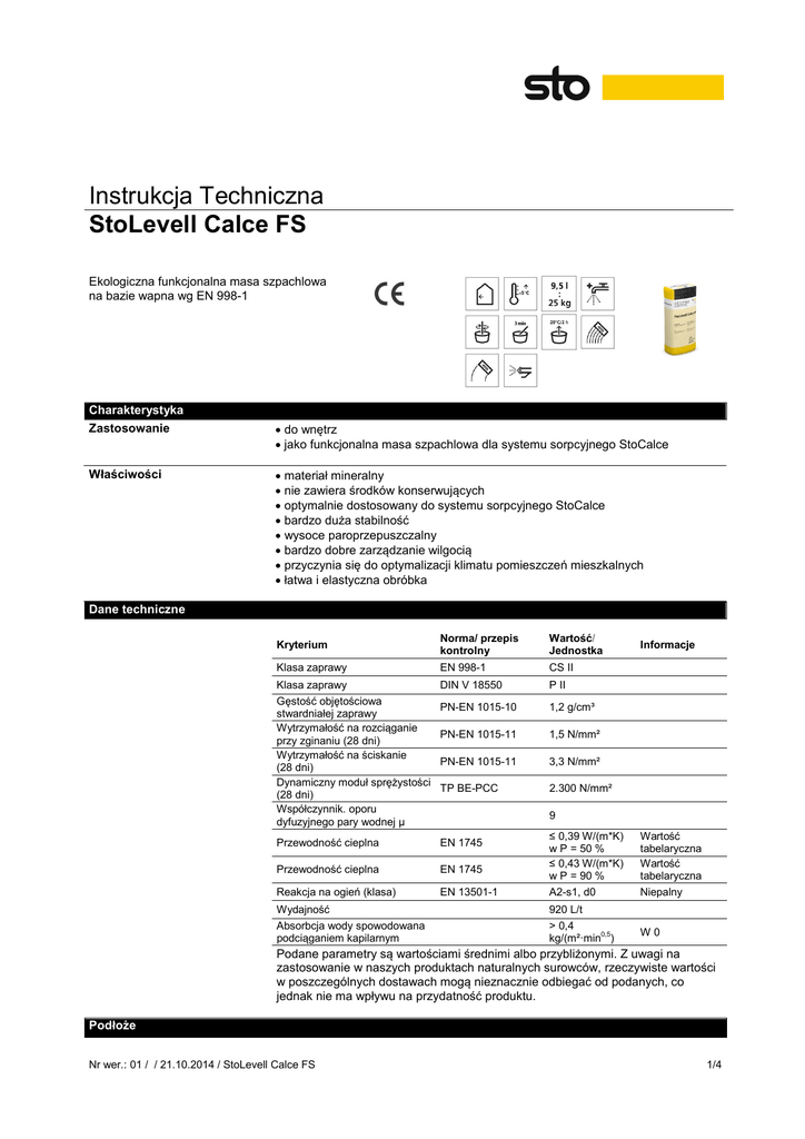Instrukcja Techniczna StoLevell Calce FS Ekologiczna funkcjonalna masa szpachlowa na bazie wapna wg EN 998-1 Charakterystyka Zastosowanie Właściwości • do wnętrz • jako funkcjonalna masa szpachlowa dla systemu sorpcyjnego StoCalce • materiał mineralny • nie zawiera środków konserwujących • optymalnie dostosowany do systemu sorpcyjnego StoCalce • bardzo duża stabilność • wysoce paroprzepuszczalny • bardzo dobre zarządzanie wilgocią • przyczynia się do optymalizacji klimatu pomieszczeń mieszkalnych • łatwa i elastyczna obróbka Dane techniczne Kryterium Norma/ przepis kontrolny Wartość/ Jednostka Klasa zaprawy EN 998-1 CS II Klasa zaprawy Gęstość objętościowa stwardniałej zaprawy Wytrzymałość na rozciąganie przy zginaniu (28 dni) Wytrzymałość na ściskanie (28 dni) Dynamiczny moduł sprężystości (28 dni) Współczynnik. oporu dyfuzyjnego pary wodnej µ DIN V 18550 P II PN-EN 1015-10 1,2 g/cm³ PN-EN 1015-11 1,5 N/mm² PN-EN 1015-11 3,3 N/mm² TP BE-PCC 2.300 N/mm² Przewodność cieplna EN 1745 Przewodność cieplna EN 1745 Reakcja na ogień (klasa) EN 13501-1 Wydajność Absorbcja wody spowodowana podciąganiem kapilarnym Informacje 9 ≤ 0,39 W/(m*K) w P = 50 % ≤ 0,43 W/(m*K) w P = 90 % A2-s1, d0 920 L/t > 0,4 kg/(m²min0,5) Wartość tabelaryczna Wartość tabelaryczna Niepalny W0 Podane parametry są wartościami średnimi albo przybliżonymi. Z uwagi na zastosowanie w naszych produktach naturalnych surowców, rzeczywiste wartości w poszczególnych dostawach mogą nieznacznie odbiegać od podanych, co jednak nie ma wpływu na przydatność produktu. Podłoże Nr wer.: 01 / / 21.10.2014 / StoLevell Calce FS 1/4 Instrukcja Techniczna StoLevell Calce FS Wymagania Podłoże musi być solidne, równe, suche, wytrzymałe oraz wolne od tłuszczu i pyłu. Wilgotne lub niecałkowicie związane podłoże może prowadzić do uszkodzeń kolejnych powłok, powodując powstawanie pęcherzy i pęknięć. Jako podłoże pod małoformatowe płytki ceramiczne w kuchniach domowych i łazienkach. Na wszystkich podłożach z gipsu, takich jak np. płyty gipsowo-kartonowe, płyty gipsowo-włóknowe lub tynki gipsowe itp. niezbędna jest powłoka pośrednia StoPrep In. Dla zachowania funkcjonalności należy przestrzegać także zasad ochrony przed działaniem wilgoci i ciepła dla całej struktury ściany. Przygotowania Sprawdzić poprawność naniesienia i nośność poprzednich powłok. Usunąć powłoki o niedostatecznej nośności. Jeśli to konieczne, należy oczyścić podłoże. Aplikacja Temperatura aplikacji Najniższa temperatura podłoża i powietrza: +5 °C Najwyższa temperatura podłoża i powietrza: +30 °C Czas obróbki Przy +20 °C: ok. 2 godzin Stosunek składników mieszanki 9,5 l wody na 25 kg Przygotowanie materiału Przygotować wodę i dodać suchą zaprawę. Mieszać przez ok. 2 minuty, pozostawić do dojrzewania na ok. 3 minuty i ponownie wymieszać przez ok. 30 sekund. Zużycie Rodzaj zastosowania Zużycie ok. na 1 mm grubości warstwy 1,10 kg/m² Zużycie materiału uzależnione jest między innymi od obróbki, podłoża oraz konsystencji. Podane wartości dotyczące zużycia służą jedynie orientacji. Dokładne wartości dotyczące zużycia należy ustalić na miejscu, dla danego obiektu. Struktura powłok Warstwa zasadnicza w przypadku nowych ścian: StoLevell Calce RP grubość warstwy przy aplikacji jednowarstwowej: ok. 1020 mm w przypadku podłoży gipsowych: patrz punkt podłoże/wymagania na niechłonne podłoża, np. z betonu lub XPS, należy nanieść mostek sczepny, używając środka StoLevell Calce FS i pacy zębatej (8 x 8 mm) W przypadku muru mieszanego i płyt XPS: uzbroić StoLevell Calce RP za pomocą siatki zbrojącej Sto-Glasfasergewebe F (4 x 4 mm). powłoka gruntująca w przypadku renowacji ścian: bez środka gruntującego na istniejące nośne, matowe stare powłoki można bezpośrednio nanosić StoLevell Calce FS Nr wer.: 01 / / 21.10.2014 / StoLevell Calce FS 2/4 Instrukcja Techniczna StoLevell Calce FS grubość warstwy: 3–5 mm jedna warstwa, maks. 8 mm w przypadku kilku warstw Powłoka pośrednia: StoLevell Calce FS grubość warstwy: 3–5 mm jedna warstwa, maks. 8 mm w przypadku kilku warstw w zależności od rodzaju podłoża może być konieczne wykonanie zbrojenia przy użyciu siatki zbrojącej Sto-Glasfasergewebe F (4 x 4 mm) Wyprawa końcowa: Tynk cienkowarstwowy StoCalce Activ K, StoCalce Activ MP Wskazówka: W razie potrzeby można pomalować farbą StoColor Calcetura lub StoColor Sil In bez znacznego ograniczania sorpcji. Aplikacja ręcznie, maszynowo Produkt nanosić ręcznie, pacą stalową lub maszynowo, z zachowaniem podanej grubości warstwy. W przypadku grubości warstwy > 3 mm zaleca się wtopienie siatki zbrojącej StoGlasfasergewebe. Siatka powinna być umiejscowiona w 2/3 grubości warstwy. Styki siatki powinny nachodzić na siebie na 10 cm. Przy otworach konstrukcyjnych (okna, ościeże drzwi itd.) należy wykonać zbrojenie diagonalne. Technika pracy, narzędzia używane do obróbki oraz podłoże mają istotny wpływ na ostateczny efekt. Chronić przed zbyt szybkim odparowaniem i przewiewami. Czyszczenie narzędzi Dostawa Odcień Wyczyścić wodą natychmiast po użyciu. naturalnie biała możliwość barwienia przy użyciu StoLook Punto w stężeniu maks. 20 % W celu zabarwienia zmieszać całą zawartość opakowania ze StoLook Punto F. Dokładność odcienia barwy: Z uwagi na chemiczne i/lub fizyczne procesy wiązania, zachodzące w różnych warunkach lokalizacyjnych, nie gwarantuje się równomiernej dokładności odcienia i braku delikatnych przebarwień powierzchni materiału, szczególnie w przypadkach: a. niejednakowej porowatości podłoża b. różnej wilgotności pokrytego obszaru c. niejednorodności alkalicznej i składu podłoża. Składowanie Warunki magazynowania Przechowywać w suchym miejscu. Okres magazynowania Najwyższa jakość produktu przechowywan