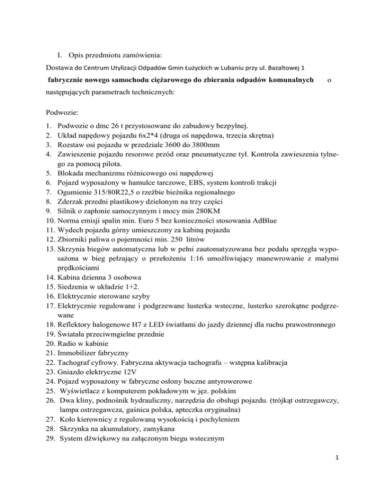 I. Opis przedmiotu zamówienia: Dostawa do Centrum Utylizacji Odpadów Gmin Łużyckich w Lubaniu przy ul. Bazaltowej 1 fabrycznie nowego samochodu ciężarowego do zbierania odpadów komunalnych o następujących parametrach technicznych: Podwozie: 1. 2. 3. 4. Podwozie o dmc 26 t przystosowane do zabudowy bezpylnej. Układ napędowy pojazdu 6x2*4 (druga oś napędowa, trzecia skrętna) Rozstaw osi pojazdu w przedziale 3600 do 3800mm Zawieszenie pojazdu resorowe przód oraz pneumatyczne tył. Kontrola zawieszenia tylnego za pomocą pilota. 5. Blokada mechanizmu różnicowego osi napędowej 6. Pojazd wyposażony w hamulce tarczowe, EBS, system kontroli trakcji 7. Ogumienie 315/80R22,5 o rzeźbie bieżnika regionalnego 8. Zderzak przedni plastikowy dzielonym na trzy części 9. Silnik o zapłonie samoczynnym i mocy min 280KM 10. Norma emisji spalin min. Euro 5 bez konieczności stosowania AdBlue 11. Wydech pojazdu górny umieszczony za kabiną pojazdu 12. Zbiorniki paliwa o pojemności min. 250 litrów 13. Skrzynia biegów automatyczna lub w pełni zautomatyzowana bez pedału sprzęgła wyposażona w bieg pełzający o przełożeniu 1:16 umożliwiający manewrowanie z małymi prędkościami 14. Kabina dzienna 3 osobowa 15. Siedzenia w układzie 1+2. 16. Elektrycznie sterowane szyby 17. Elektrycznie regulowane i podgrzewane lusterka wsteczne, lusterko szerokątne podgrzewane 18. Reflektory halogenowe H7 z LED światłami do jazdy dziennej dla ruchu prawostronnego 19. Światała przeciwmgielne przednie 20. Radio w kabinie 21. Immobilizer fabryczny 22. Tachograf cyfrowy. Fabryczna aktywacja tachografu – wstępna kalibracja 23. Gniazdo elektryczne 12V 24. Pojazd wyposażony w fabryczne osłony boczne antyrowerowe 25. Wyświetlacz z komputerem pokładowym w jęz. polskim 26. Dwa kliny, podnośnik hydrauliczny, narzędzia do obsługi pojazdu. (trójkąt ostrzegawczy, lampa ostrzegawcza, gaśnica polska, apteczka oryginalna) 27. Koło kierownicy z regulowaną wysokością i pochyleniem 28. Skrzynka na akumulatory, zamykana 29. System dźwiękowy na załączonym biegu wstecznym 1 30. Lampa zespolona nad kabiną z podwójnymi światłami ostrzegawczymi i napisem „Zakład Gospodarki i Usług Komunalnych Sp. z o.o. Lubań” 31. Zamontowany przed dokonaniem dostawy mobilny system urządzeń zarządzania i kontroli floty samochodowej, zgodny z użytkowanym przez Zamawiającego systemem tj. System firmy Śledzenie Polska Sp. z o.o. z siedzibą w Zawidowie obejmujący montaż urządzeń w cenie ustalonej w umowie operatorskiej z Zamawiającym (3 000 zł netto) 32. Wymagana homologacja pojazdu kompletnego Zabudowa: 1. zabudowa skrzyniowa z urządzeniem zasypowym tylnym 2. skrzynia ładunkowa o przekroju prostokątnym lub o zbliżonym kształcie, ożebrowana, podłoga płaska 3. pojemność skrzyni ładunkowej winna gwarantować załadunek odpadów biodegradowalnych i komunalnych zmieszanych przy zakładanym stopniu zagęszczenia odpadów ( min. 1:5) co najmniej 100 m³ 4. skrzynia ładunkowa posiadająca drzwi kontrolne na bocznej ścianie 5. objętość kosza zasypowego min. 1,8 m³ 6. Dno wanny zasypowej wykonane z jednego kawałka blachy o podwyższonej odporności na 7. mechanizm zgniatania liniowo – płytowy , czyli tzw. „szufladowy” 8. regulacja ciśnienia ( stopnia zagęszczenia ) w układzie hydraulicznym - przełączenie w kabinie kierowcy na kilka wariantów: surowce wtórne, gabaryty, papier, komunalne 9. uniwersalne urządzenie załadowcze dostosowane do współpracy z pojemnikami od 60 do 1100 litrów 10. dwuetapowy proces podnoszenia pojemnika – I. prostopadłe unoszenie pojemnika II. obrót 11. przełącznik do ustawienia dwóch prędkości podnoszenia zasypu: dla pojemników o pojemności do 240 l i powyżej 12. siłowniki prasy zgniatającej bez wewnętrznych czujników zbliżeniowych i krańcowych, umieszczone na zewnątrz odwłoka 13. króciec odpływowy w wannie załadowczej z kurkiem spustowym 14. kamera wraz z mikrofonem umieszczona z tyłu zabudowy oraz monitor i głośnik zainstalowane w kabinie kierowcy 15. dwa wyłączniki bezpieczeństwa 16. sterownik dla automatycznego cyklu załadunku oraz cyklu pojedynczego 17. sterowanie ręczne 18. sterowanie urządzeniem zasypowym umieszczone po obu stronach odwłoka. 19. sterowanie płytą wypychającą „wysuwanie i wsuwanie” odbywające się, ze stanowiska na zewnątrz z boku skrzyni ładunkowej lub z pulpitu sterowniczego znajdującego się przy siedzeniu w kabinie kierowcy 20. możliwość wykonania auto diagnozy sprawności układu elektrycznego przez urządzenie znajdujące się w kabinie kierowcy 21. włączanie pompy hydraulicznej zabudowy poprzez sprzęgło elektromagnetyczne 2 22. oświetlenie wg obowiązujących obecnie przepisów: światła hamowania, postojowe, kierunkowskazy oraz światło alarmowe typu „kogut” z tyłu pojazdu 23. reflektor roboczy w odwłoku 24. pasy odblaskowe ( ostrzegawcze ) na kabinie i odwłoku 25. błotniki kół tylnych z chlapaczami 26. zbiornik na odcieki z odpadów 27. układ dezynfekcji pojemników – zbiornik na ciecz dezynfekującą o poj. min.25 dm3, wąż o długości min. 10 m z lancą , na zwijaku bębnowym, umieszczony na odwłoku śmieciarki. Praca układu uruchamiana z rękojeści lancy. Zabezpieczenie układu przed zamarznięciem 28. dwa stopnie uchylne wraz z czujnikami, zajęcie stopnia powoduje: - ograniczenie prędkości jazdy do 30 km/godz. - rozłączenie układu ugniatania - uniemożliwienie manewru cofania pojazdu 29. zbiornik na wodę z kranem min. 20l wraz z dozownikiem na płyn do mycia rąk 30. centralne smarowanie (GROENWELD) lub równoważny 31. zabudowa musi odpowiadać wytycznym 89/392 EWG i posiadać znak CE II. Ogólne wymagania dotyczące wszystkich oferowanych urządzeń i maszyn: 1. Pojazd nie może być prototypem i powinny pochodzić z seryjnej produkcji. 2. Pojazd/ maszyna muszą być dopuszczone do obrotu i stosowania w UE (należy dostarczy