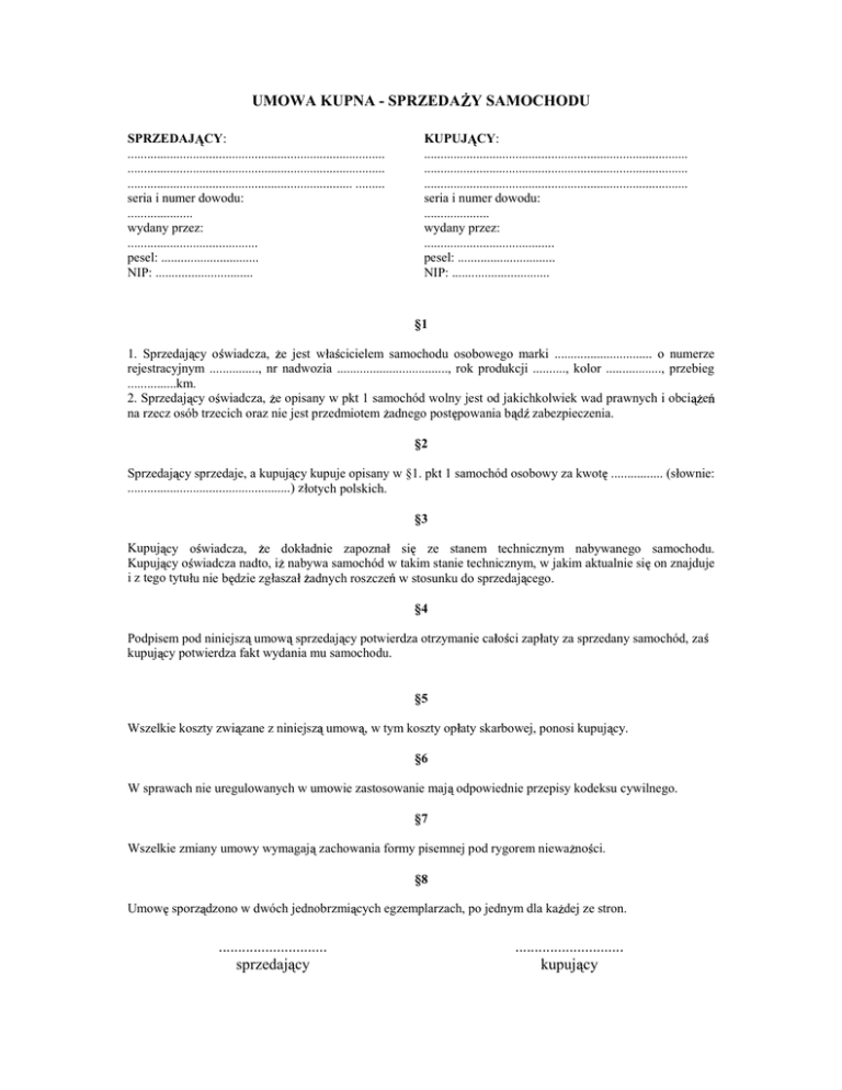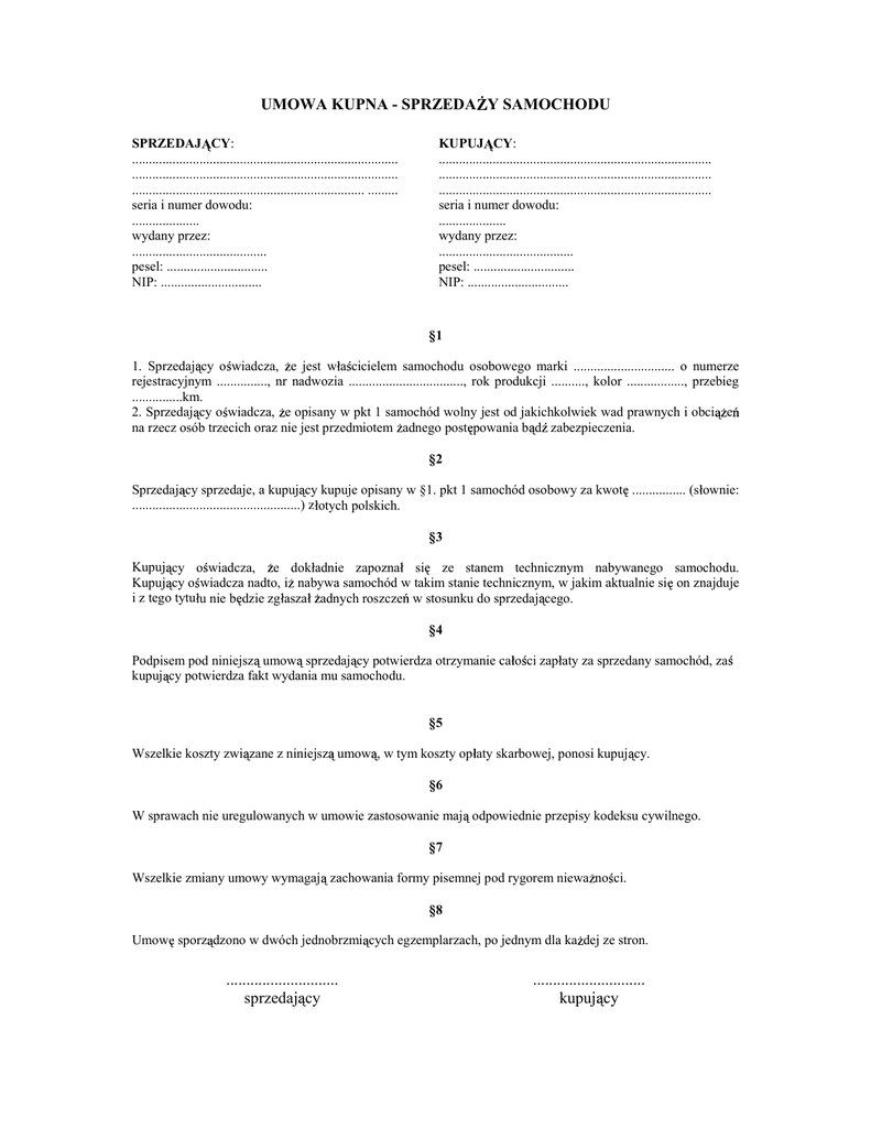 UMOWA KUPNA - SPRZEDA Y SAMOCHODU SPRZEDAJ CY: ............................................................................... ............................................................................... ..................................................................... ......... seria i numer dowodu: .................... wydany przez: ........................................ pesel: .............................. NIP: .............................. KUPUJ CY: ................................................................................. ................................................................................. ................................................................................. seria i numer dowodu: .................... wydany przez: ........................................ pesel: .............................. NIP: .............................. §1 1. Sprzedaj cy o wiadcza, e jest w a cicielem samochodu osobowego marki .............................. o numerze rejestracyjnym ..............., nr nadwozia .................................., rok produkcji .........., kolor ................., przebieg ...............km. 2. Sprzedaj cy o wiadcza, e opisany w pkt 1 samochód wolny jest od jakichkolwiek wad prawnych i obci e na rzecz osób trzecich oraz nie jest przedmiotem adnego post powania b d zabezpieczenia. §2 Sprzedaj cy sprzedaje, a kupuj cy kupuje opisany w §1. pkt 1 samochód osobowy za kwot ................ (s ownie: ..................................................) z otych polskich. §3 Kupuj cy o wiadcza, e dok adnie zapozna si ze stanem technicznym nabywanego samochodu. Kupuj cy o wiadcza nadto, i nabywa samochód w takim stanie technicznym, w jakim aktualnie si on znajduje i z tego tytu u nie b dzie zg asza adnych roszcze w stosunku do sprzedaj cego. §4 Podpisem pod niniejsz umow sprzedaj cy potwierdza otrzymanie ca o ci zap aty za sprzedany samochód, za kupuj cy potwierdza fakt wydania mu samochodu. §5 Wszelkie koszty zwi zane z niniejsz umow , w tym koszty op aty skarbowej, ponosi kupuj cy. §6 W sprawach nie uregulowanych w umowie zastosowanie maj odpowiednie przepisy kodeksu cywilnego. §7 Wszelkie zmiany umowy wymagaj zachowania formy pisemnej pod rygorem niewa no ci. §8 Umow sporz dzono w dwóch jednobrzmi cych egzemplarzach, po jednym dla ka dej ze stron. ............................ sprzedaj cy ............................ kupuj cy